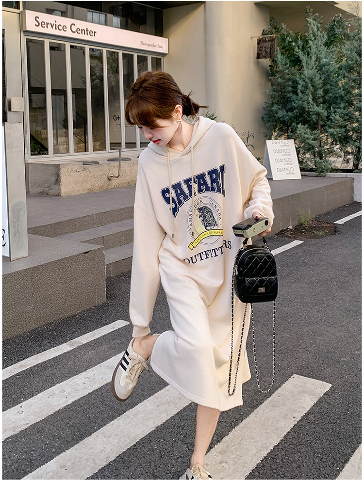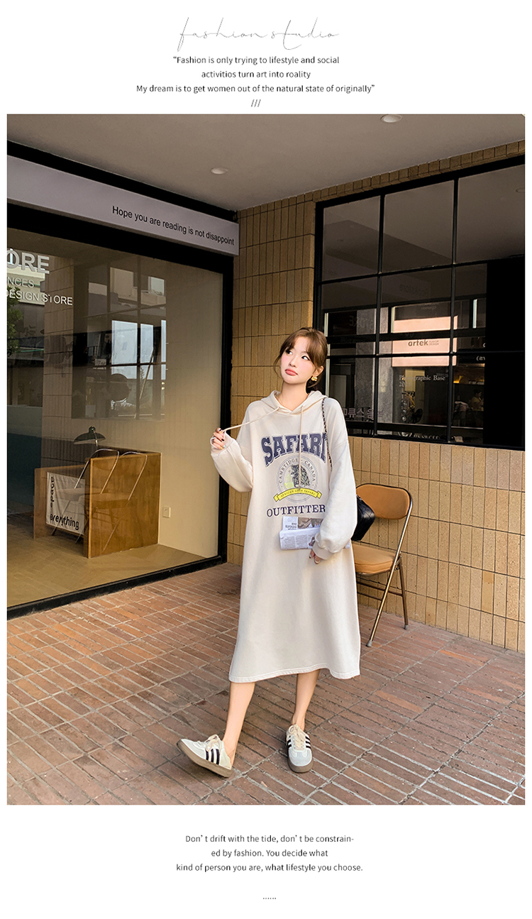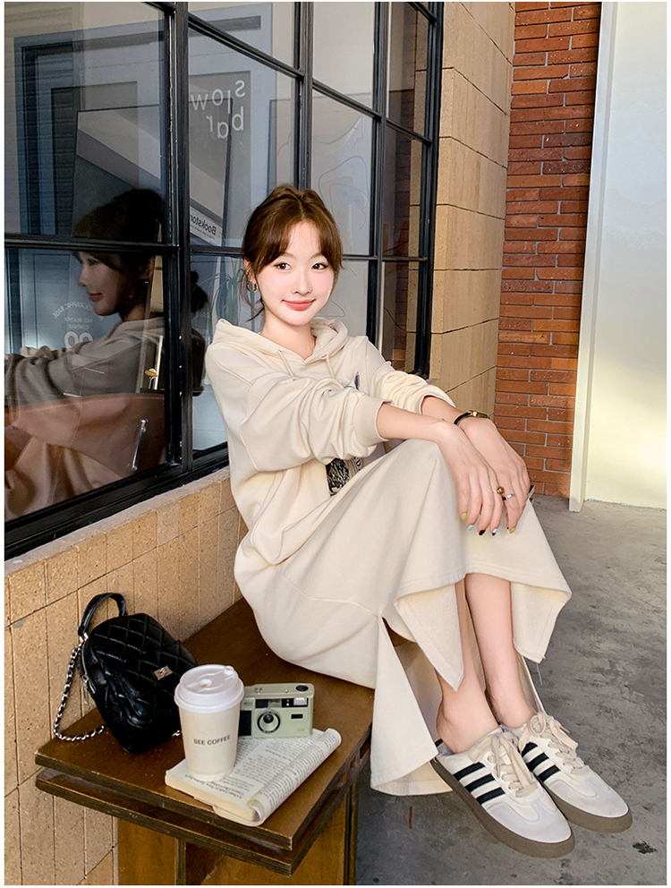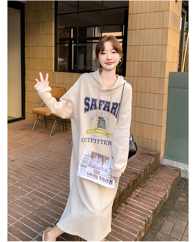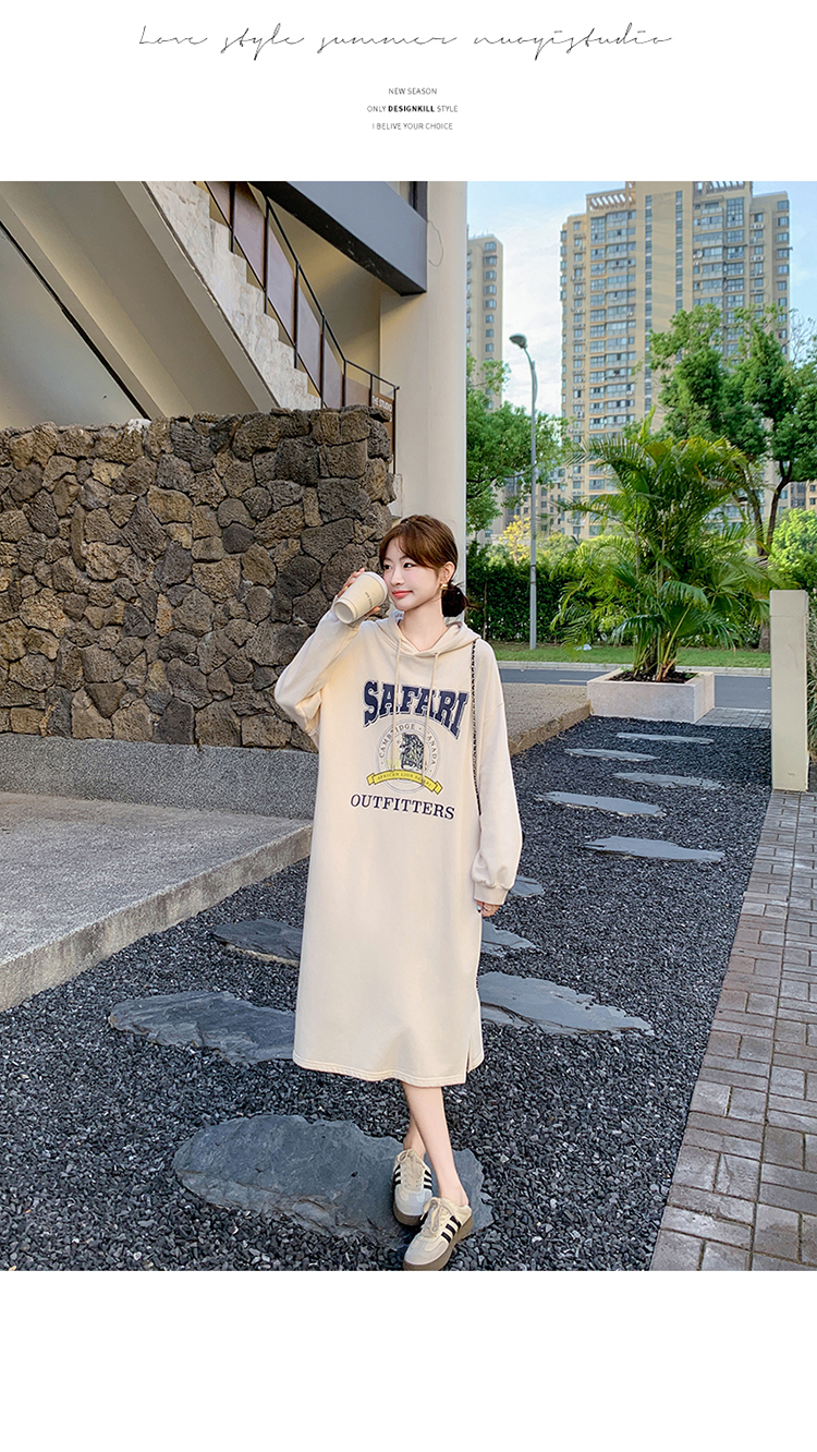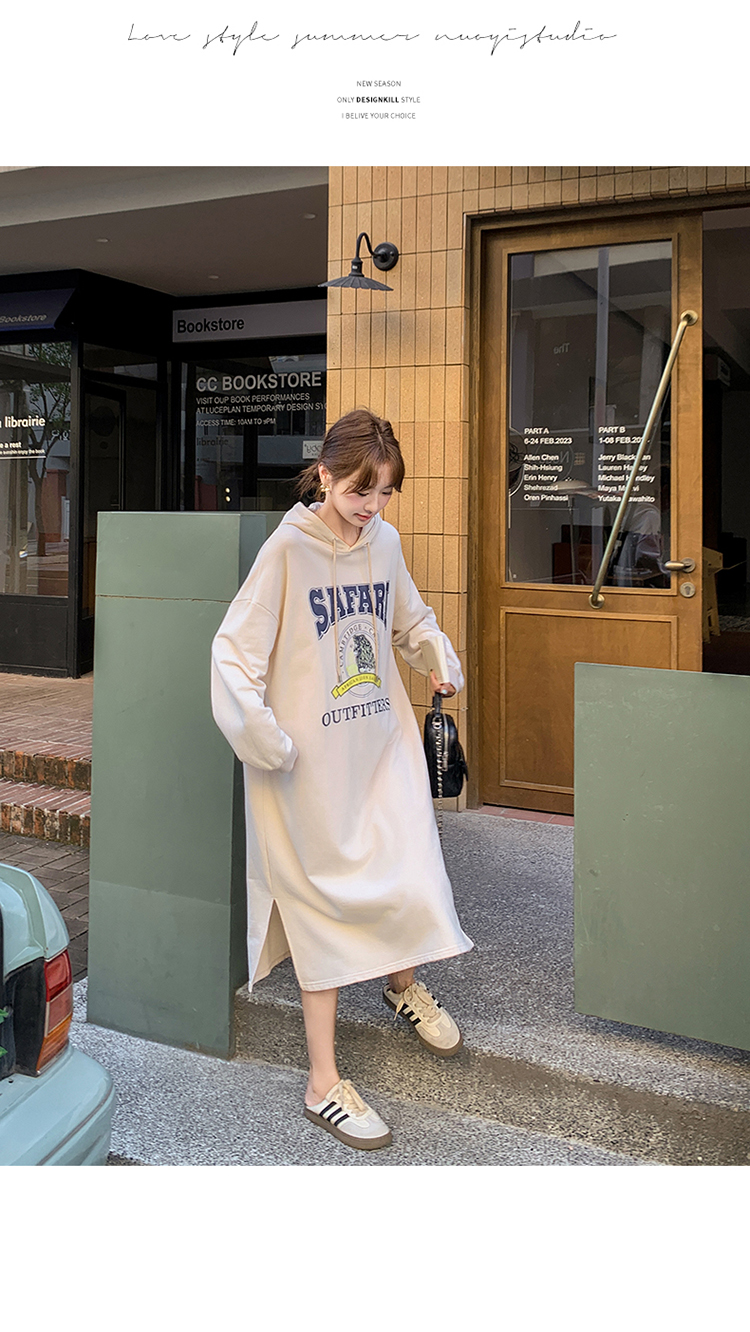 【ワンピース】高級感 韓国風 オフホワイト フード付き長袖ワンピース おしゃれ ゆったりスウェットロングワンピース【JZシリーズ】