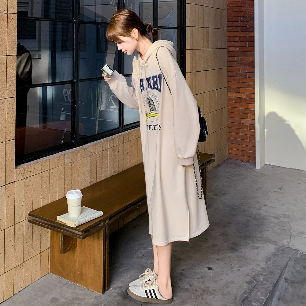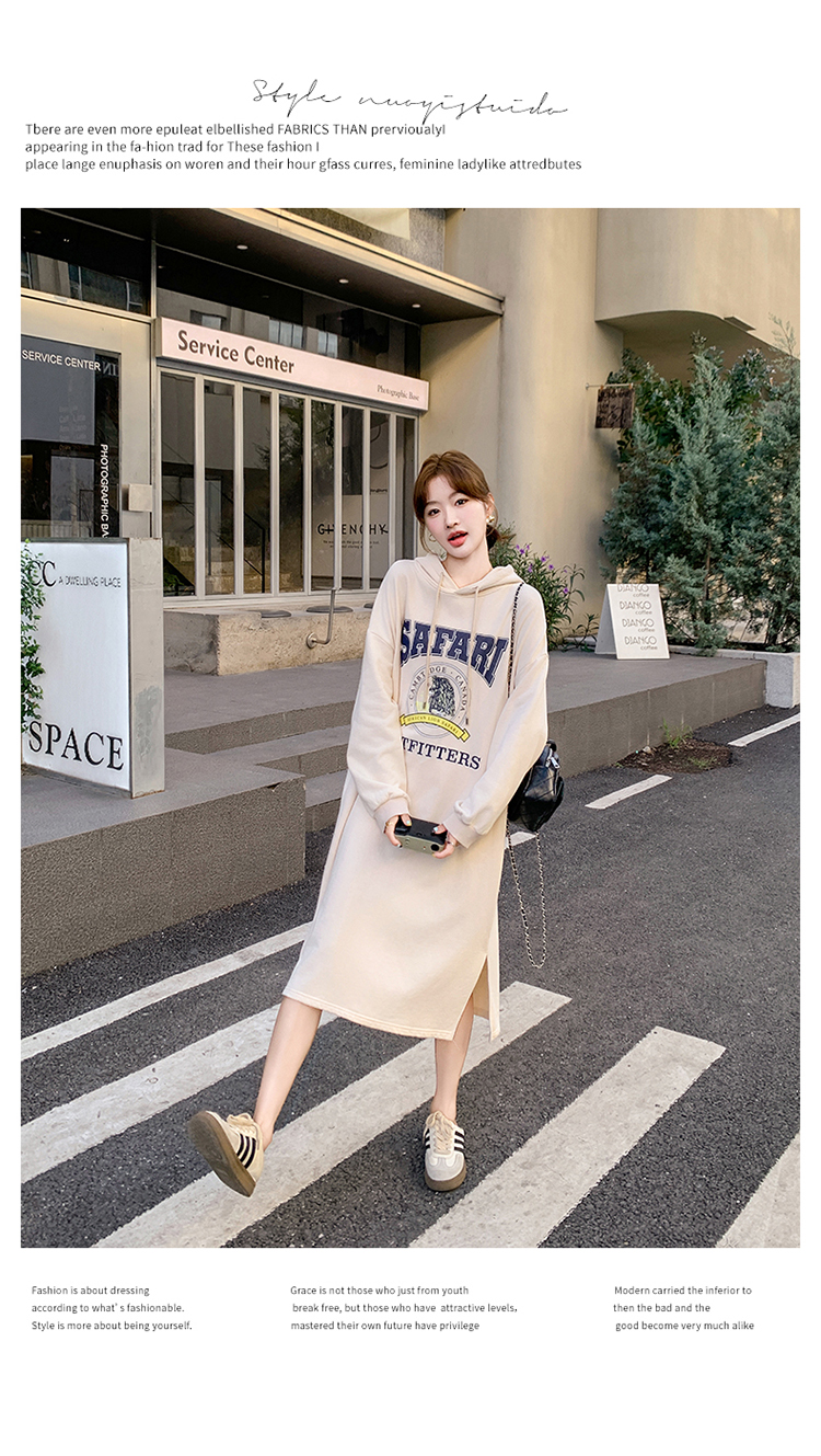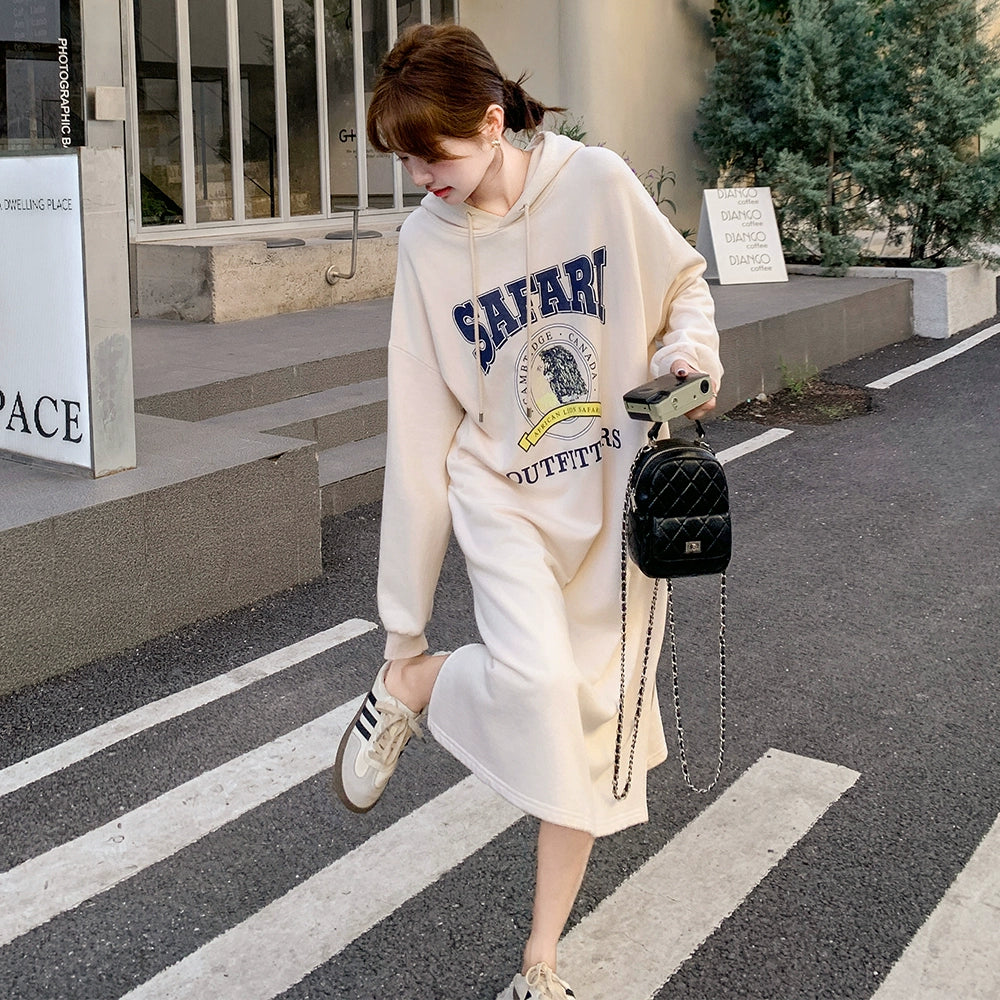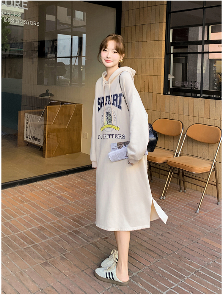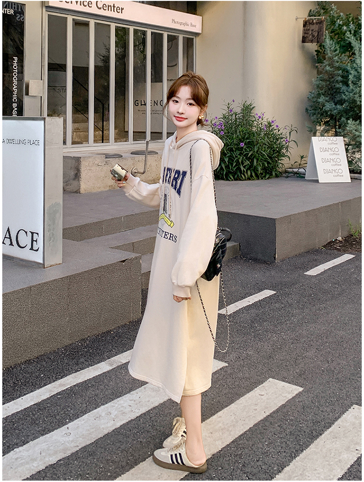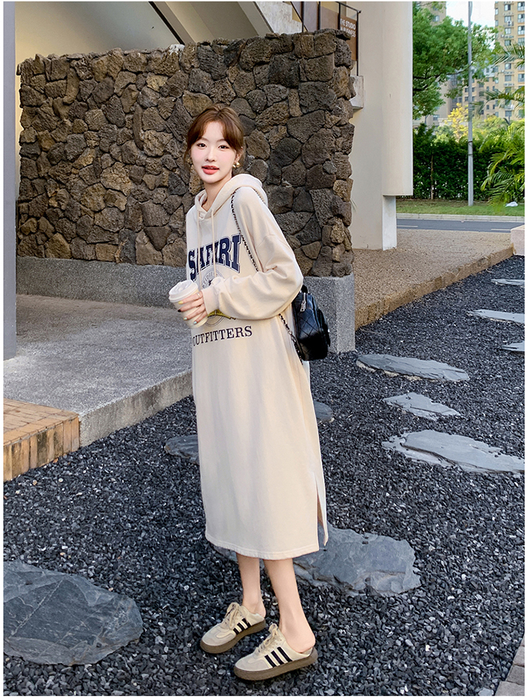 【ワンピース】高級感 韓国風 オフホワイト フード付き長袖ワンピース おしゃれ ゆったりスウェットロングワンピース【JZシリーズ】