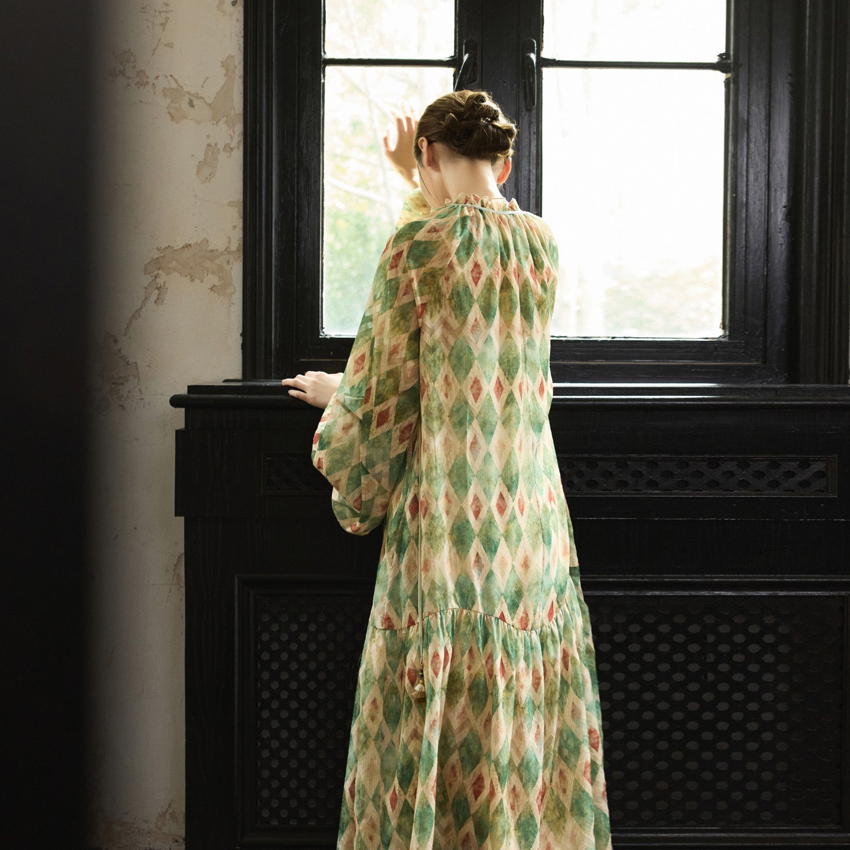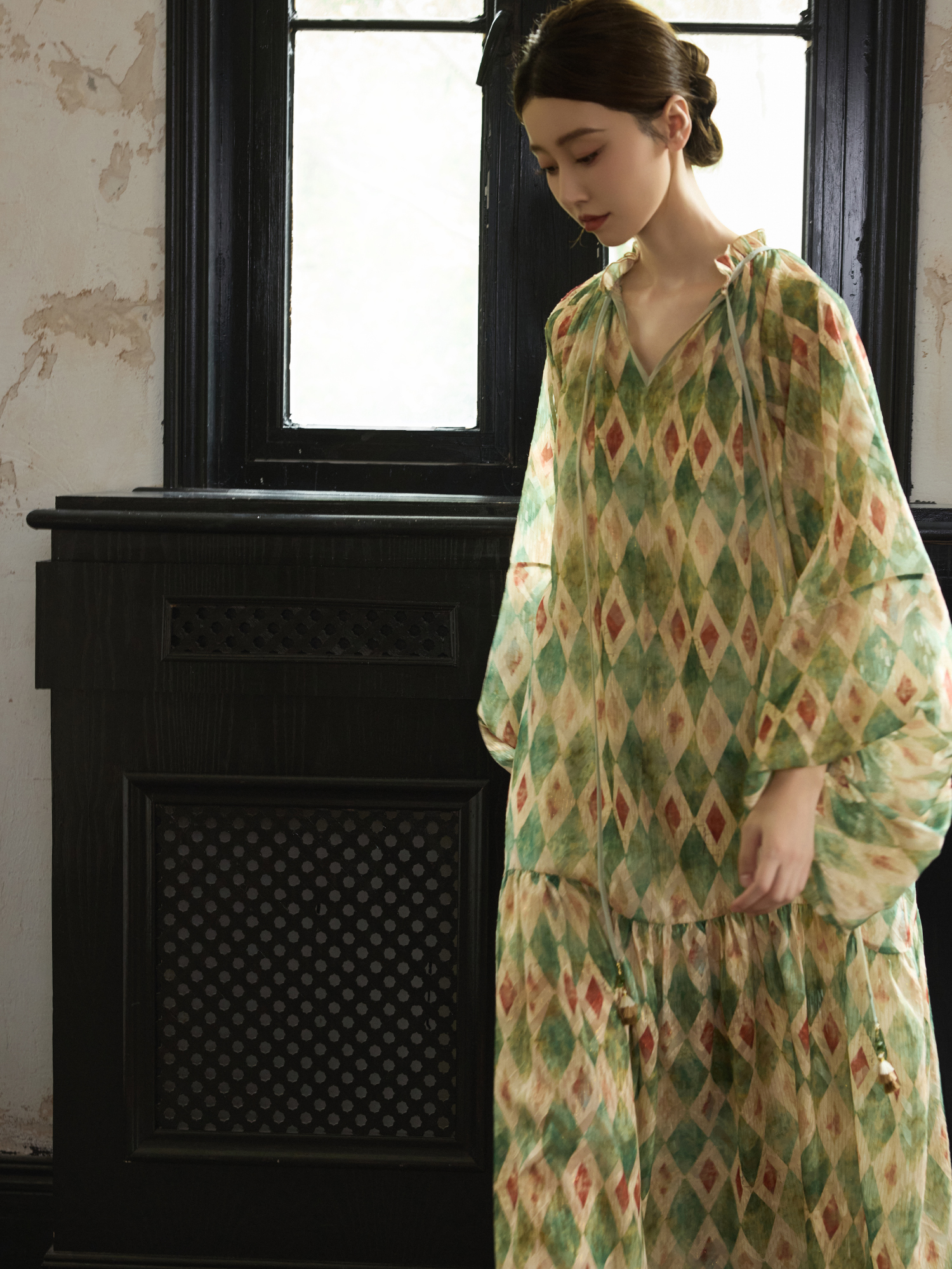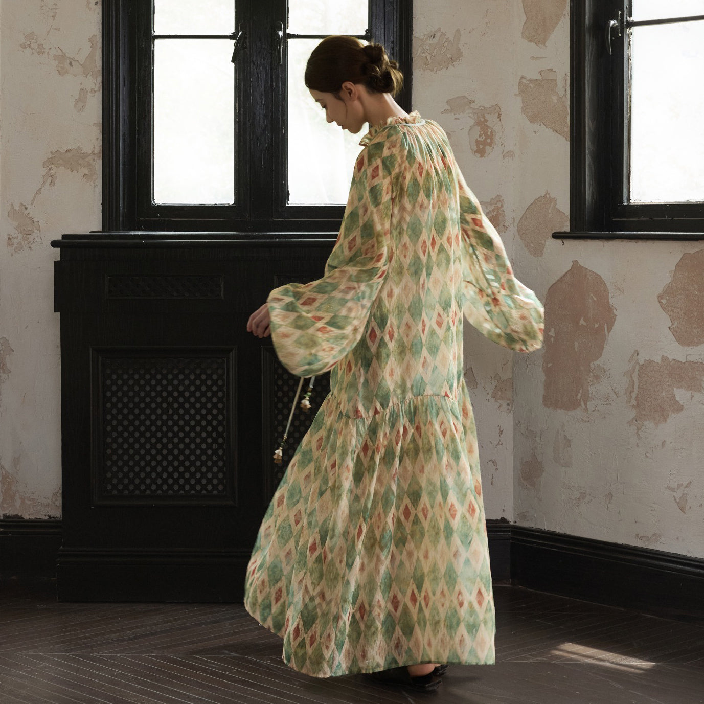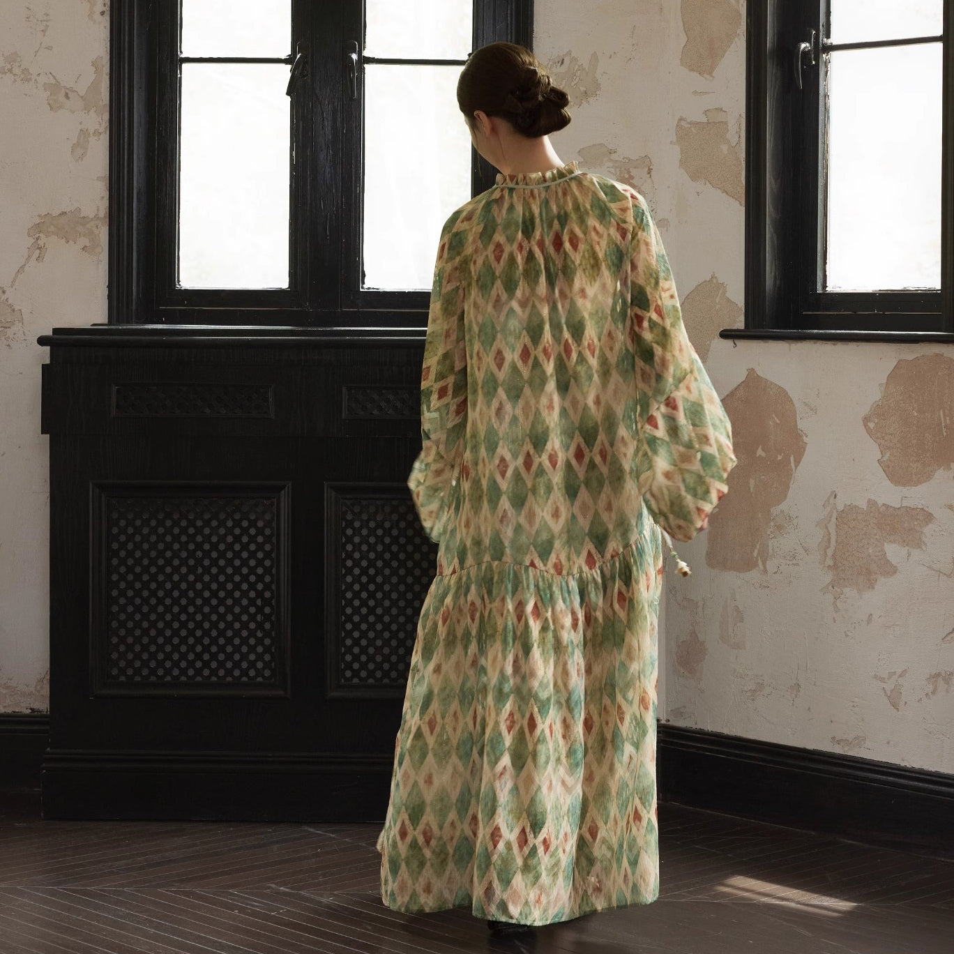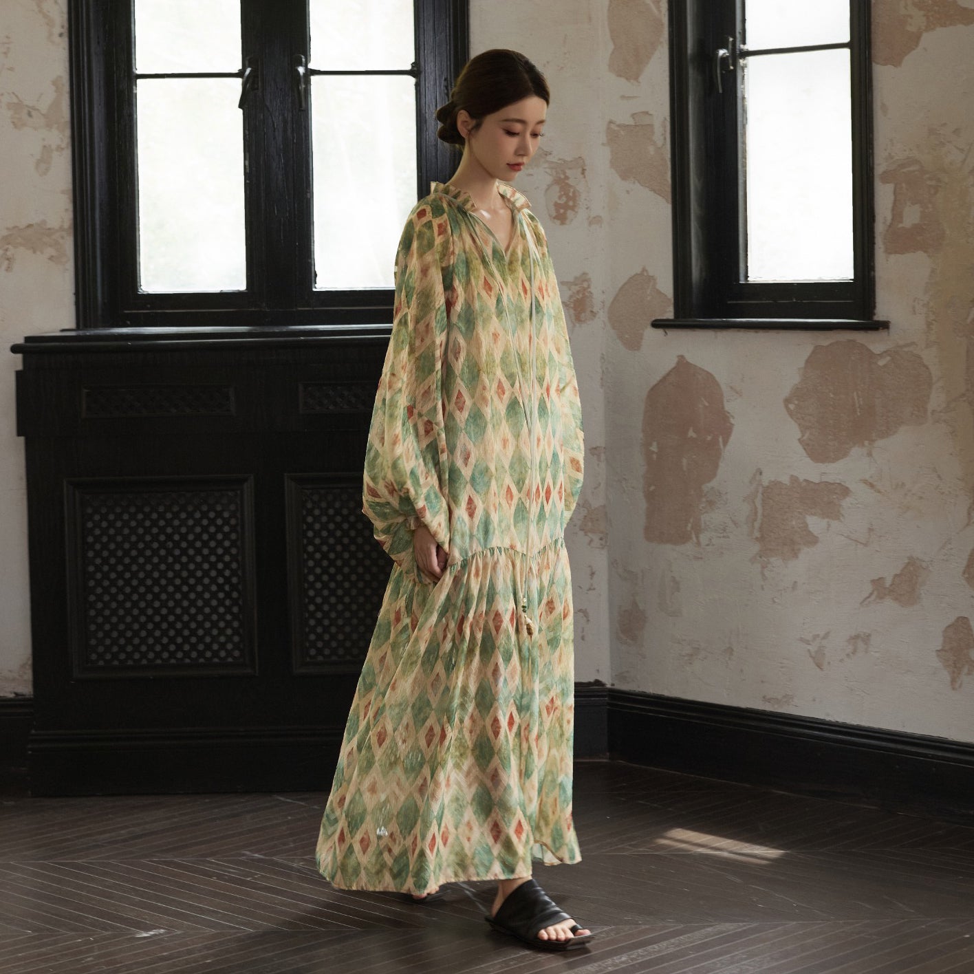 【ワンピース】【30-35日内発送】フレンチ レトロ プリント パフスリーブワンピース ゆったり Vネック 長袖ワンピース【SHシリーズ】