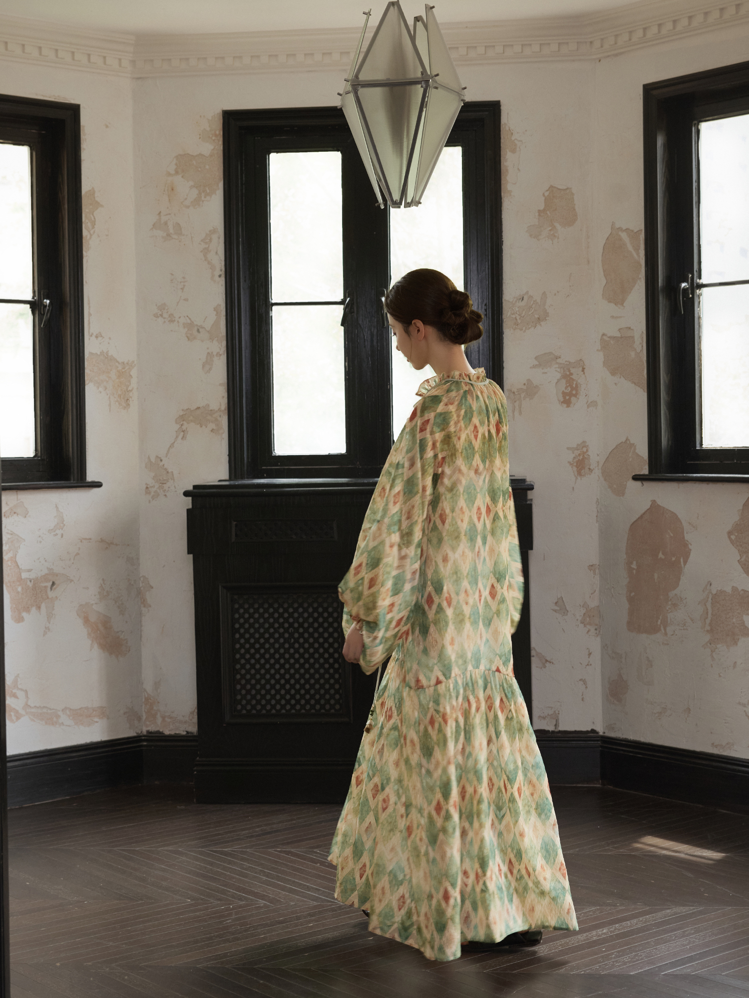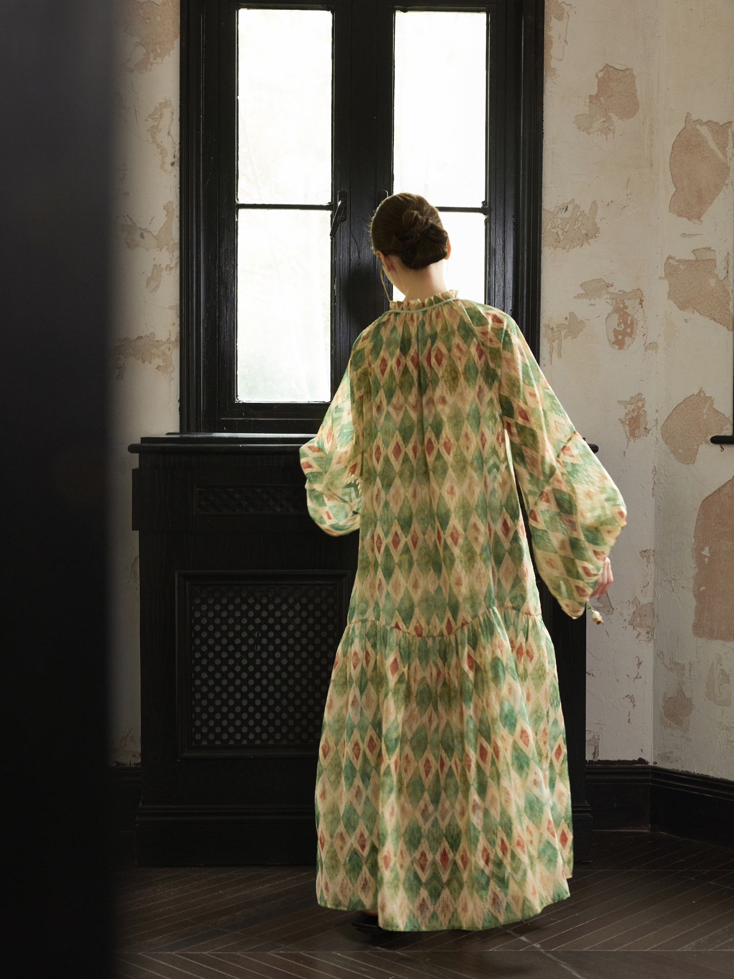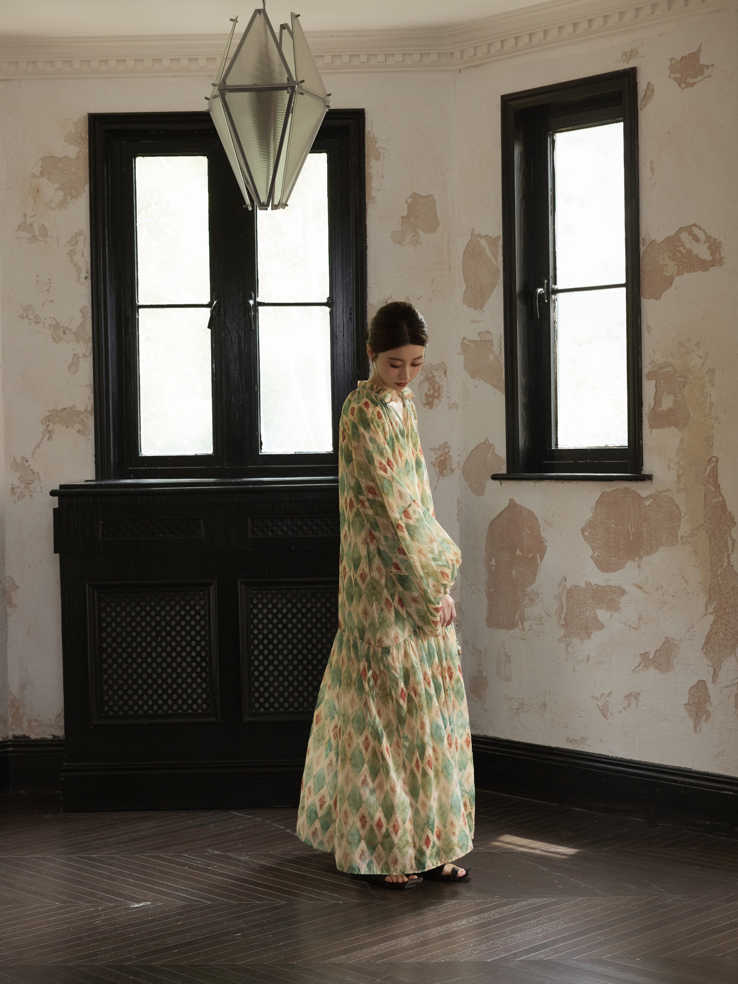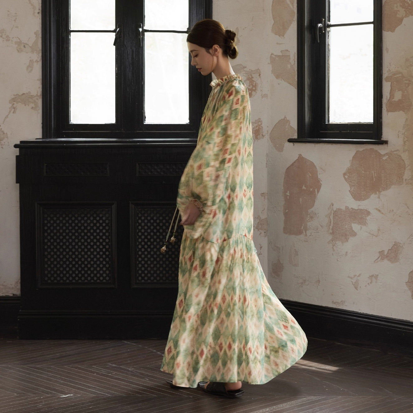 【ワンピース】【30-35日内発送】フレンチ レトロ プリント パフスリーブワンピース ゆったり Vネック 長袖ワンピース【SHシリーズ】