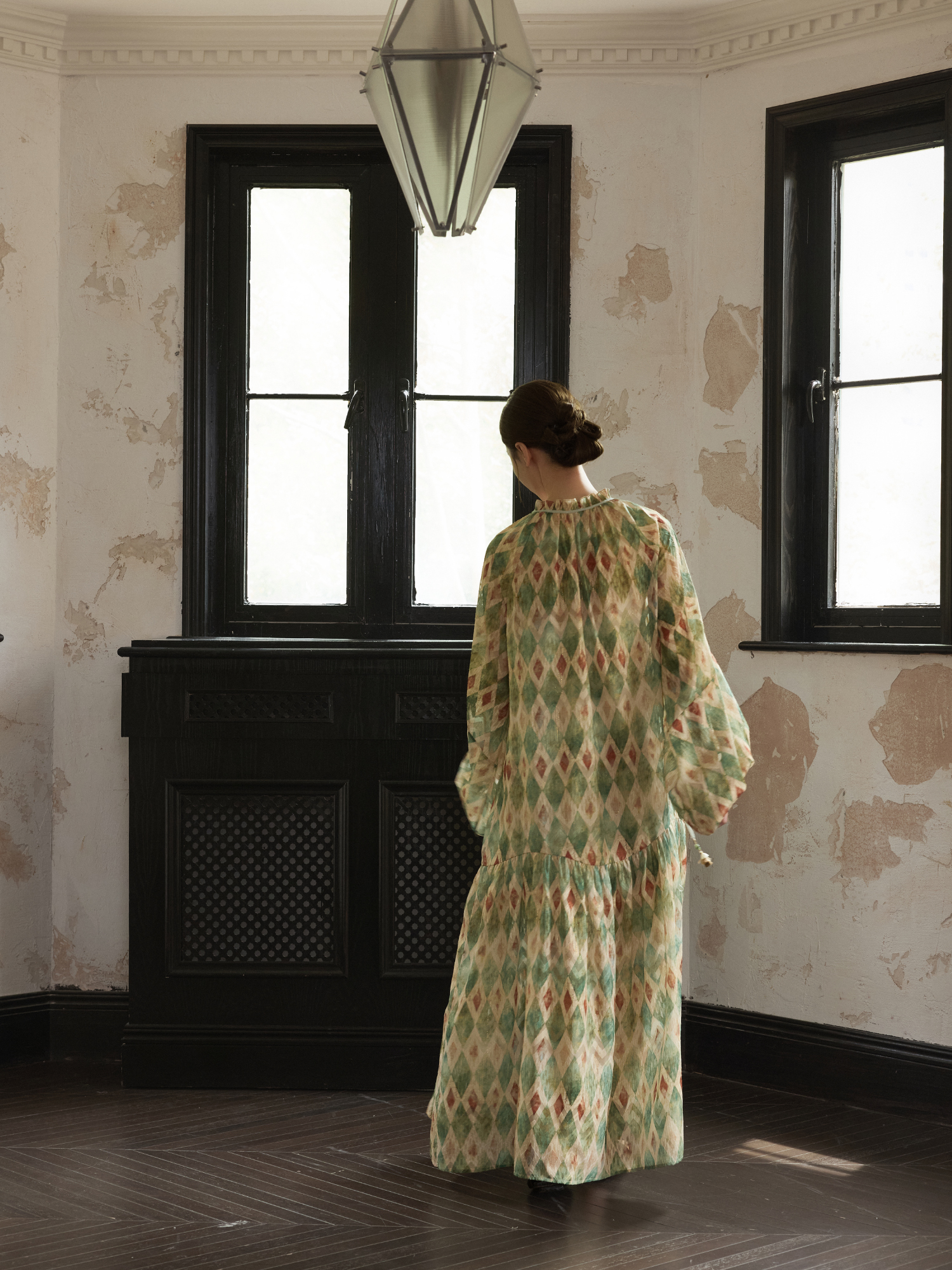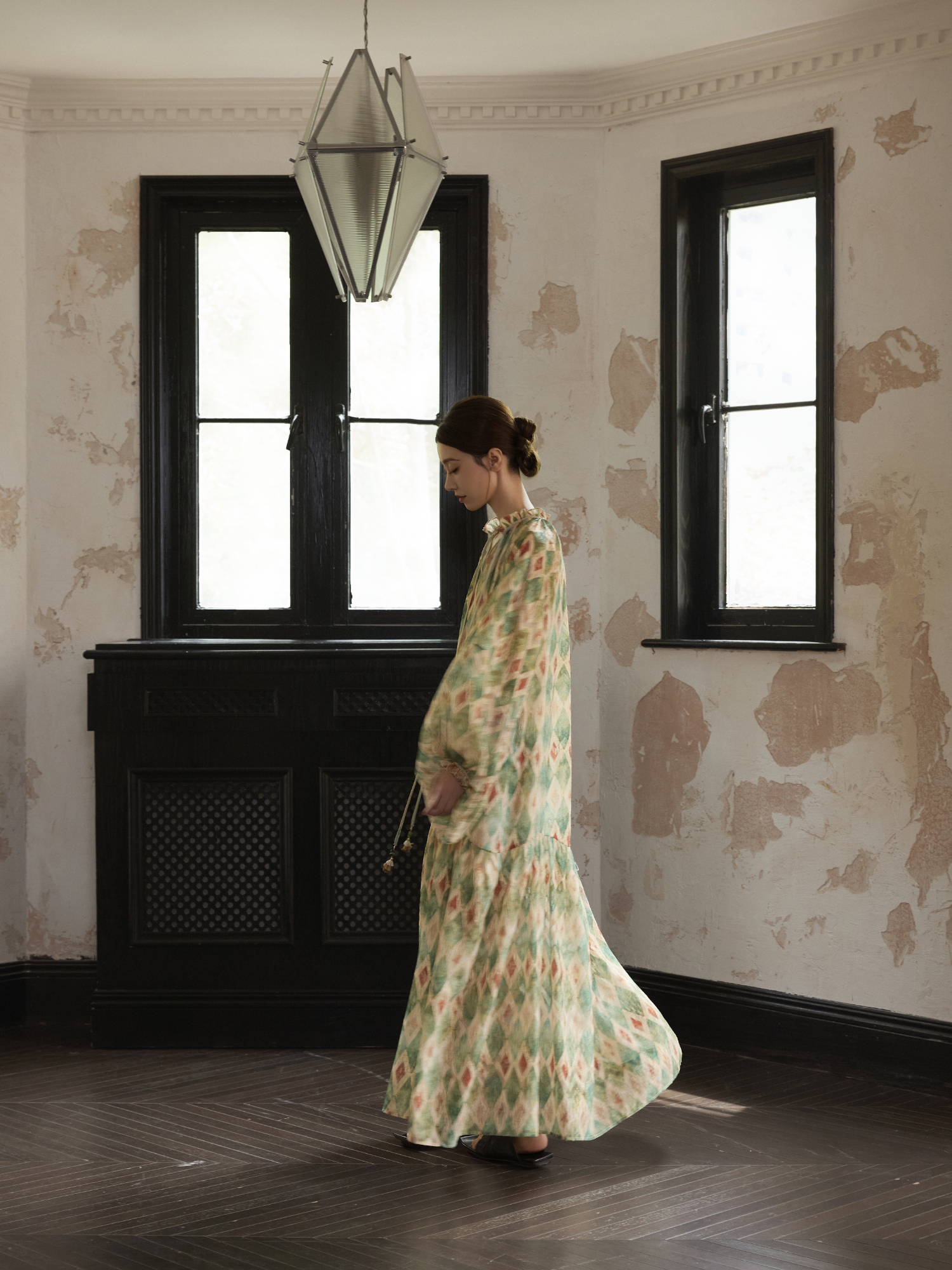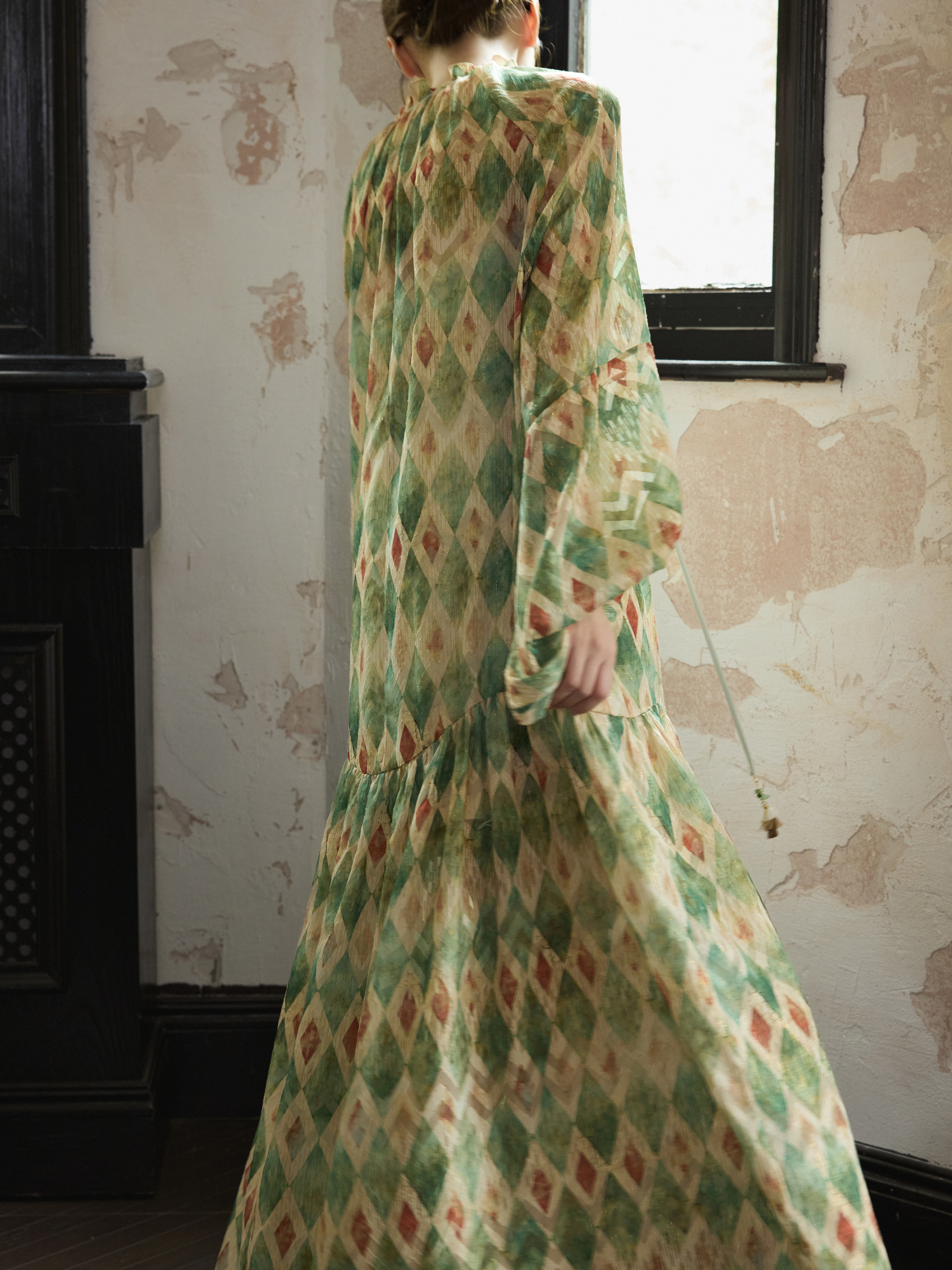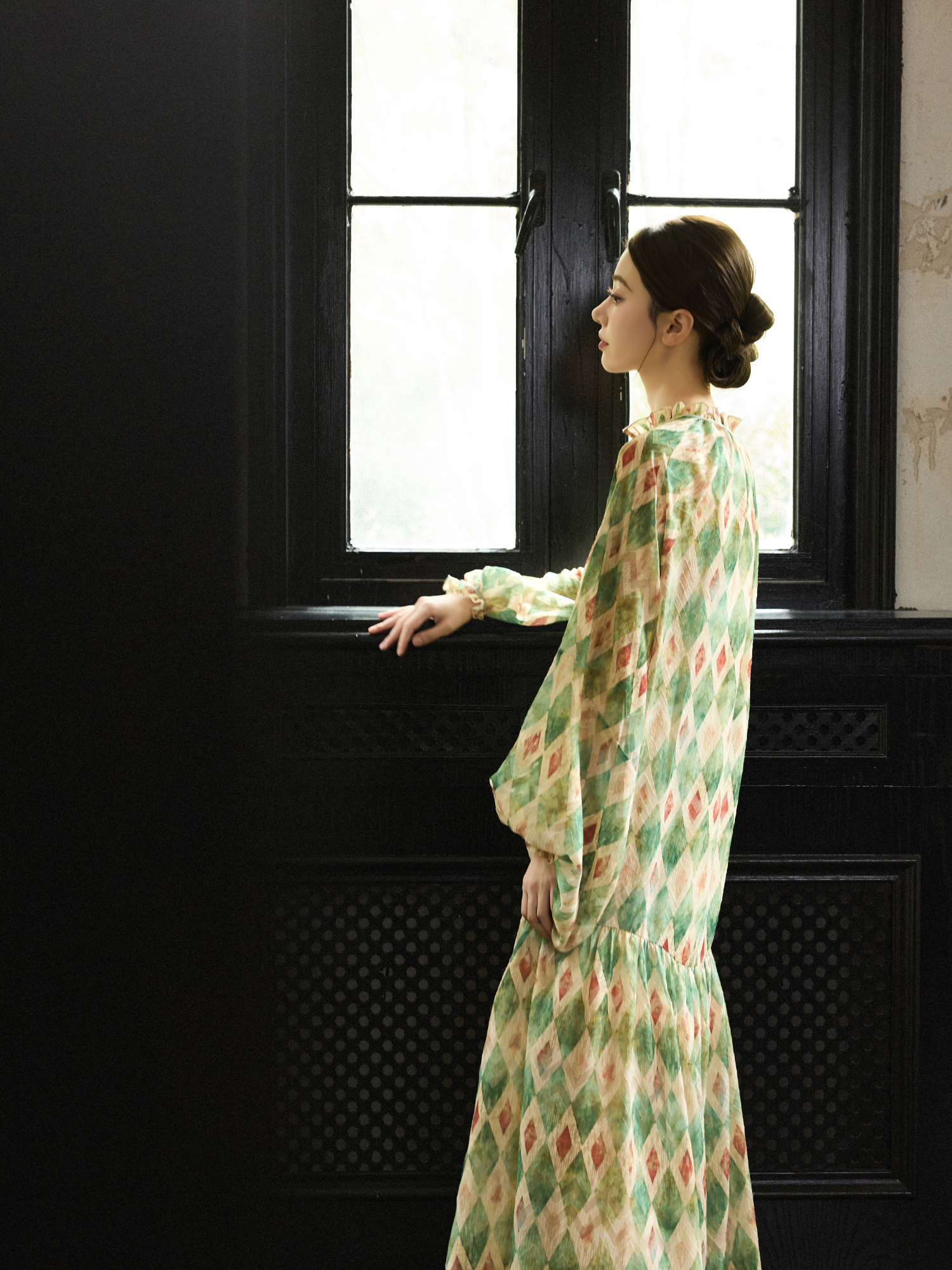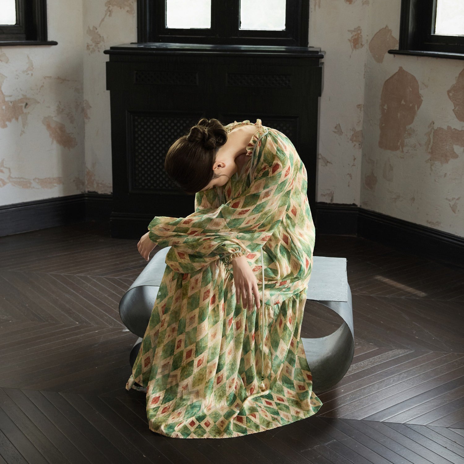 【ワンピース】【30-35日内発送】フレンチ レトロ プリント パフスリーブワンピース ゆったり Vネック 長袖ワンピース【SHシリーズ】