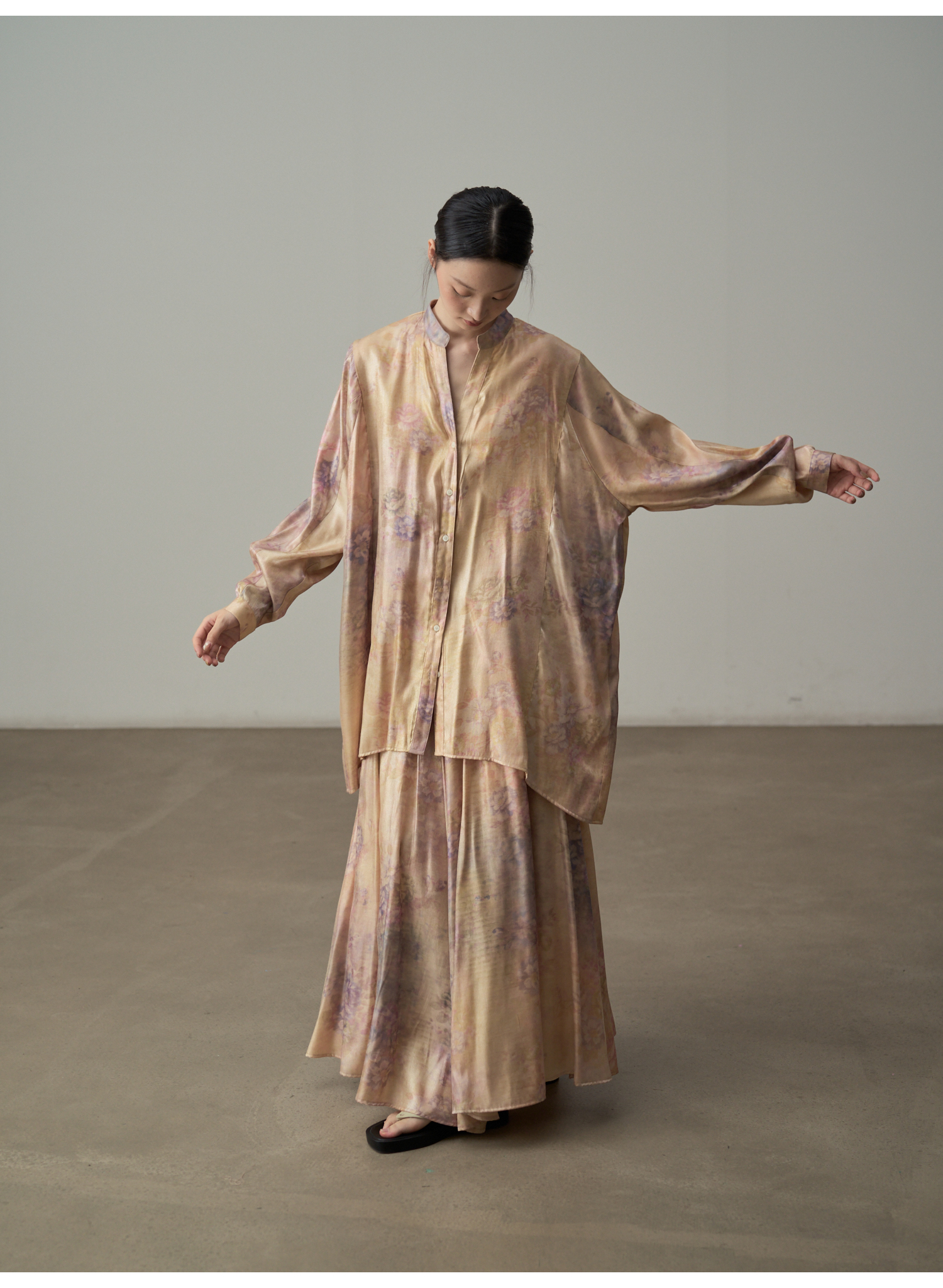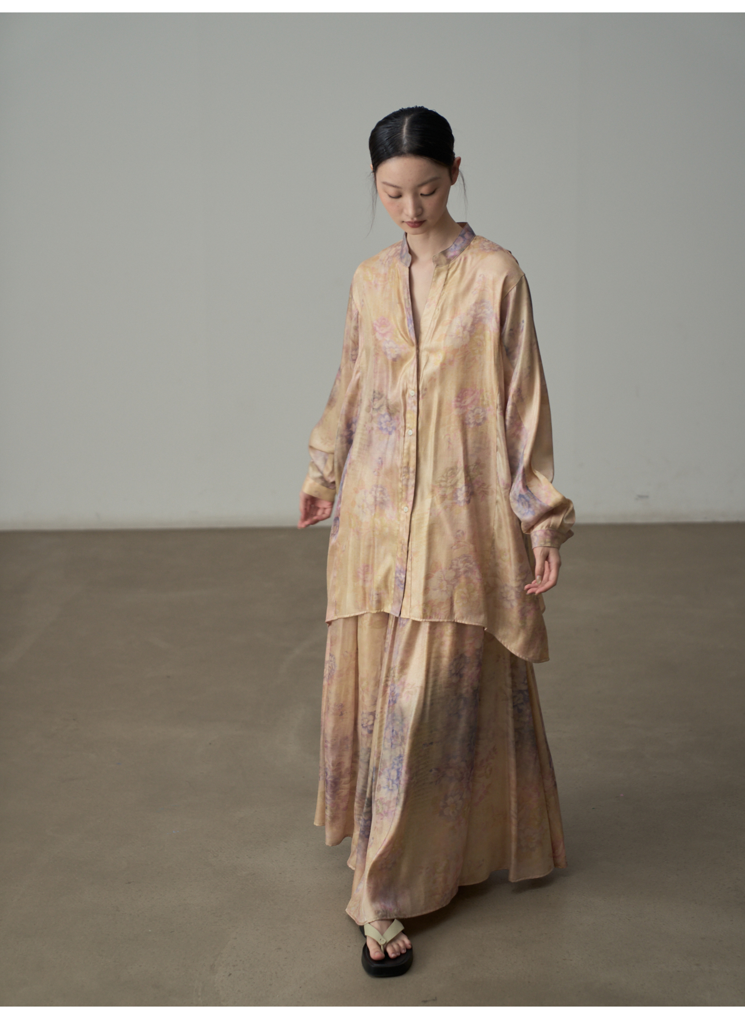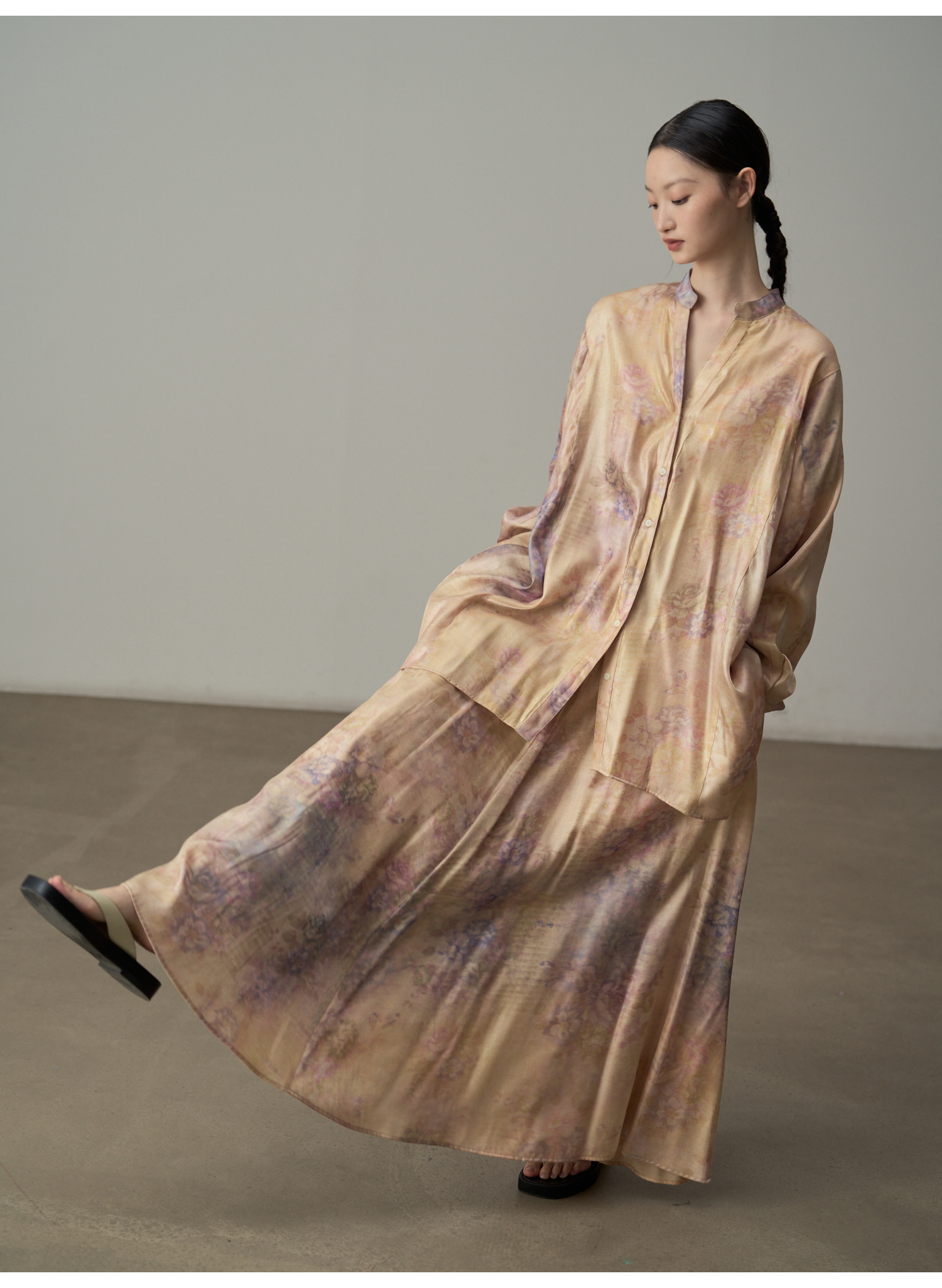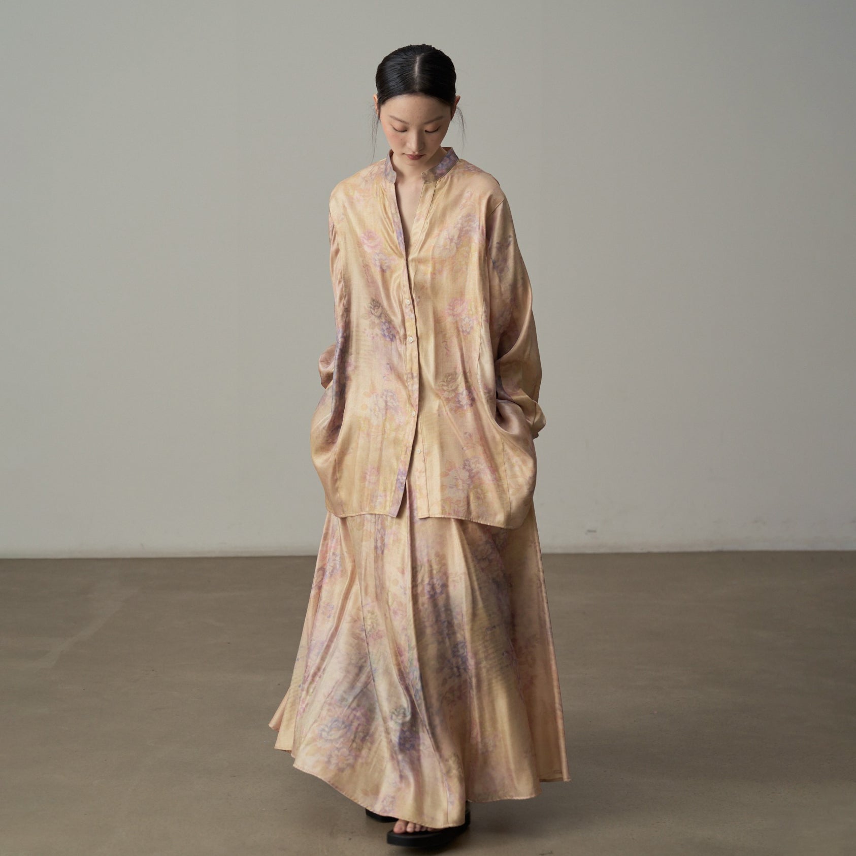 【単品注文】【セットアップ】新中華風 レトロ 薄手 UVカット プリント ゆったり 体型カバー 長袖シャツ+フレアスカート【SHシリーズ】