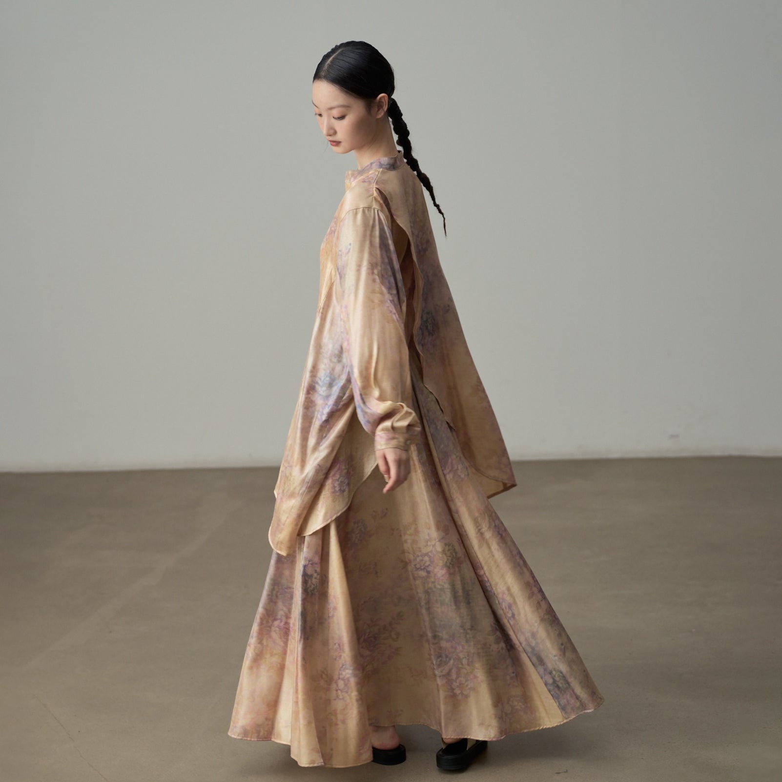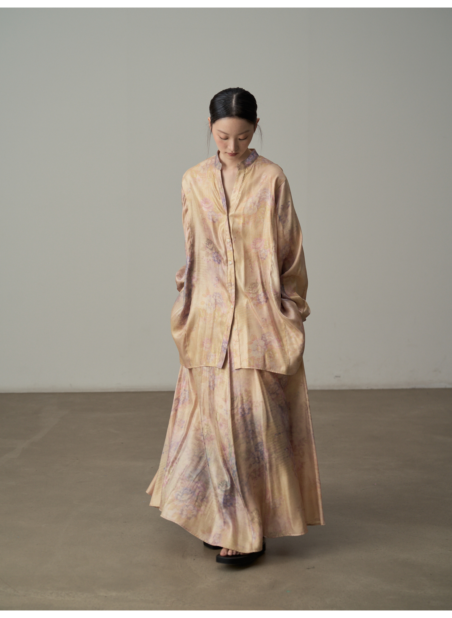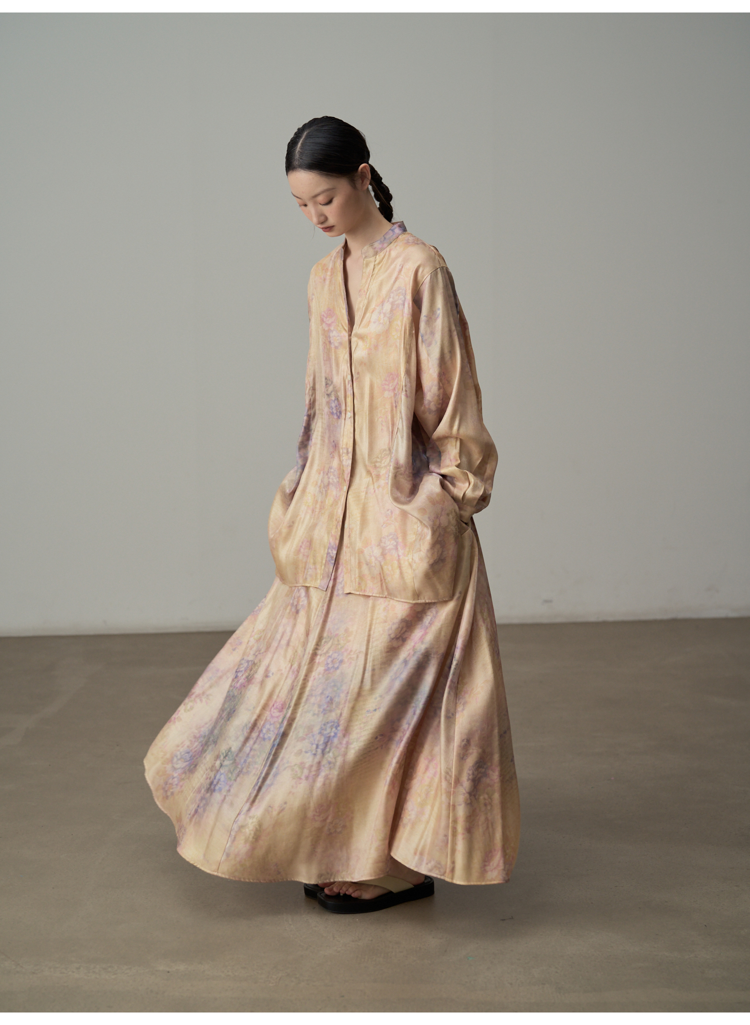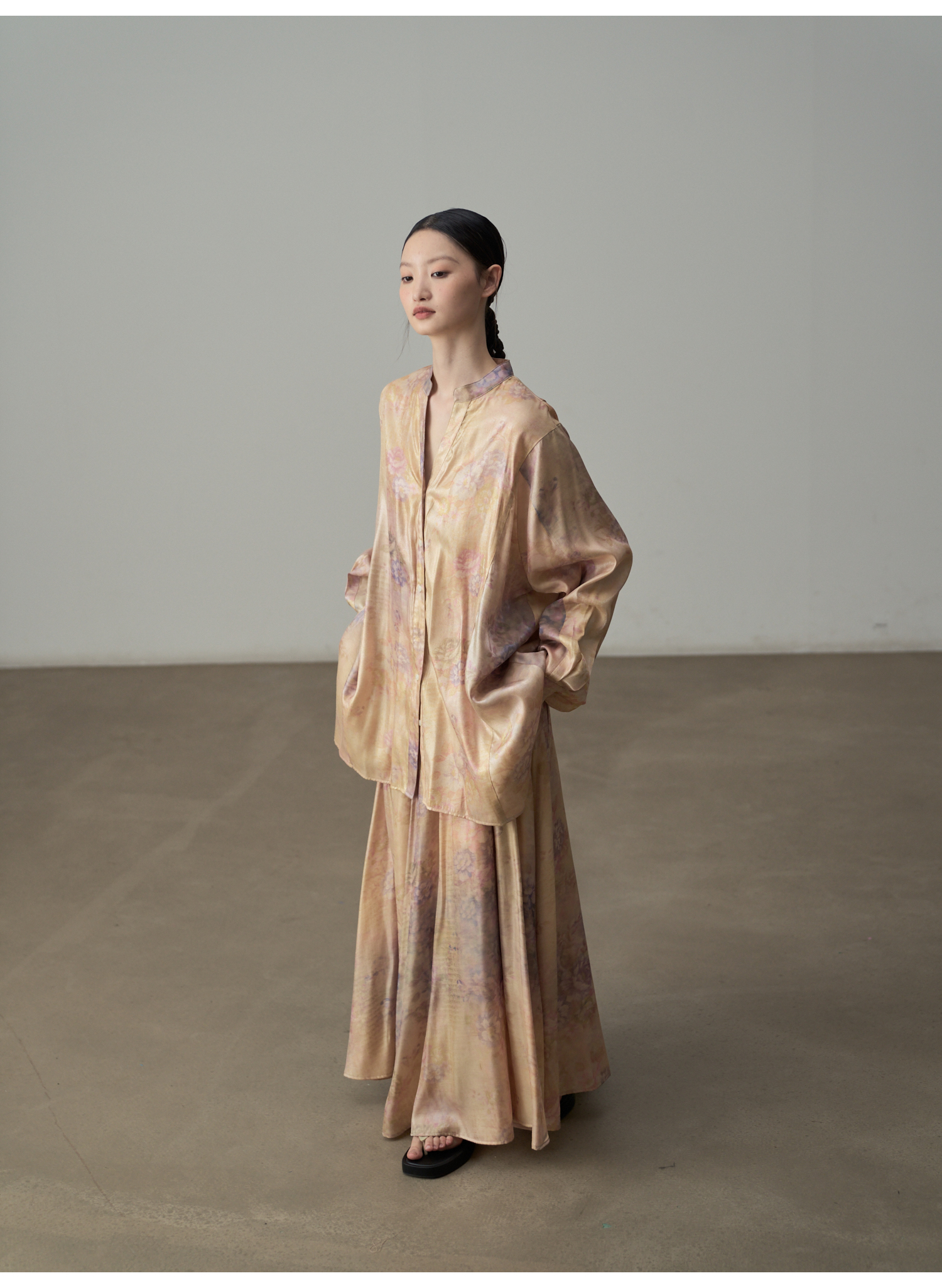 【単品注文】【セットアップ】新中華風 レトロ 薄手 UVカット プリント ゆったり 体型カバー 長袖シャツ+フレアスカート【SHシリーズ】