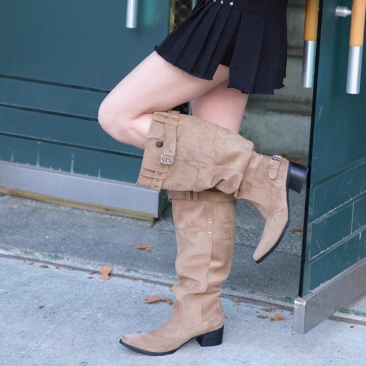 【シューズ】ポインテッドトゥ 太め筒囲 ハイヒール くしゅくしゅブーツ ヴィンテージ 西部カウボーイブーツ レディース