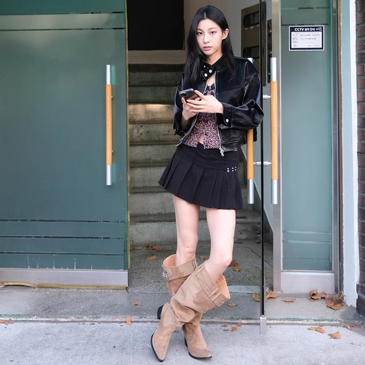 【商品名】【シューズ】ポインテッドトゥ 太め筒囲 ハイヒール くしゅくしゅブーツ ヴィンテージ 西部カウボーイブーツ レディース