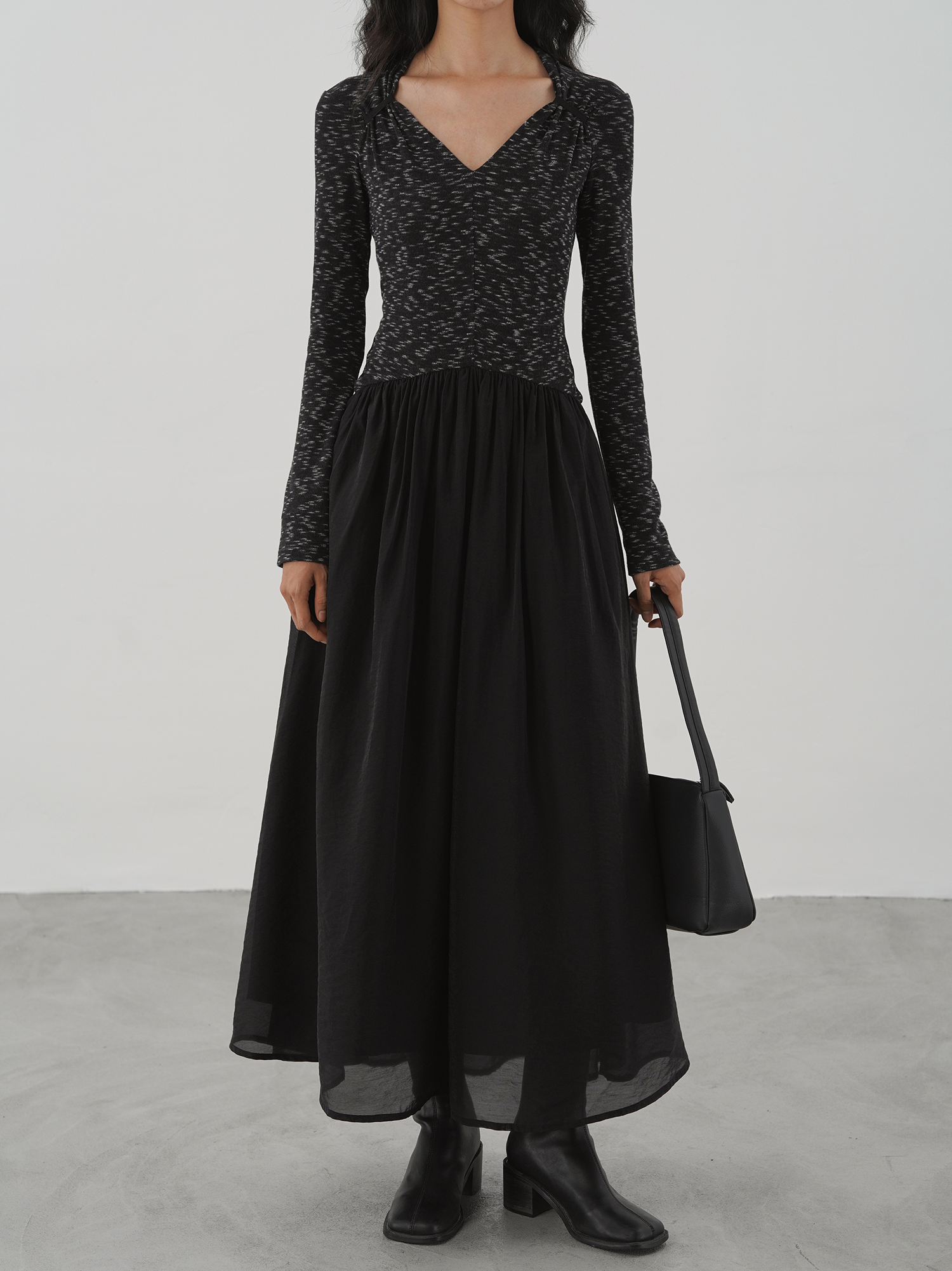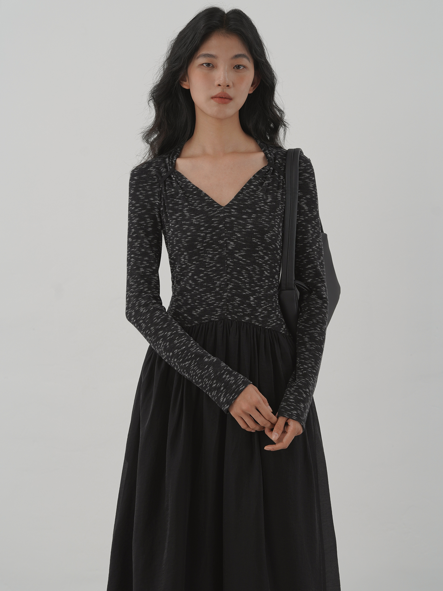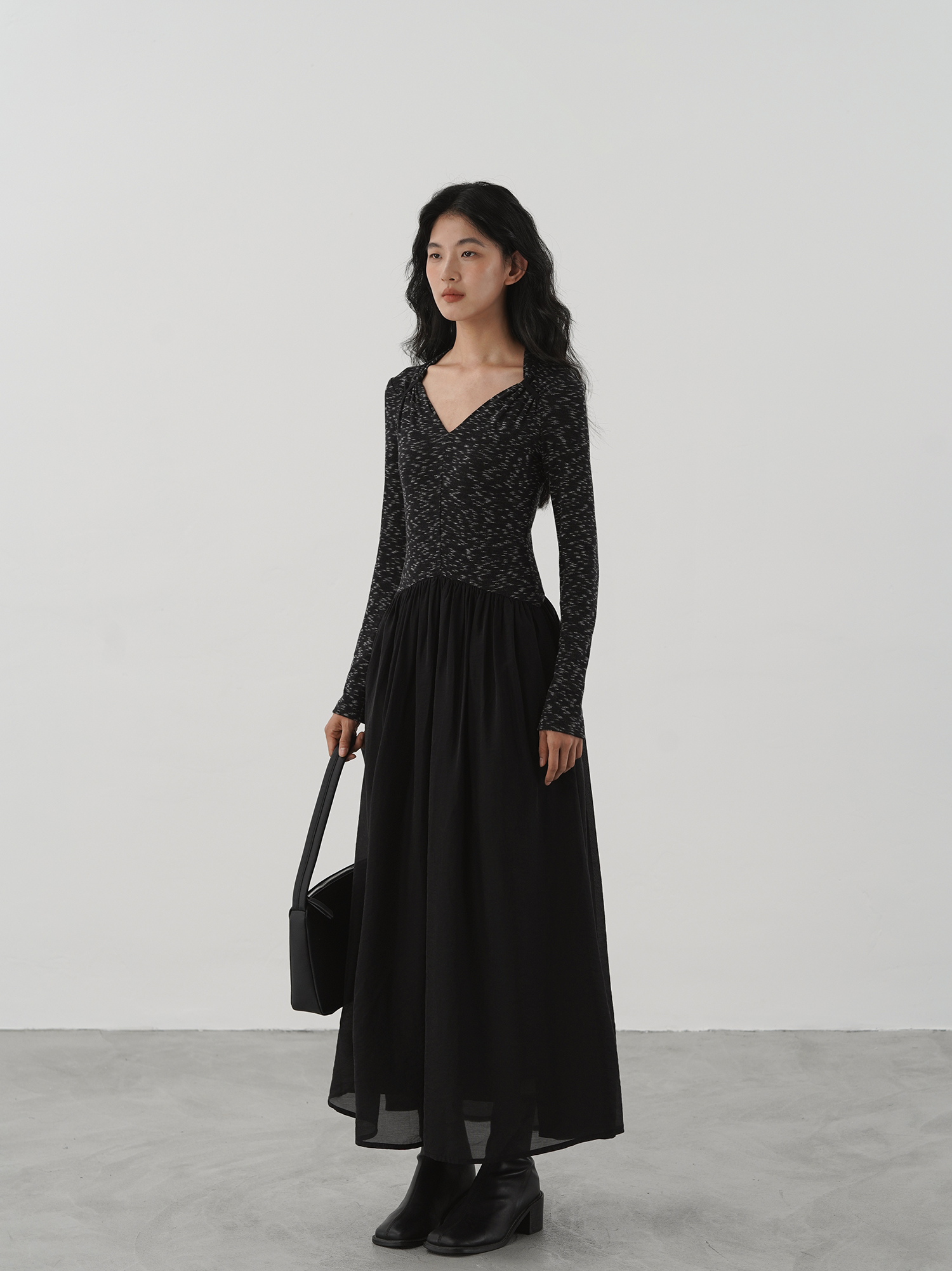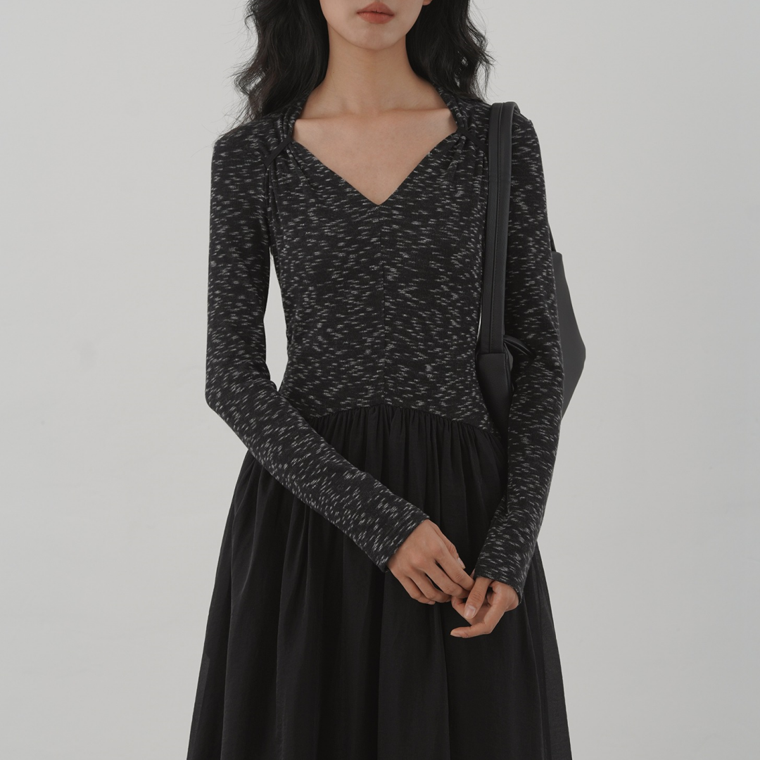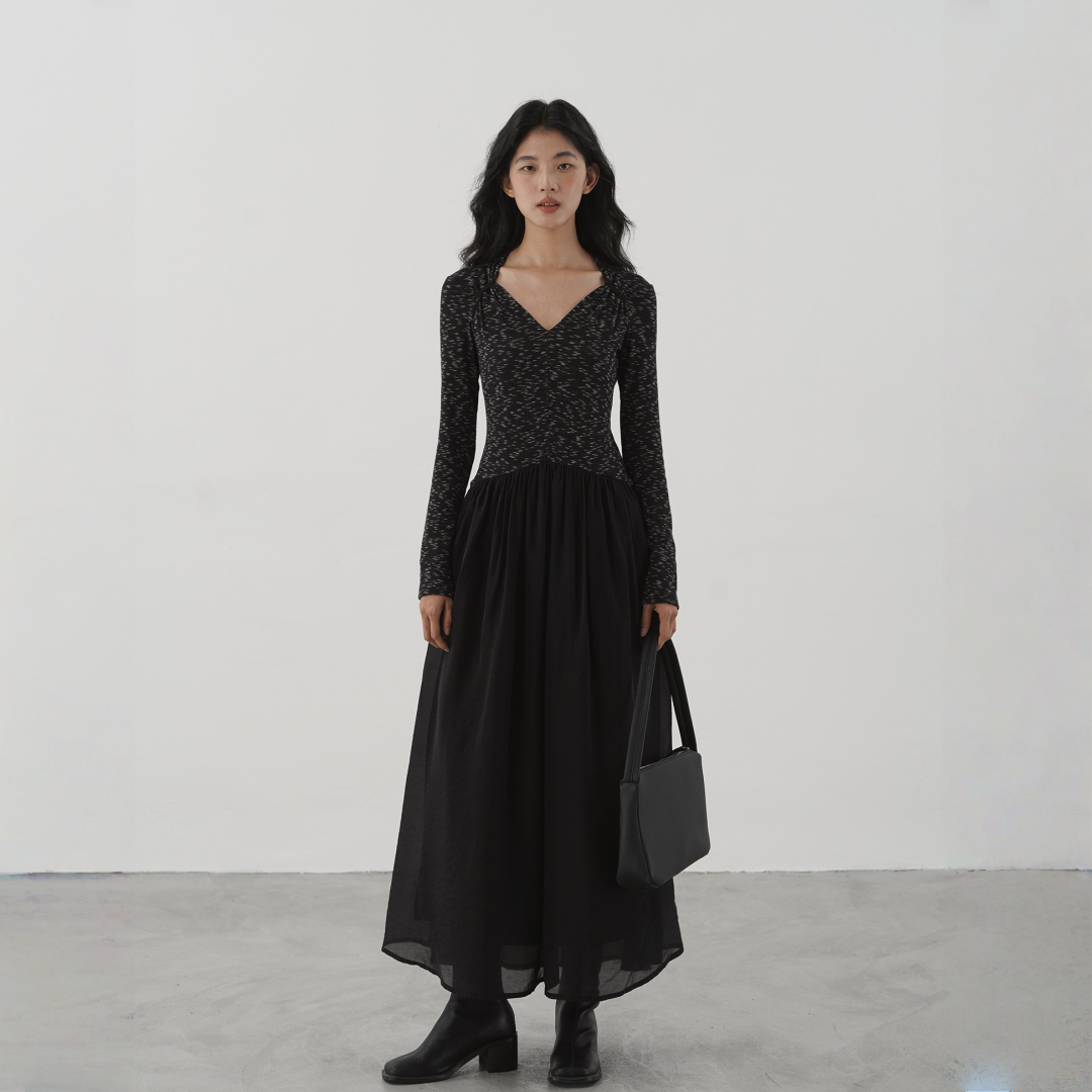 【ワンピース】細見え 日系 Vネック 無地 長袖ワンピース 切替デザイン ゆったり 気質ロング【JZシリーズ】【AHシリーズ】