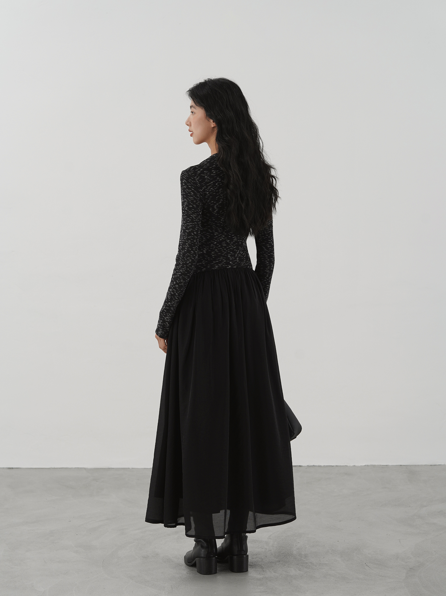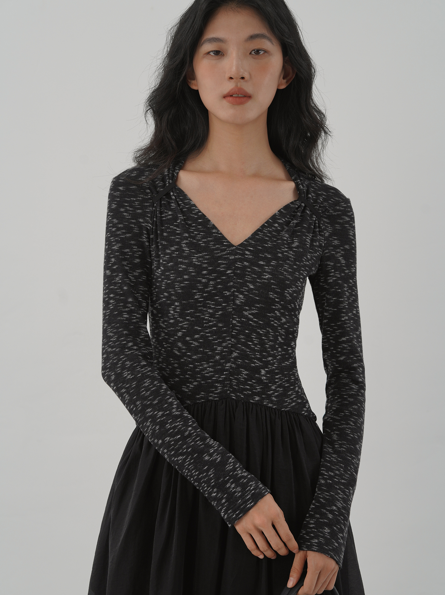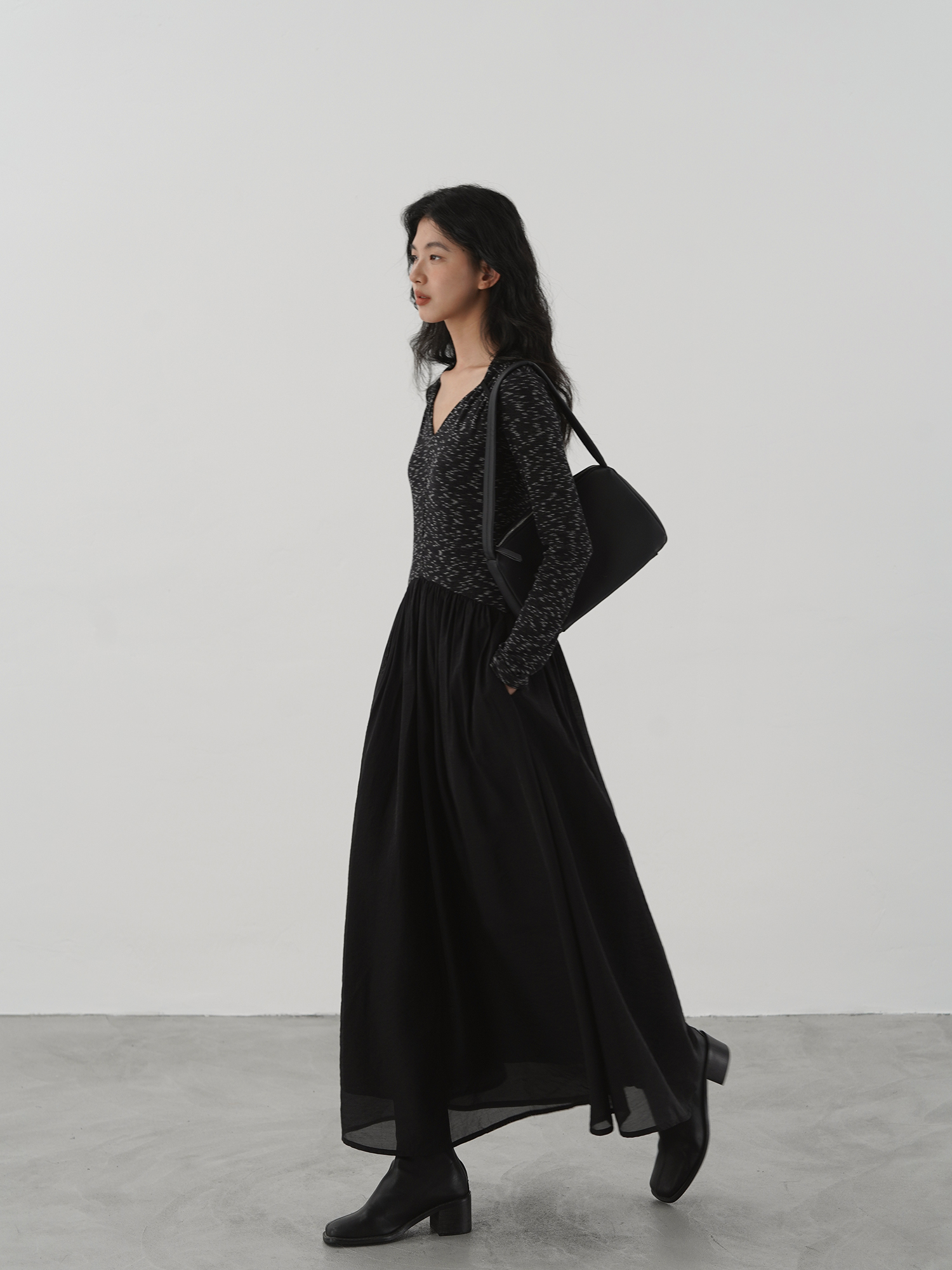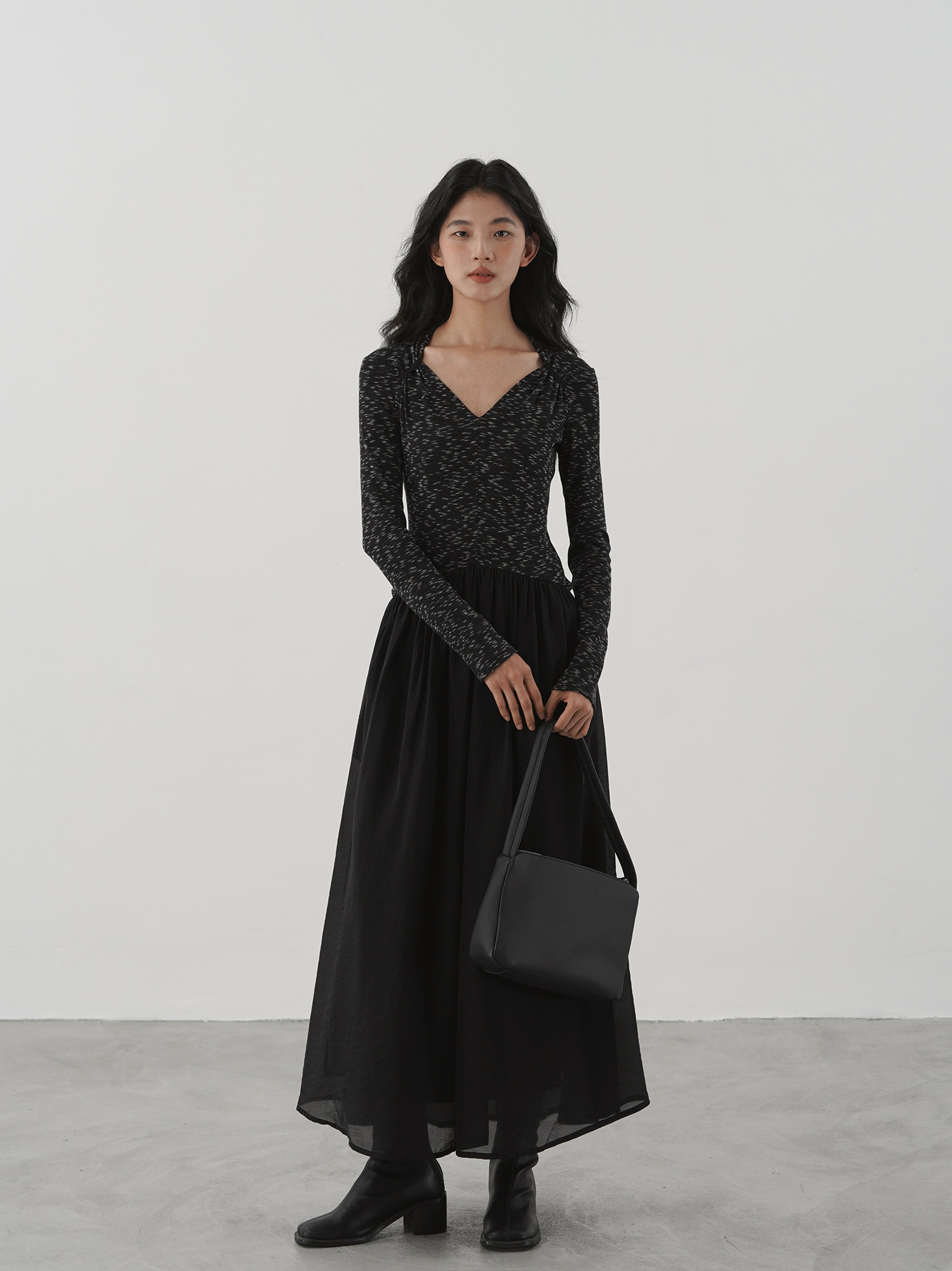【ワンピース】細見え 日系 Vネック 無地 長袖ワンピース 切替デザイン ゆったり 気質ロング【JZシリーズ】【AHシリーズ】