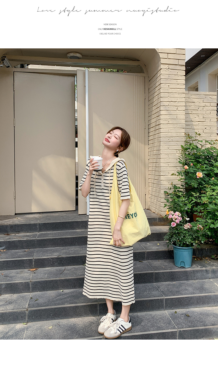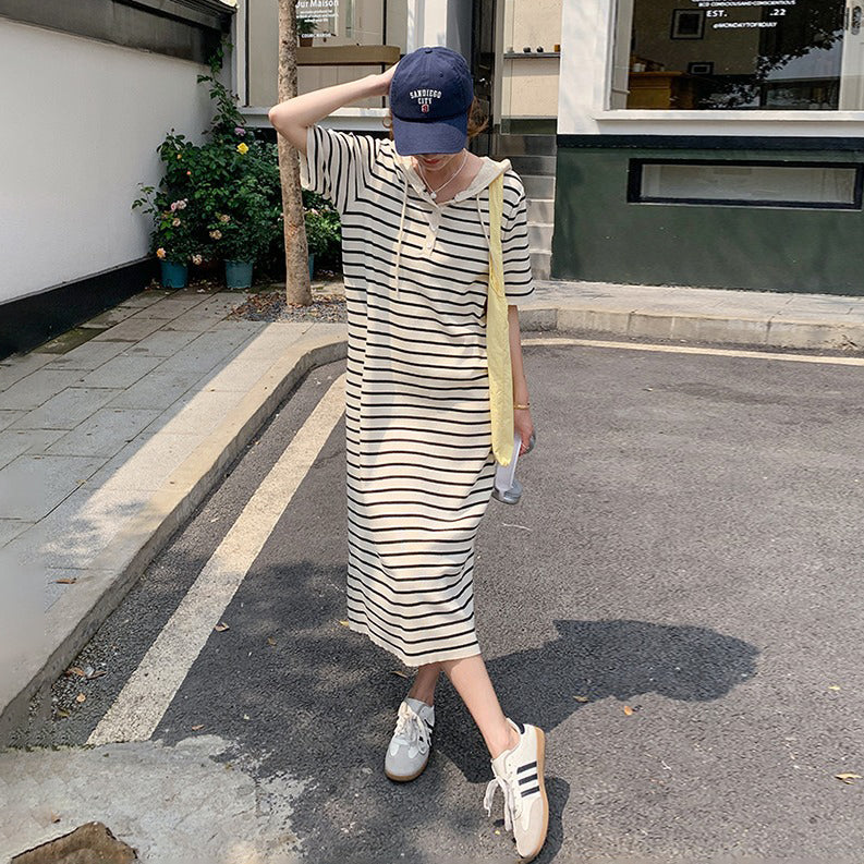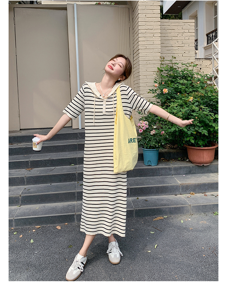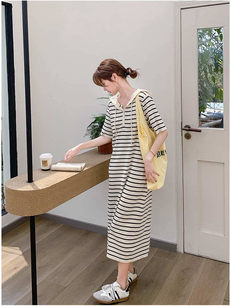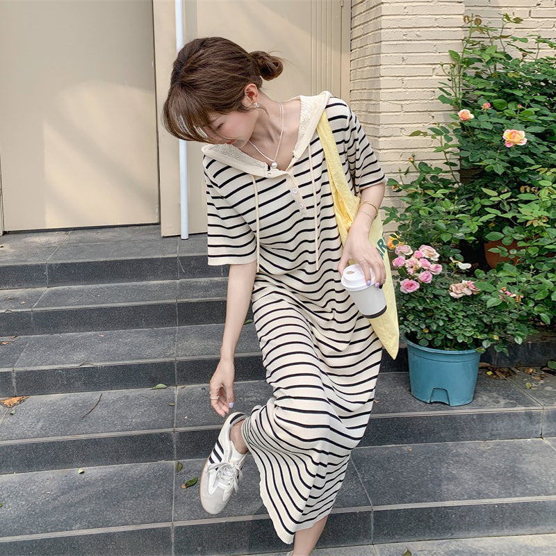 【ワンピース】透かし編みフード付きニットストライプ 半袖ワンピース レディース 夏 学院風 韓国風コーデ 【SHシリーズ】