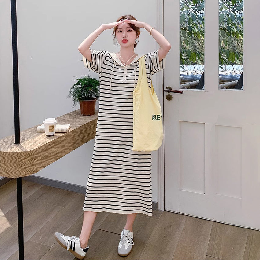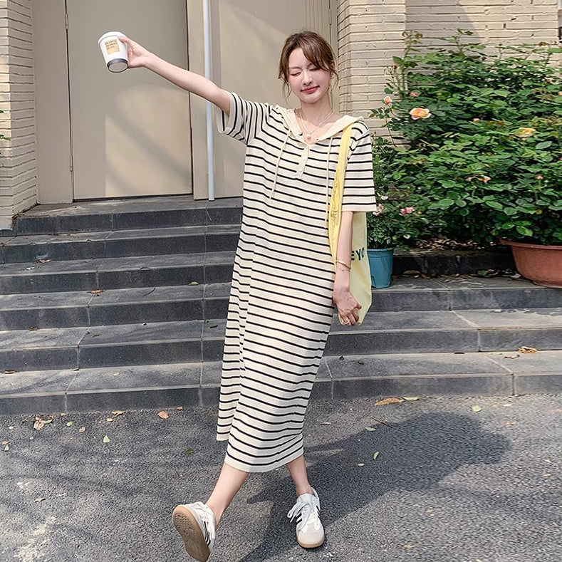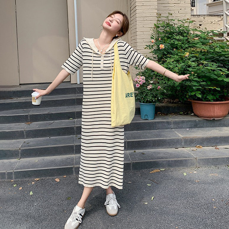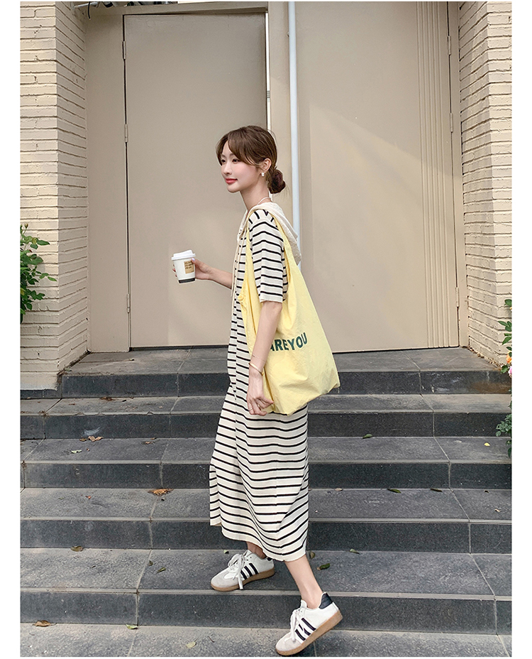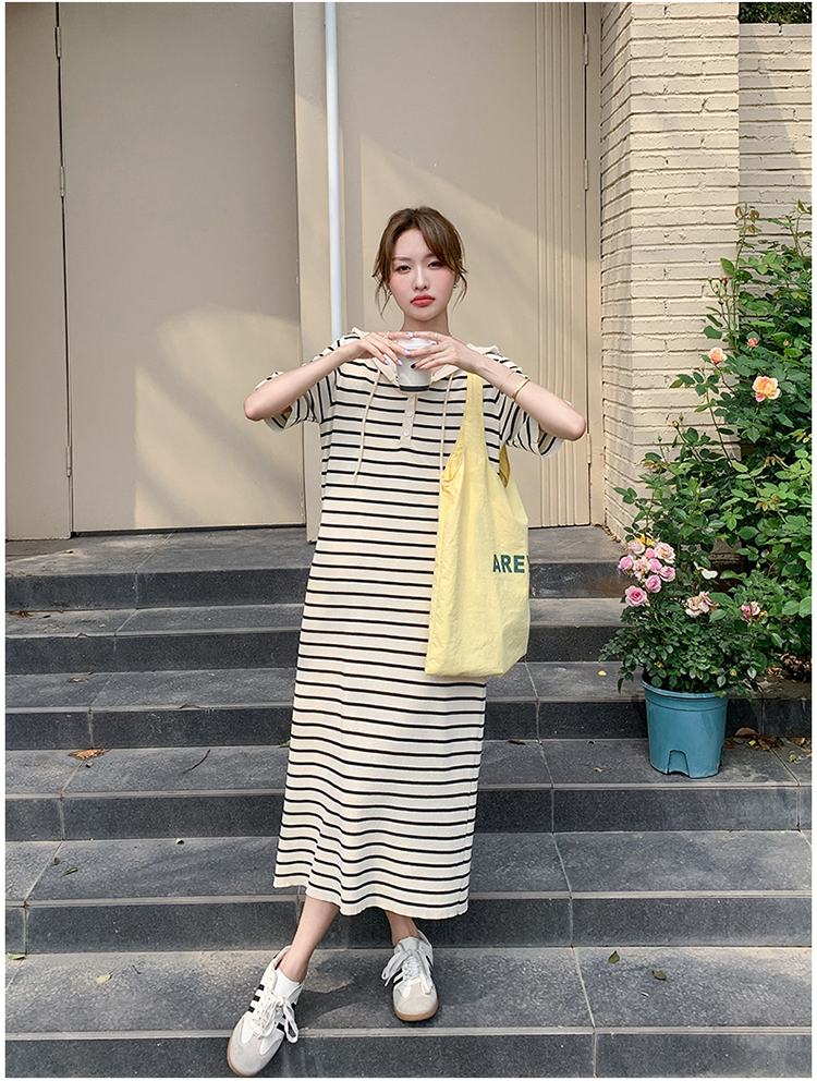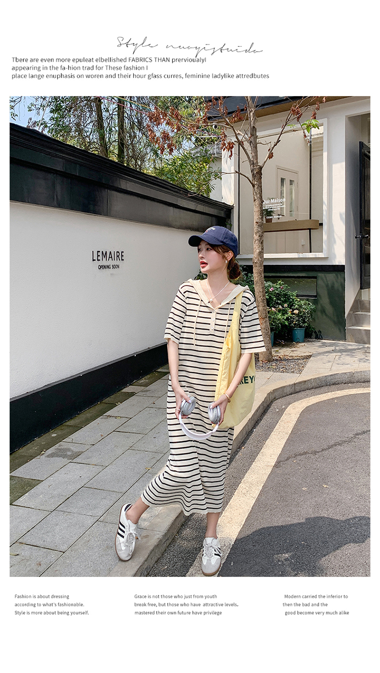 【ワンピース】透かし編みフード付きニットストライプ 半袖ワンピース レディース 夏 学院風 韓国風コーデ 【SHシリーズ】
