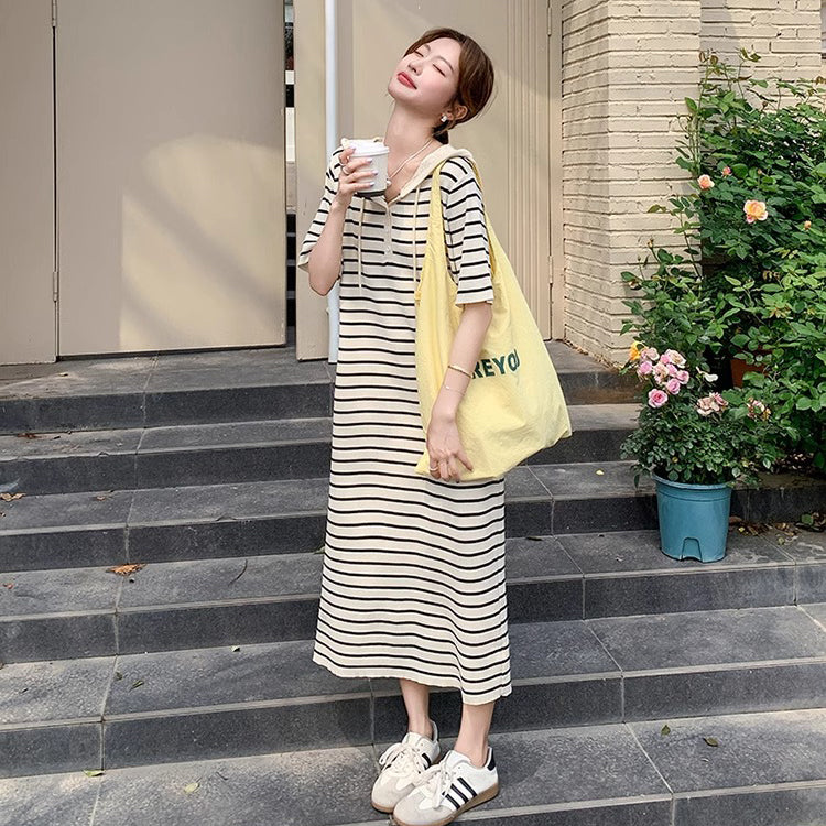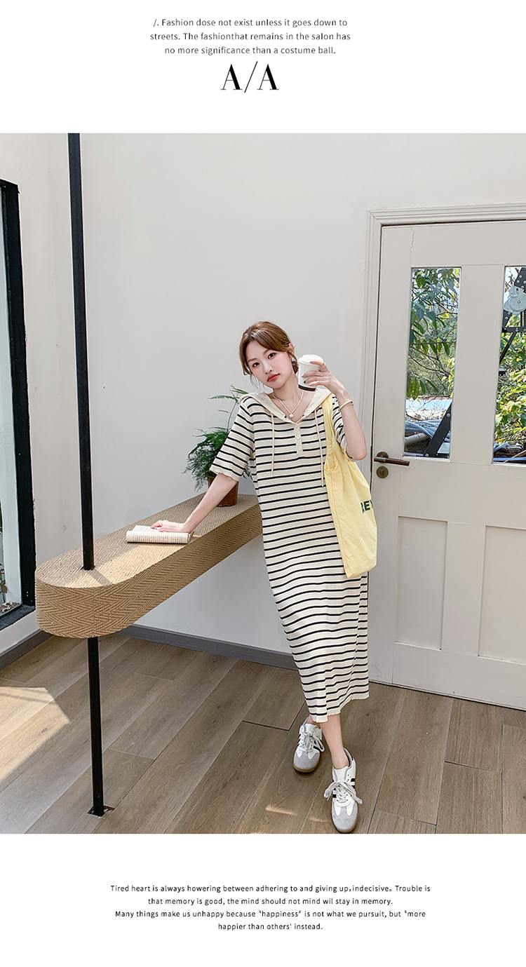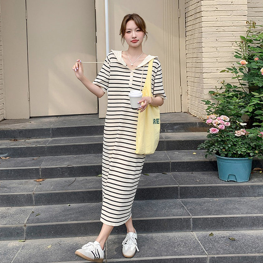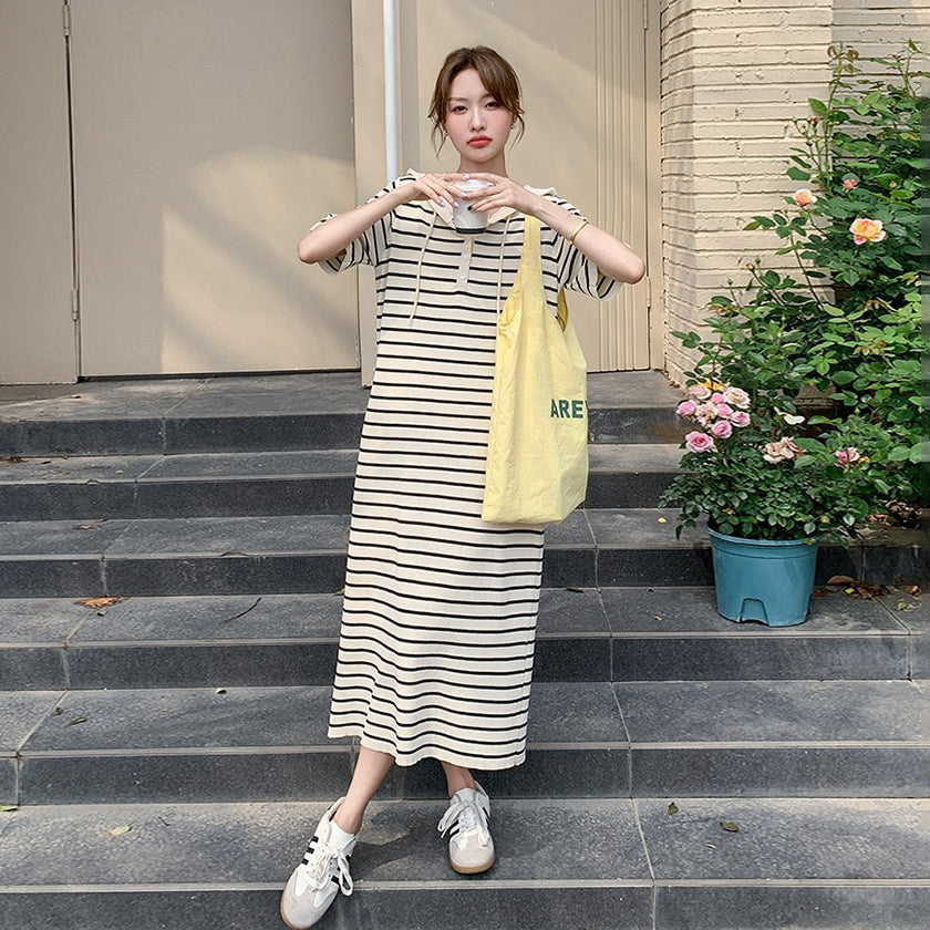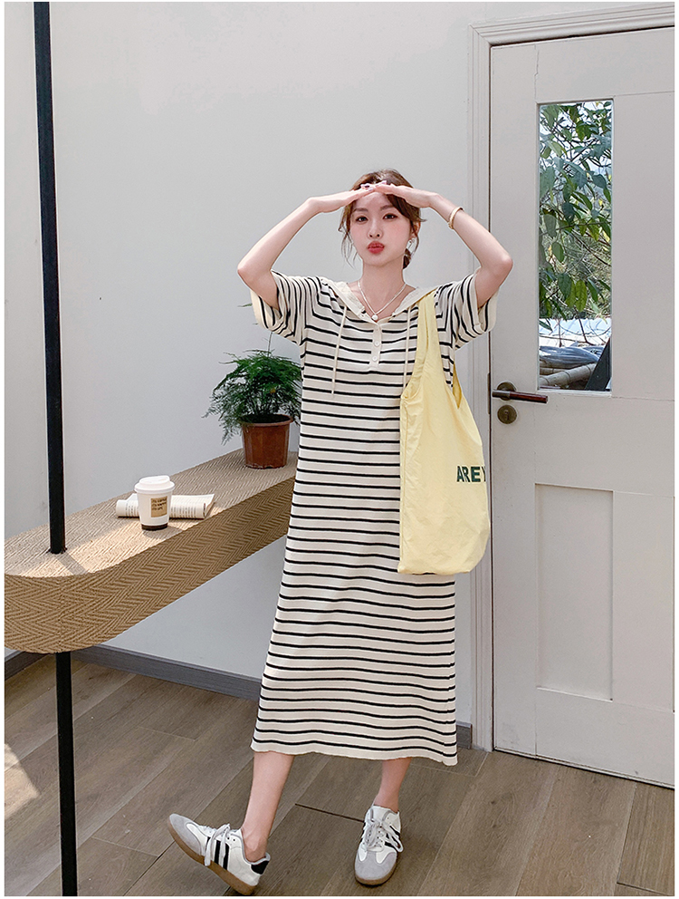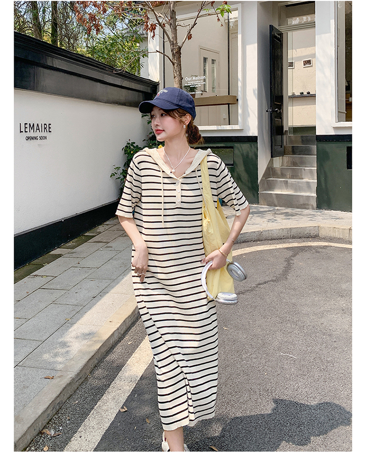 【ワンピース】透かし編みフード付きニットストライプ 半袖ワンピース レディース 夏 学院風 韓国風コーデ 【SHシリーズ】