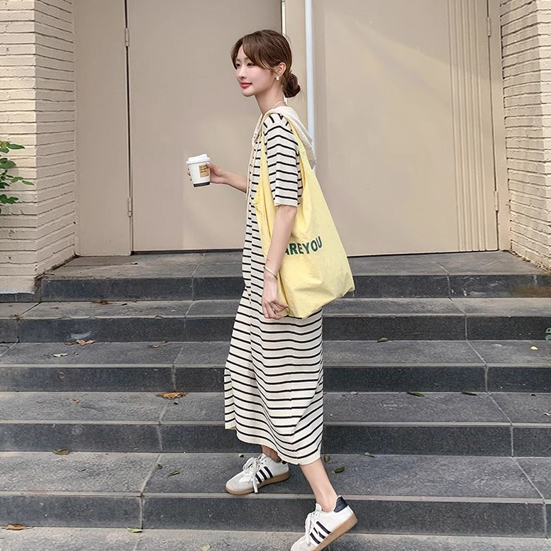 【商品名】【ワンピース】透かし編みフード付きニットストライプ 半袖ワンピース レディース 夏 学院風 韓国風コーデ 【SHシリーズ】
