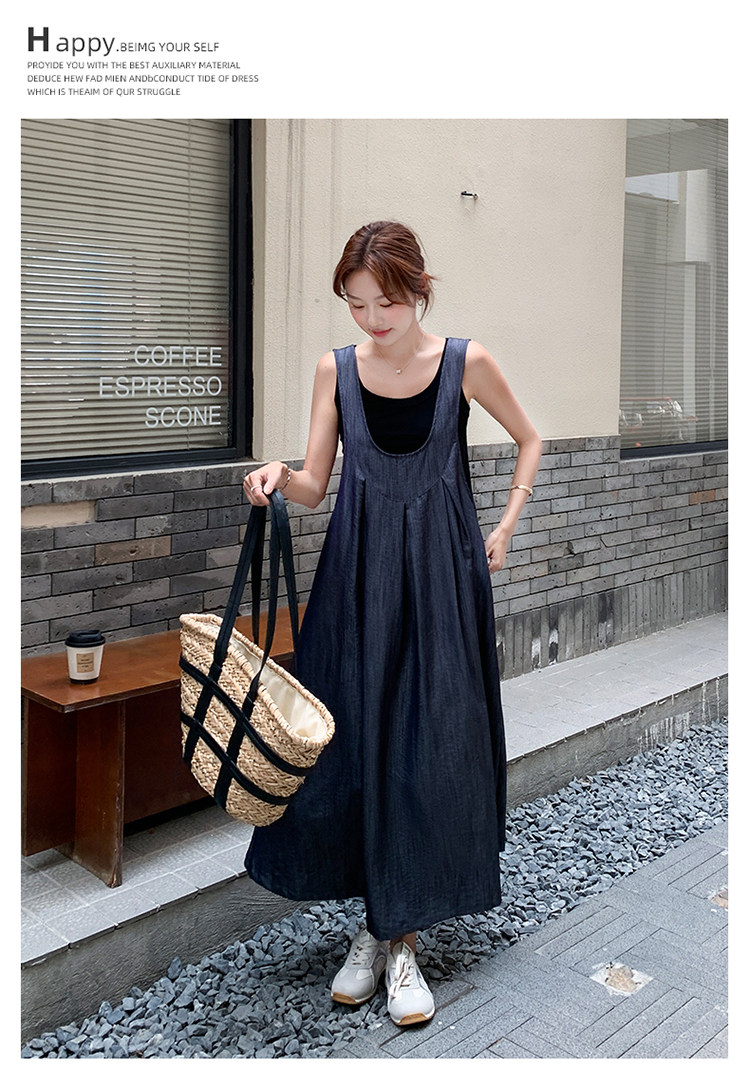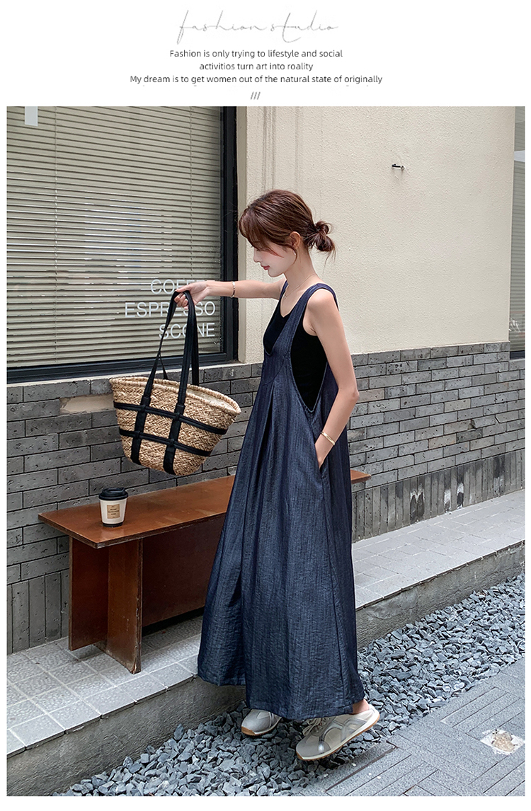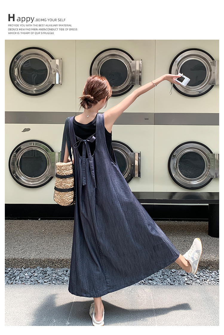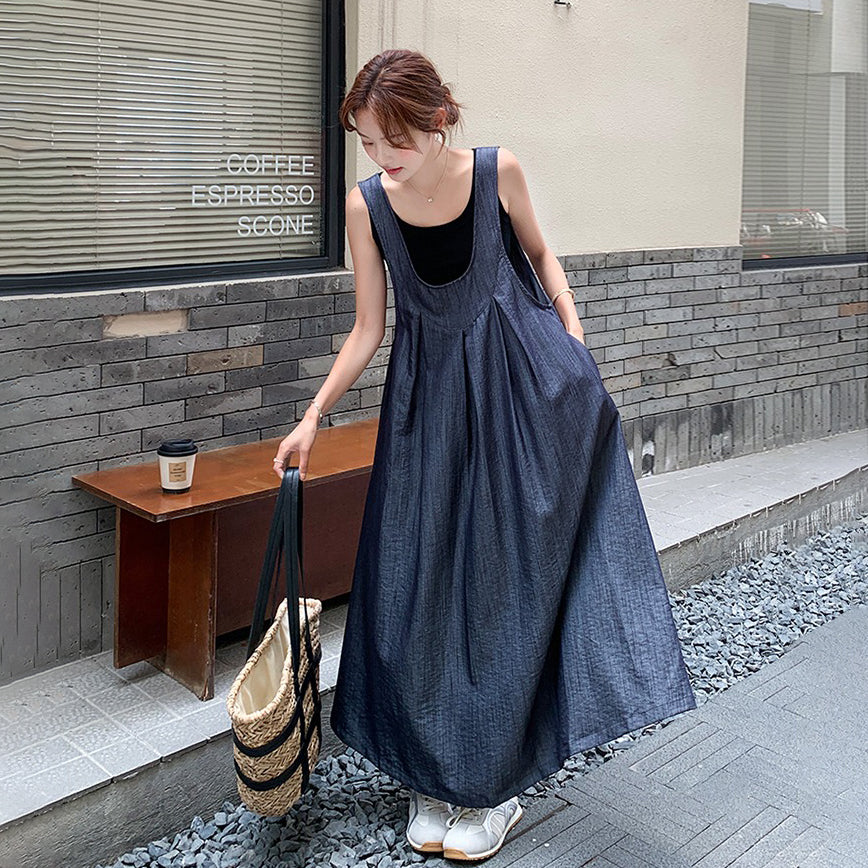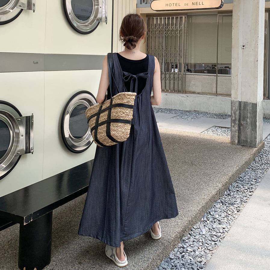 2点セット!【セットアップ】重ね着でおしゃれ ノースリーブ デニムサロペットワンピースセット レディース 夏 学院風 若見え スリム見え 体型カバー【JZシリーズ】