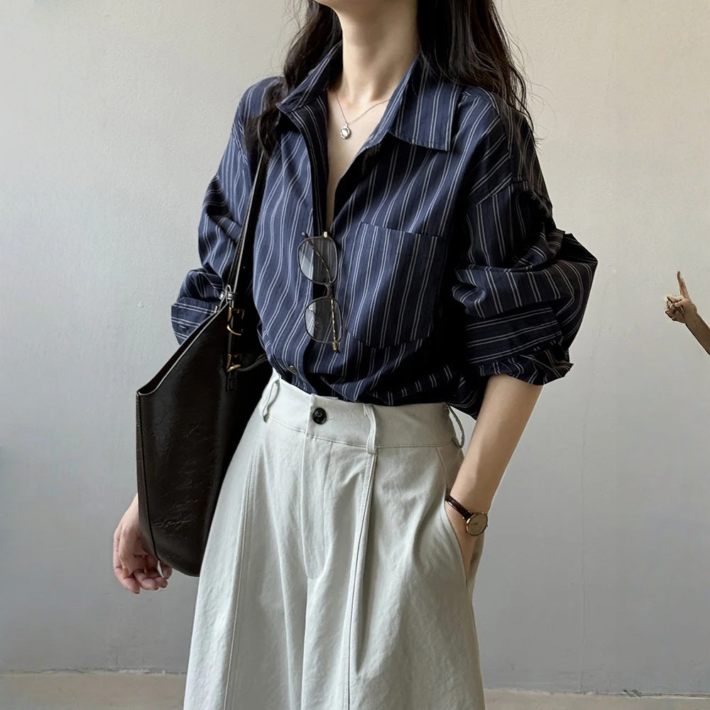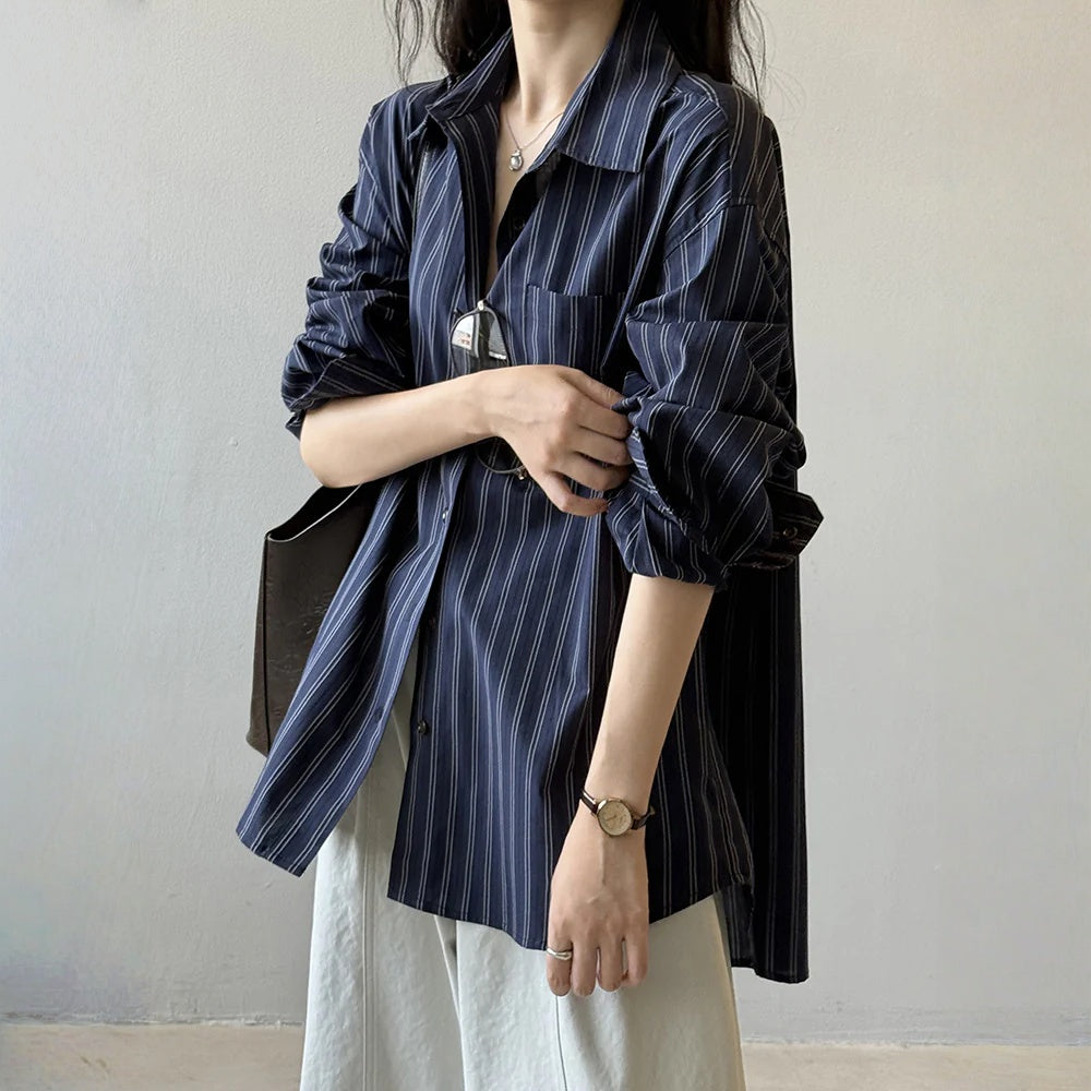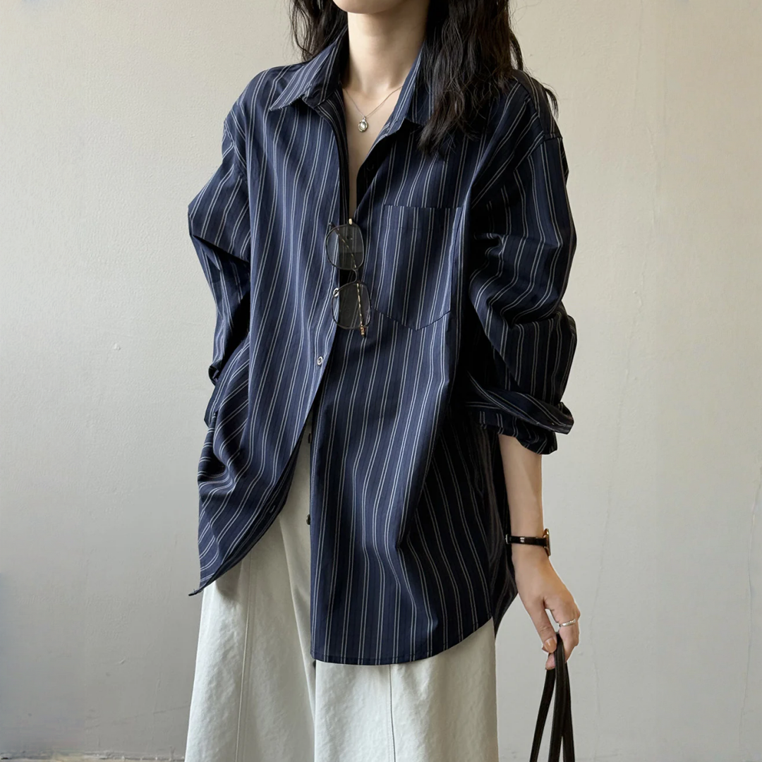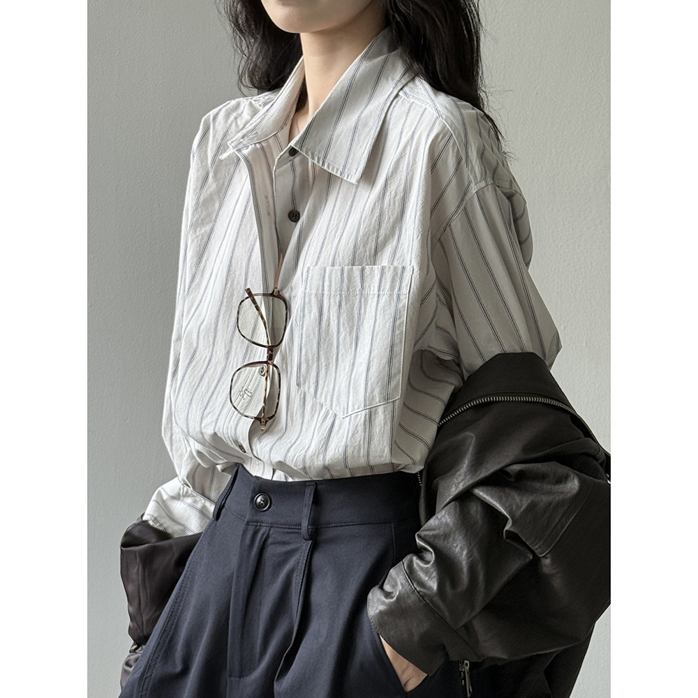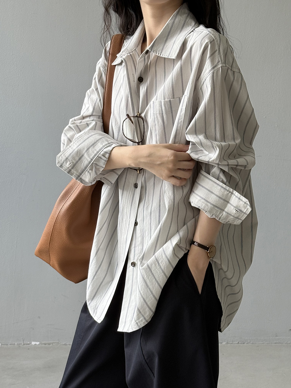 【商品名】【トップス】春 秋 夏 冬 ストライプ柄 立襟 長袖 シャツ 【JZシリーズ】