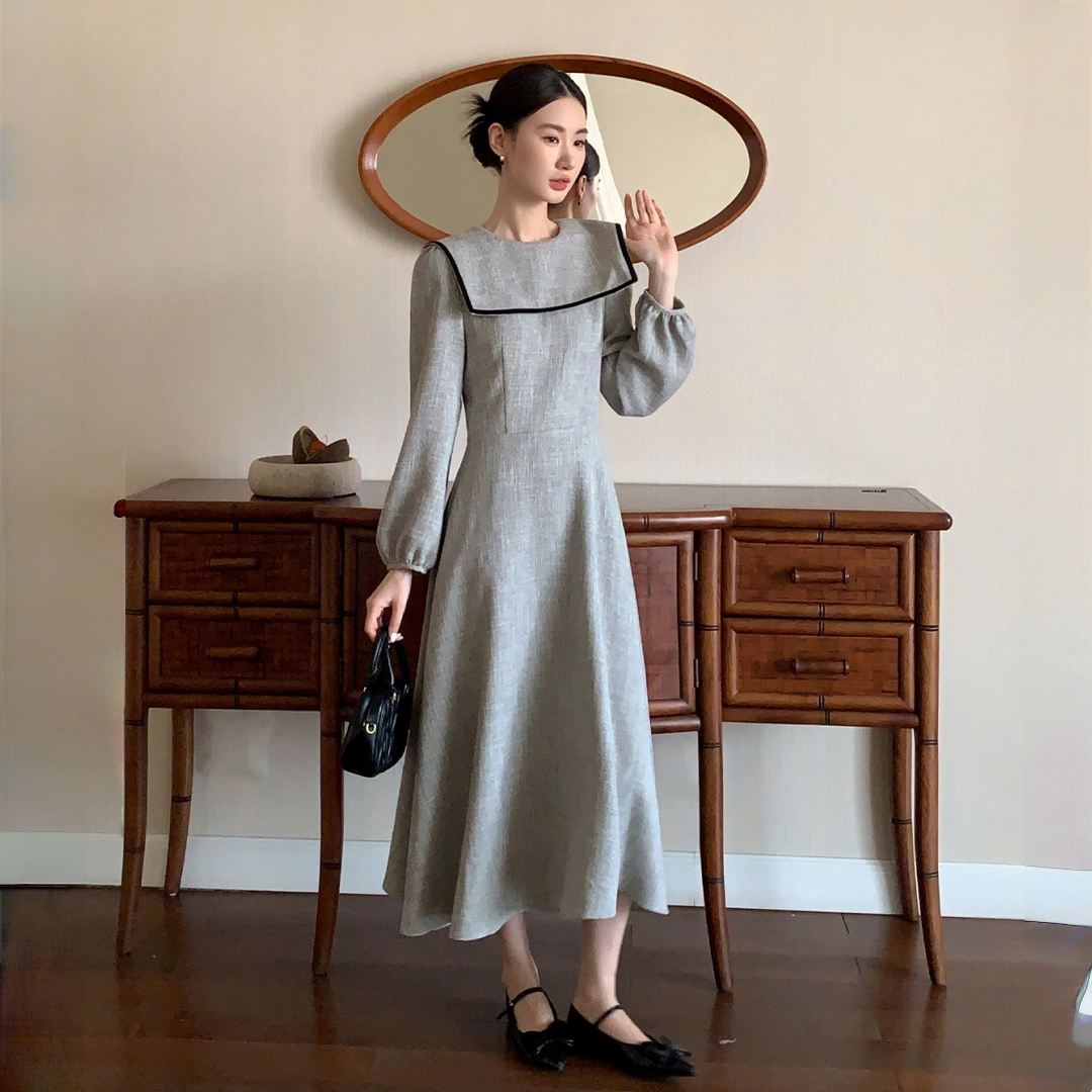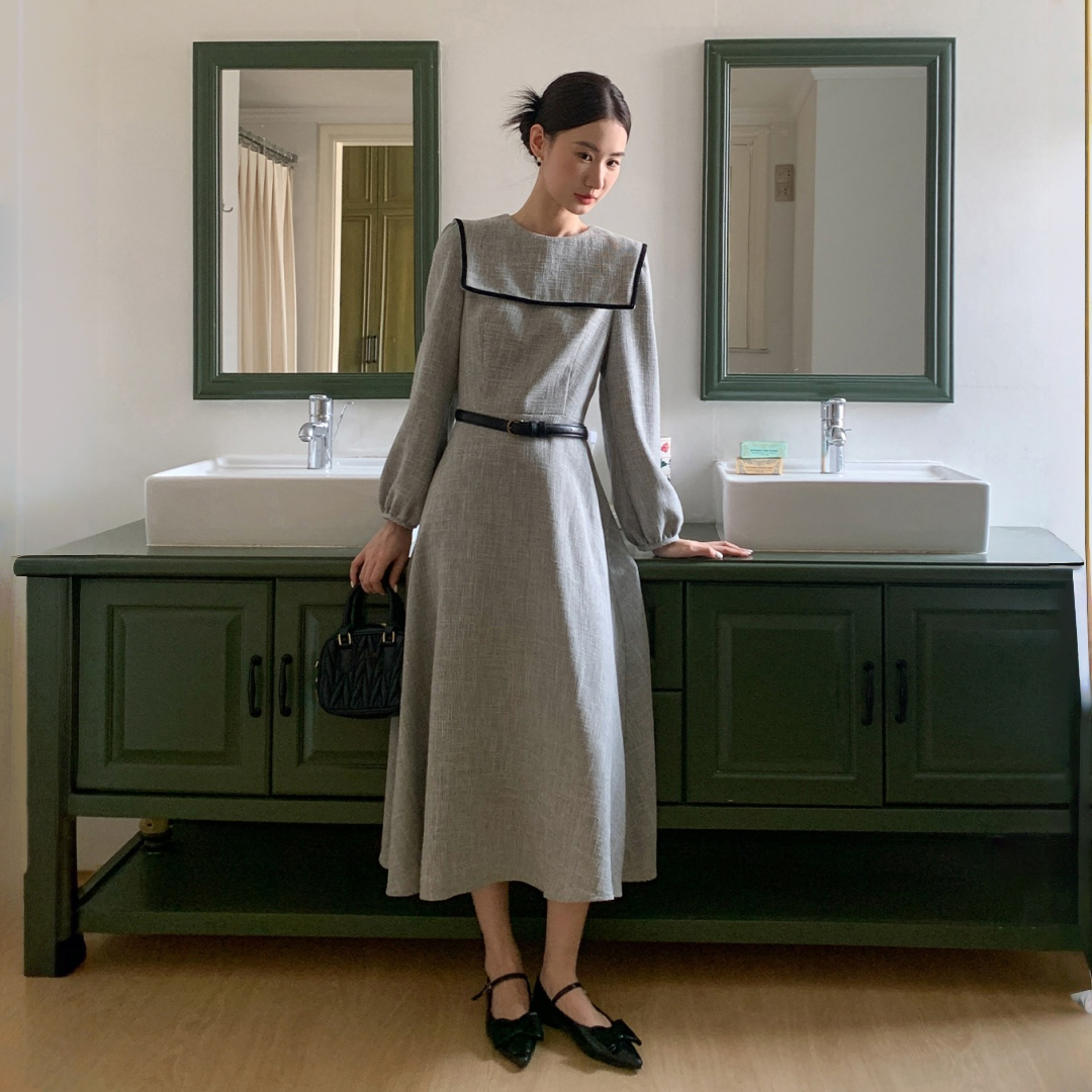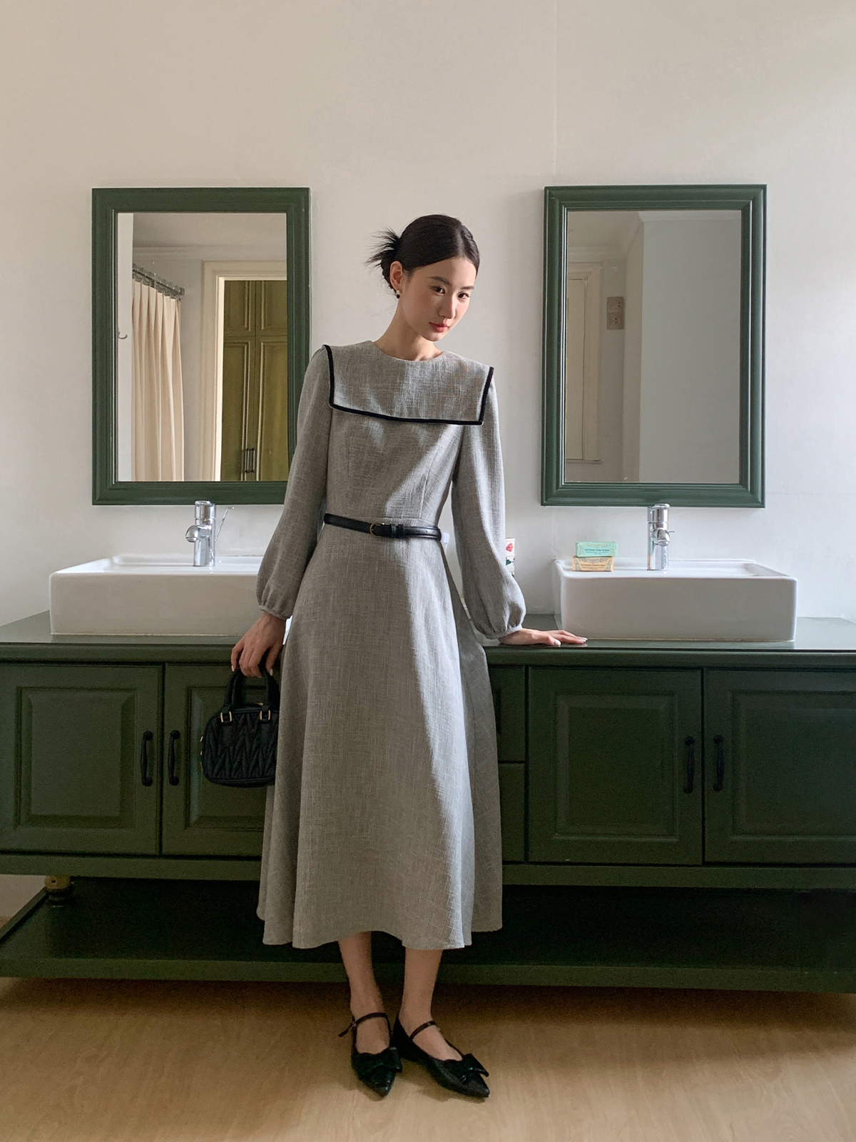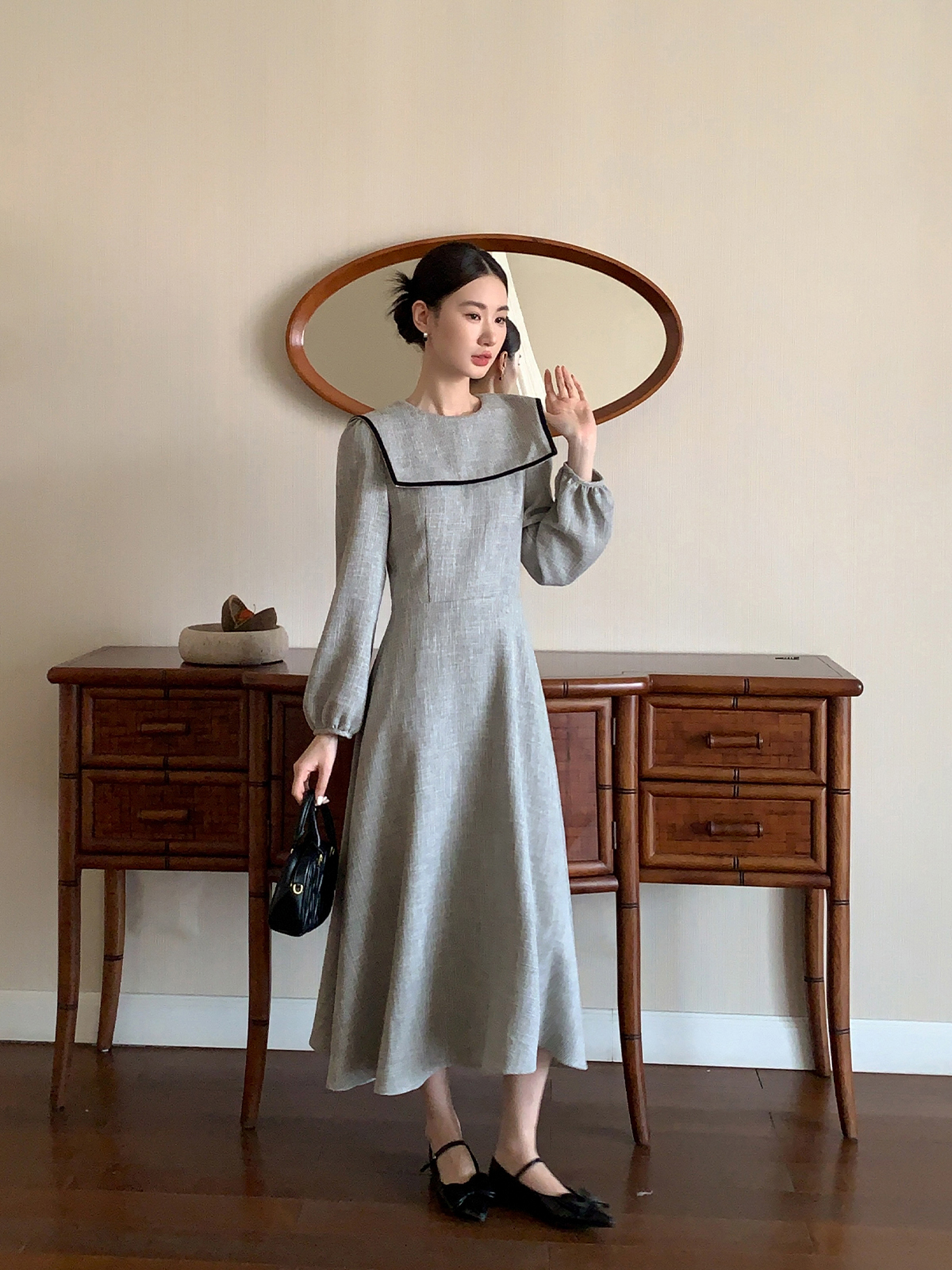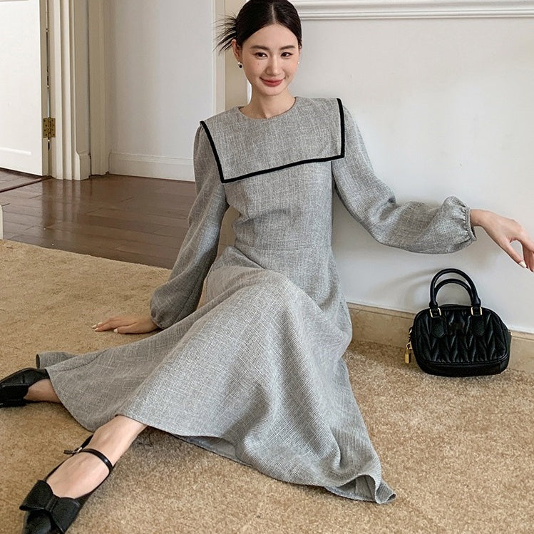 【ワンピース】春 秋 冬 マリン大きめ襟 甘く若見え ウエストシェイプ 長袖 ワンピース 【JZシリーズ】