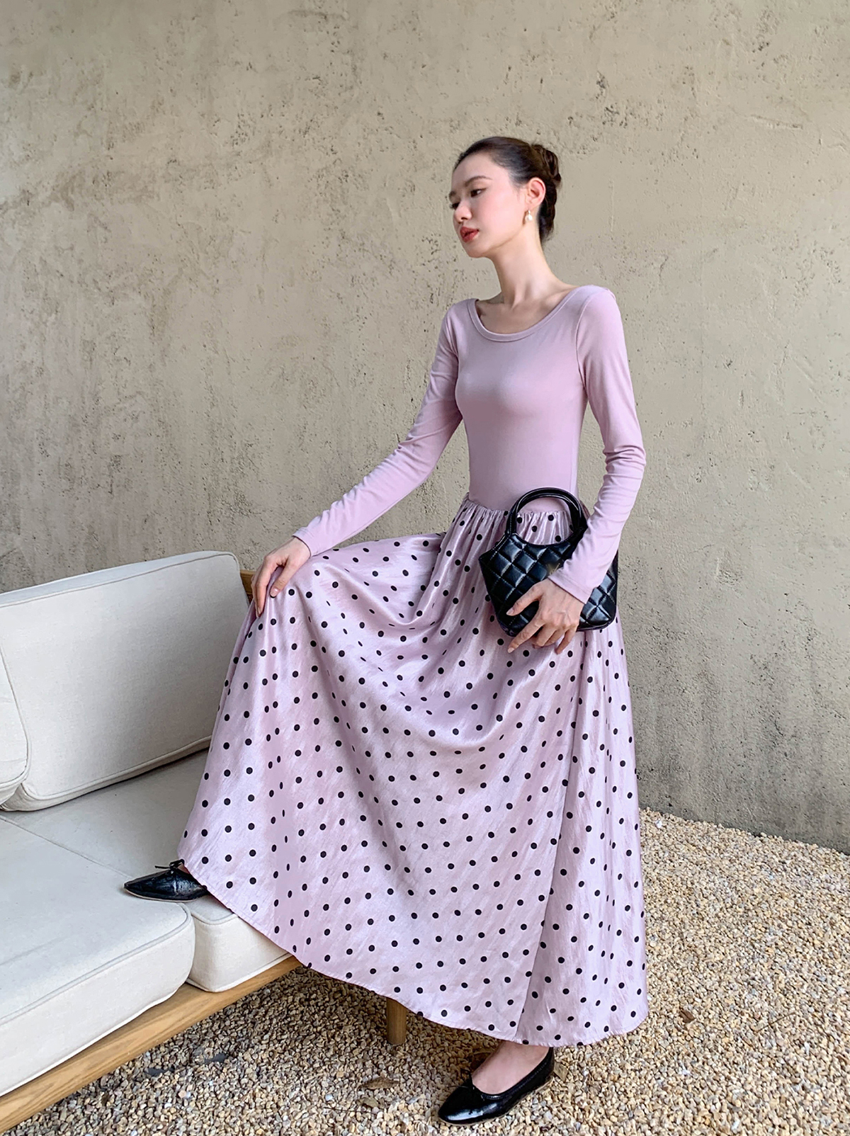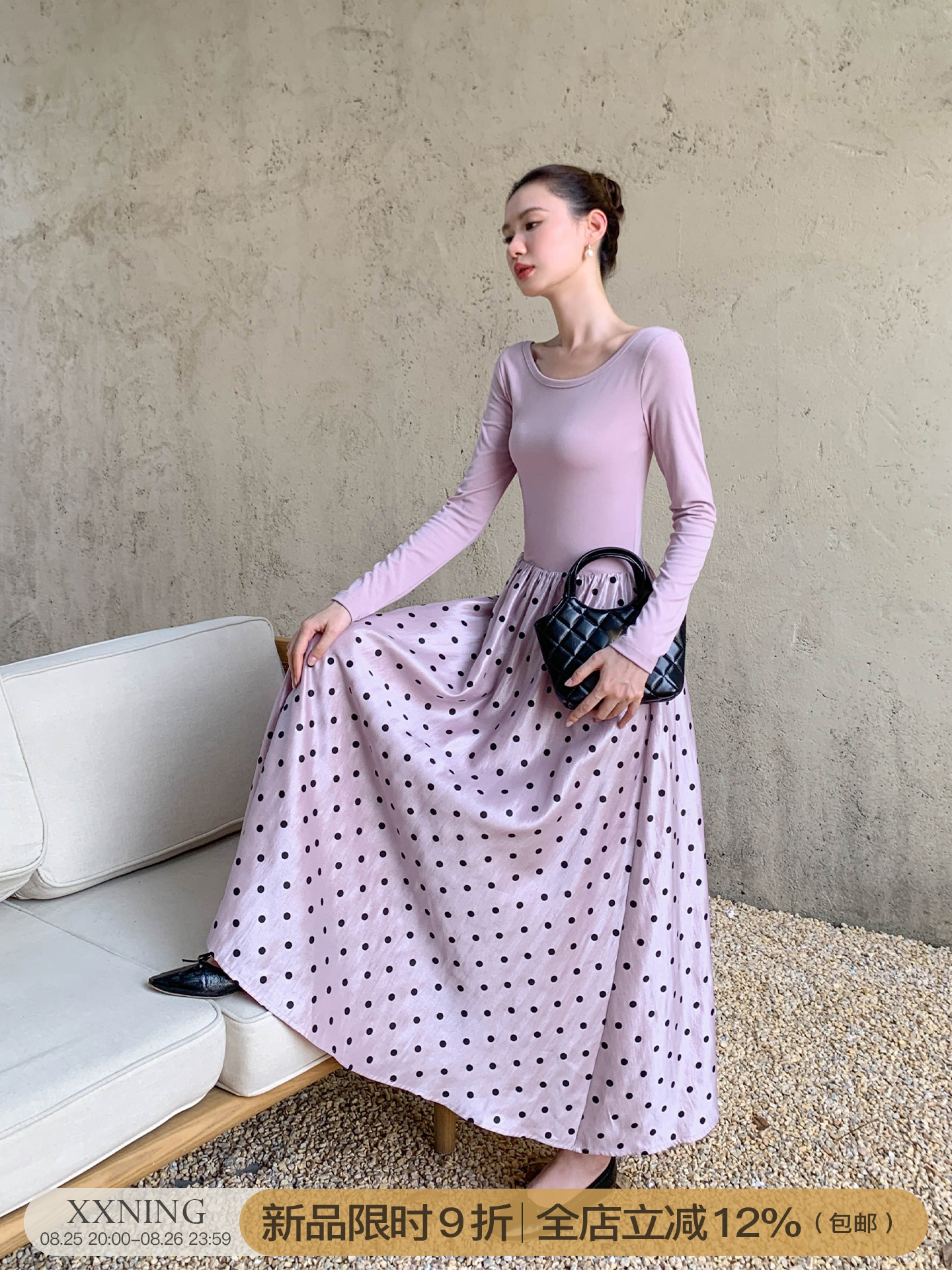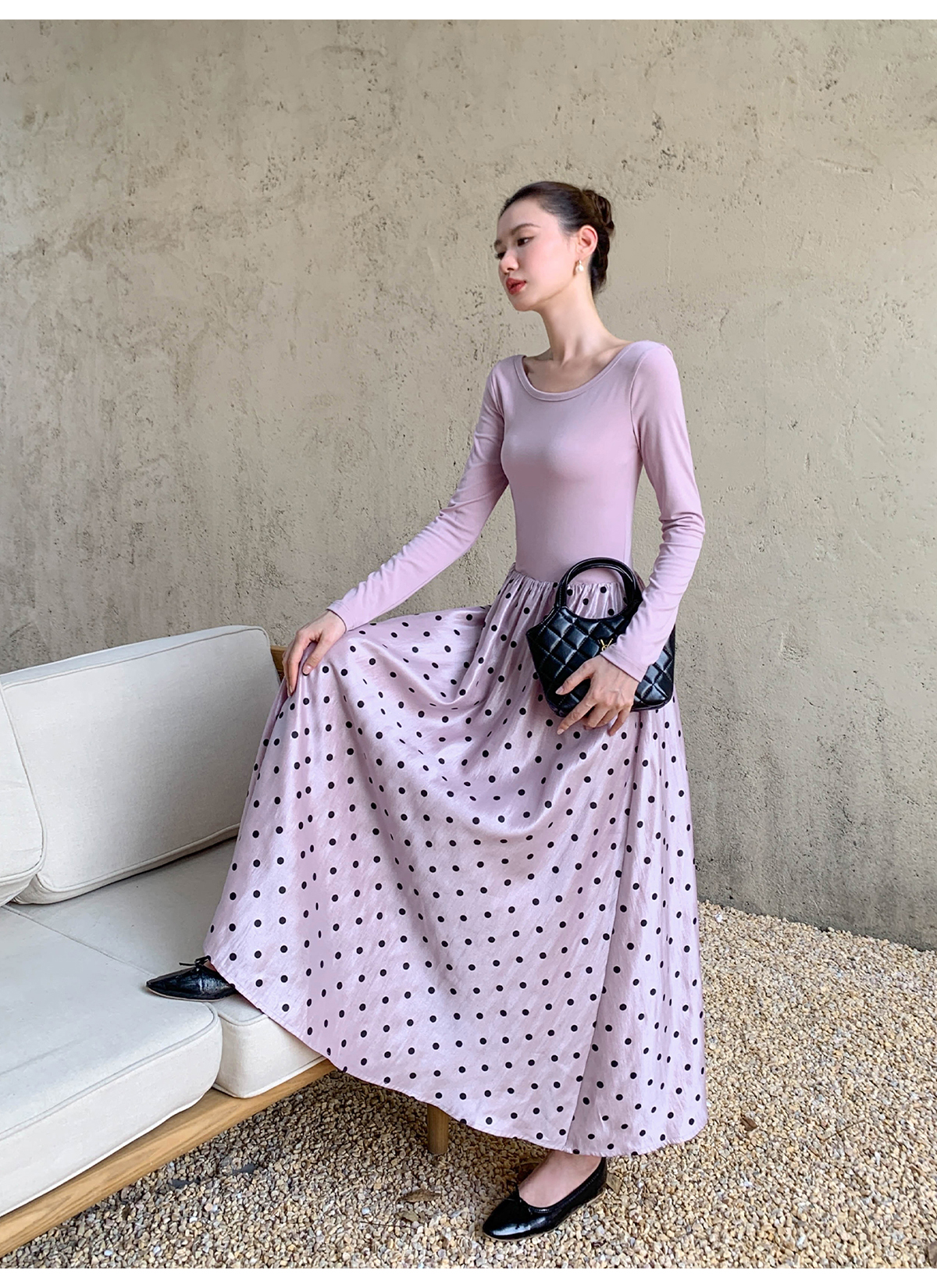 【ワンピース】細見え 日系 Vネック 無地 長袖ワンピース 切替デザイン ゆったり 気質ロング【JZシリーズ】【AHシリーズ】