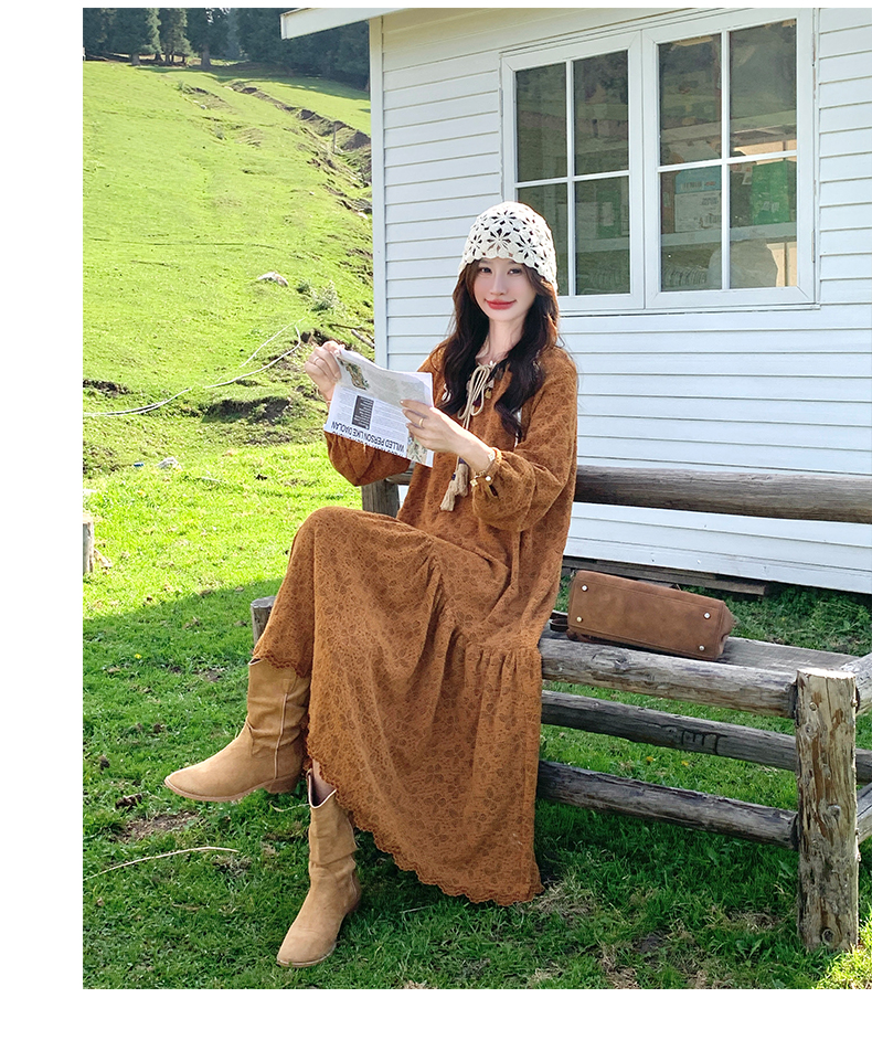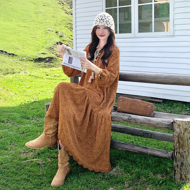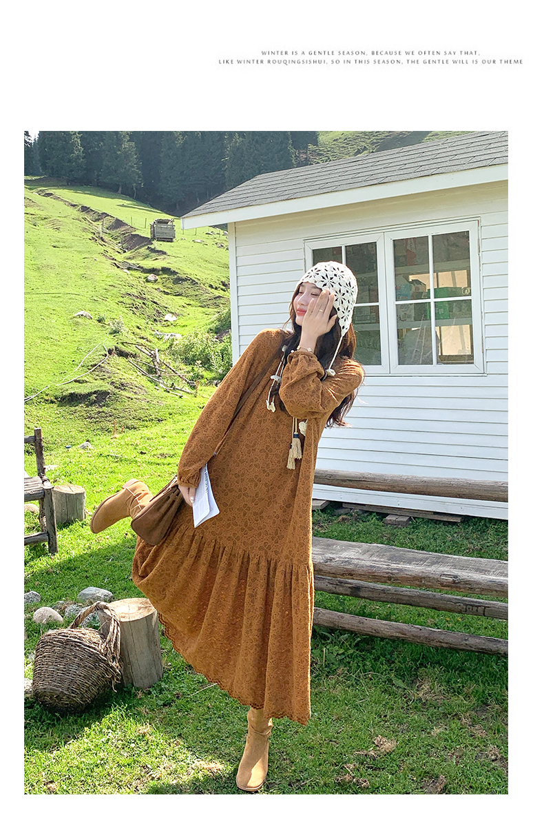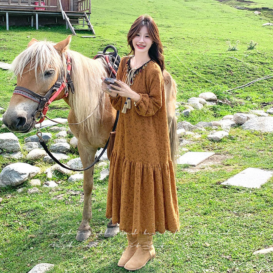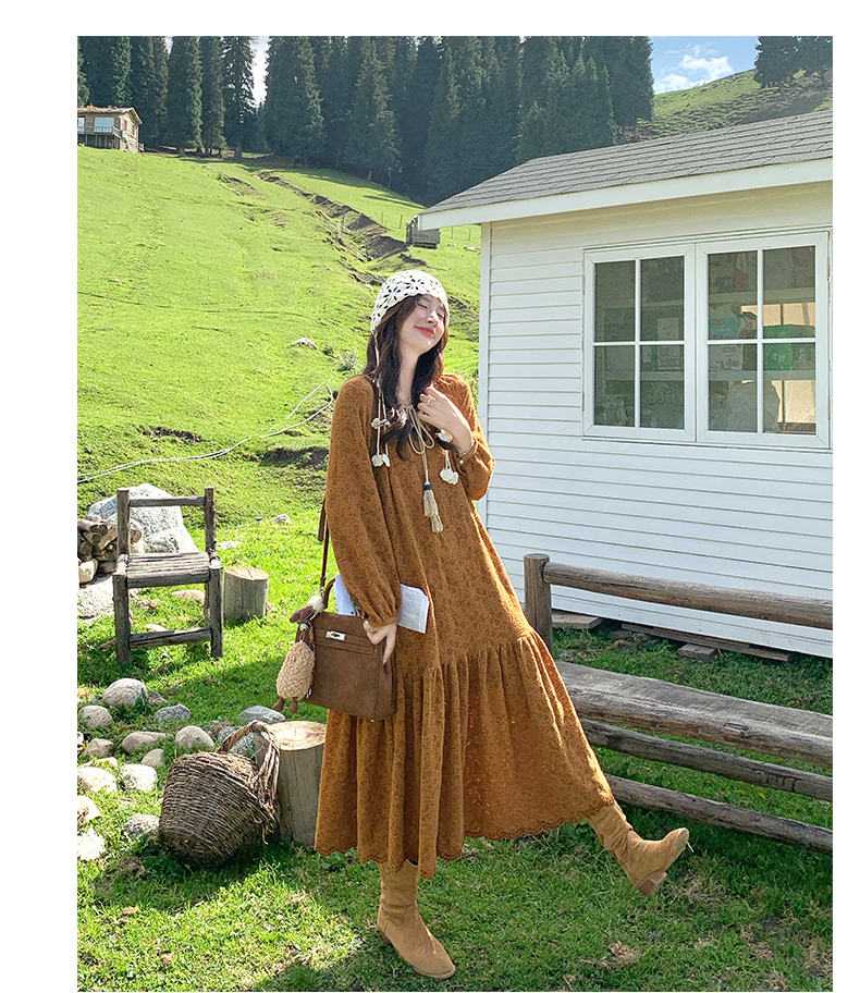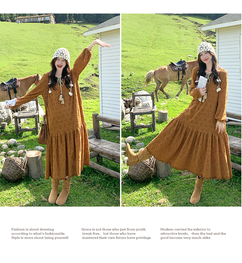 【ワンピース】起毛素材 チェック柄 レトロ クルーネック 長袖 ワンピース 【JZシリーズ】