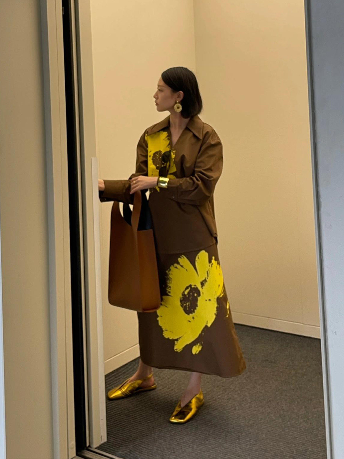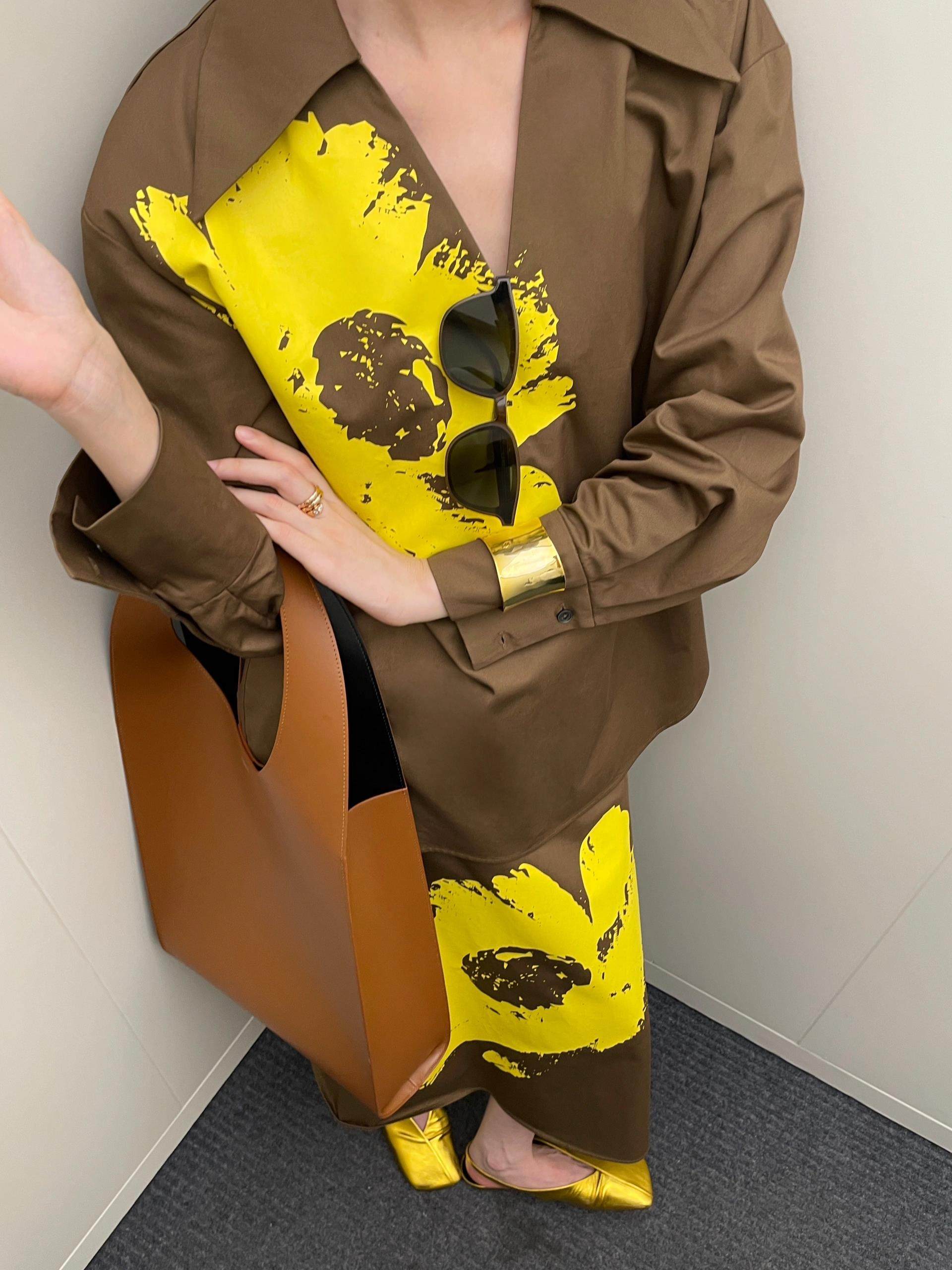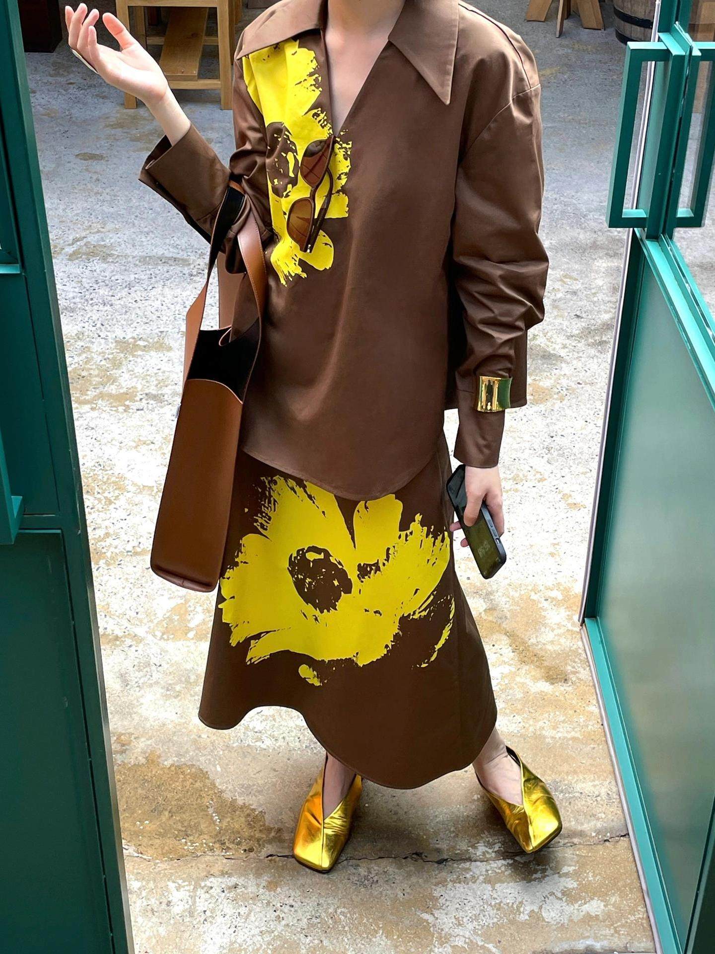 【単品注文】【セットアップ】フレンチレトロ ブラウンプリント シャツ+スカート 上下セット レディース 通勤エレガント 秋向け コーディネート【SHシリーズ】