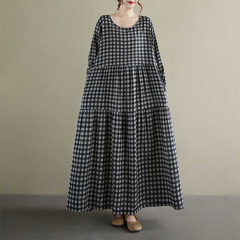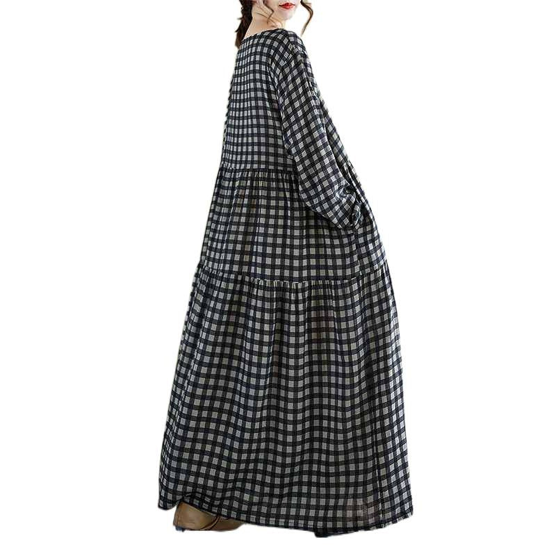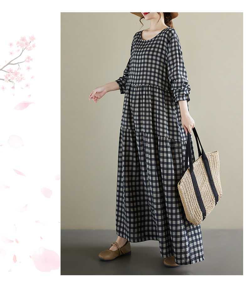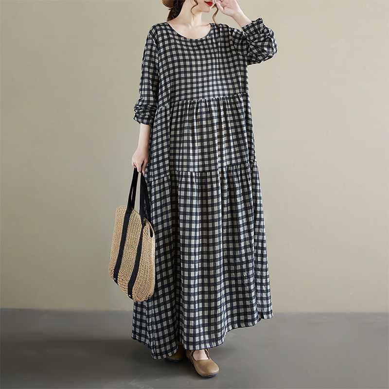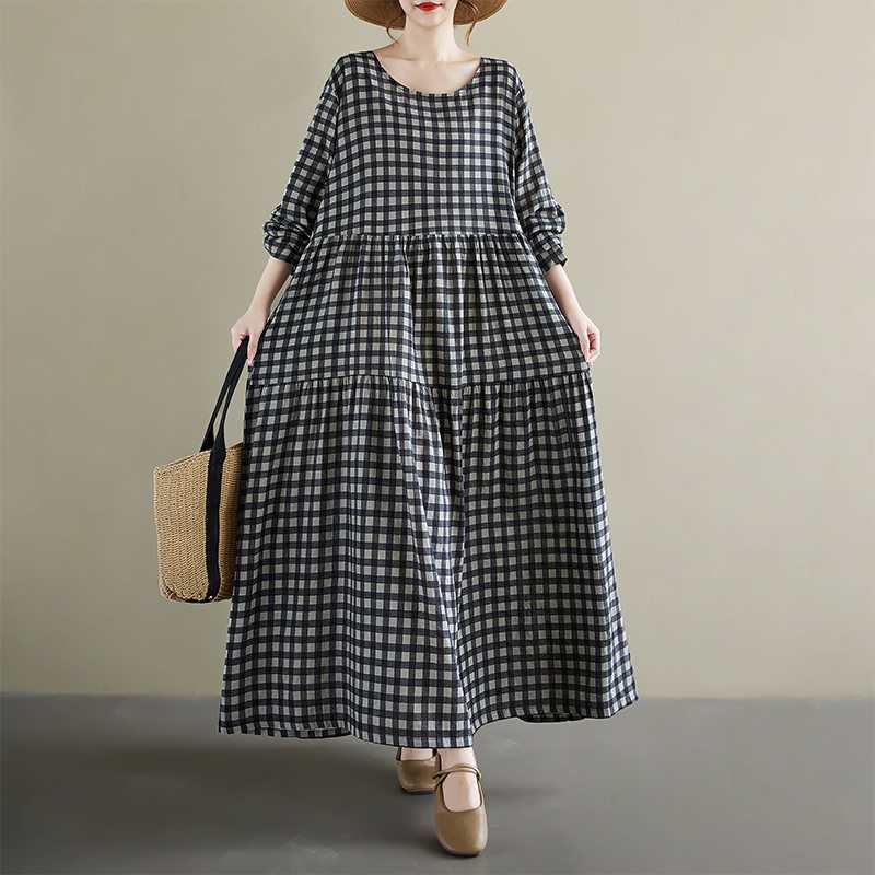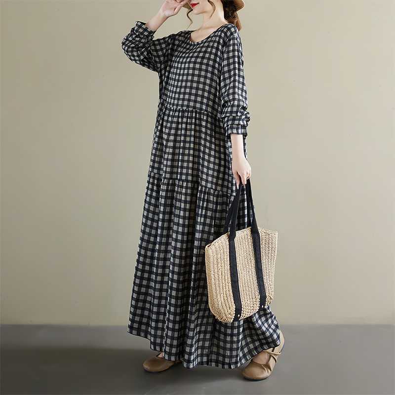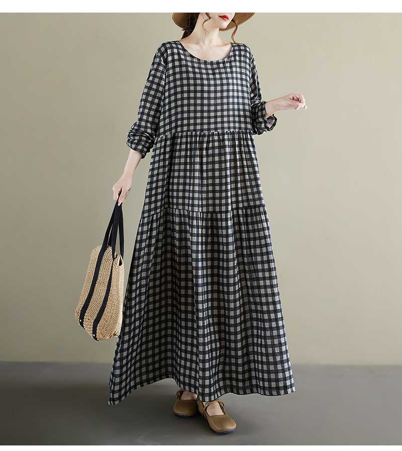 【ワンピース】起毛素材 チェック柄 レトロ クルーネック 長袖 ワンピース 【JZシリーズ】