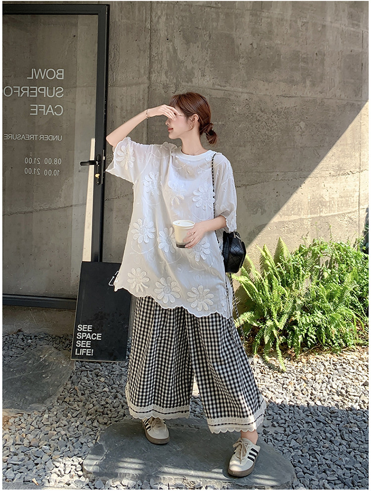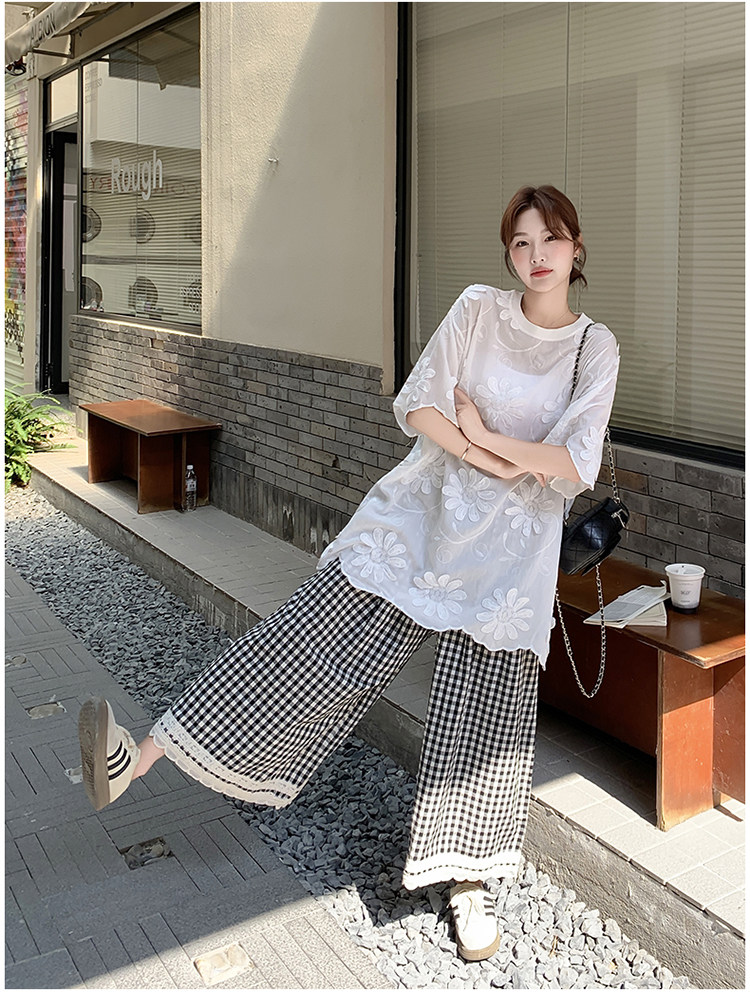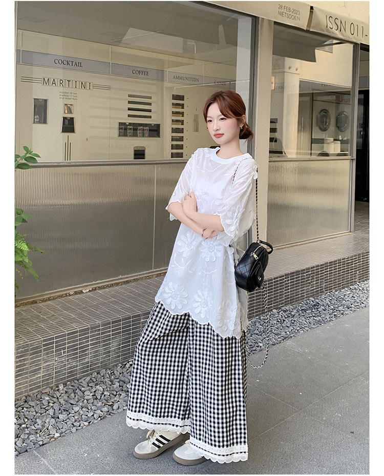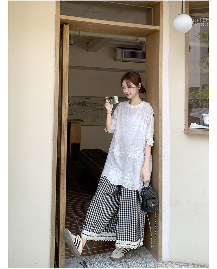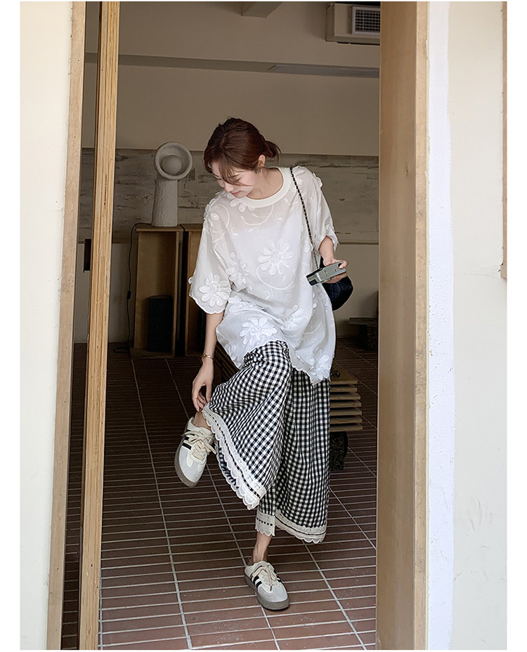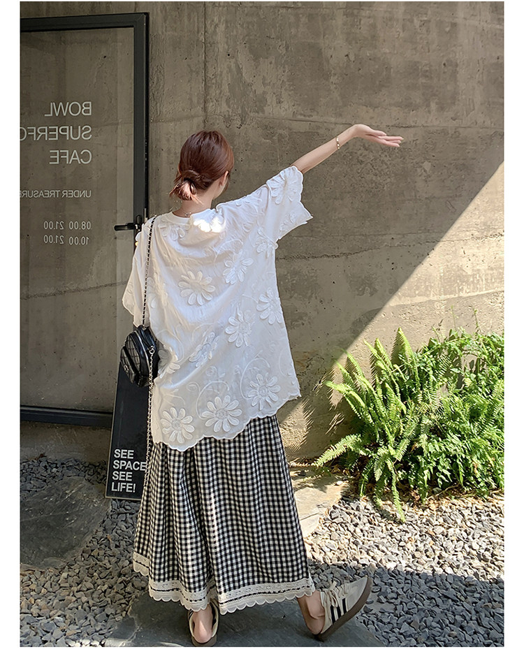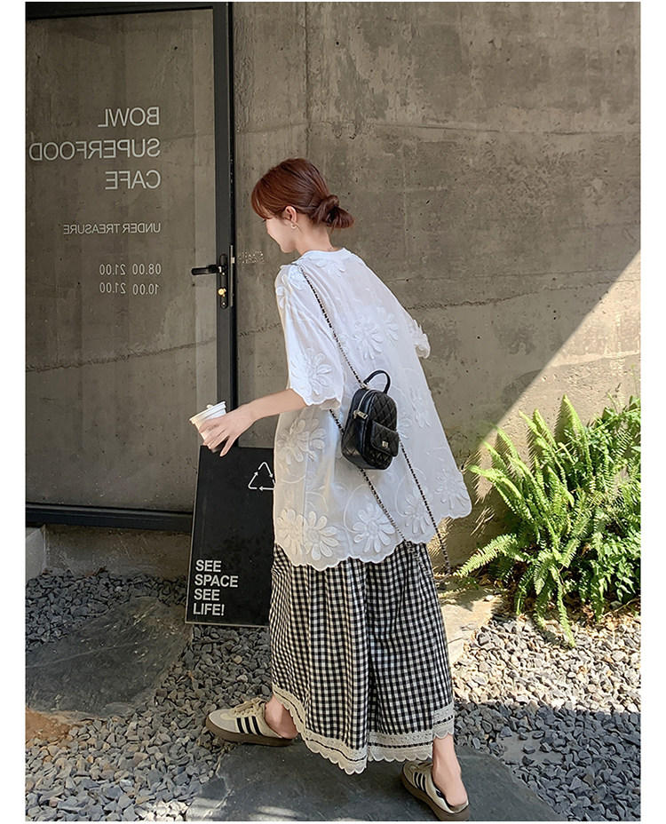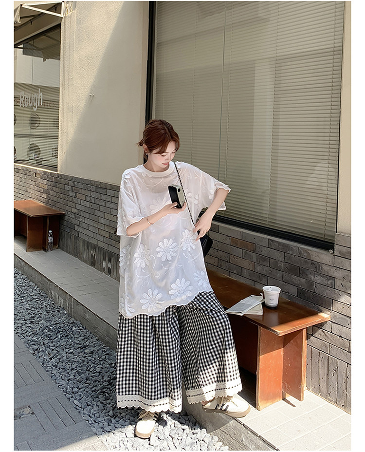 2点セット!【セットアップ】立体フラワー刺繍シャツ+チェックワイドパンツ 上下セット レディース 夏 リラックス感 上品カジュアル【SHシリーズ】