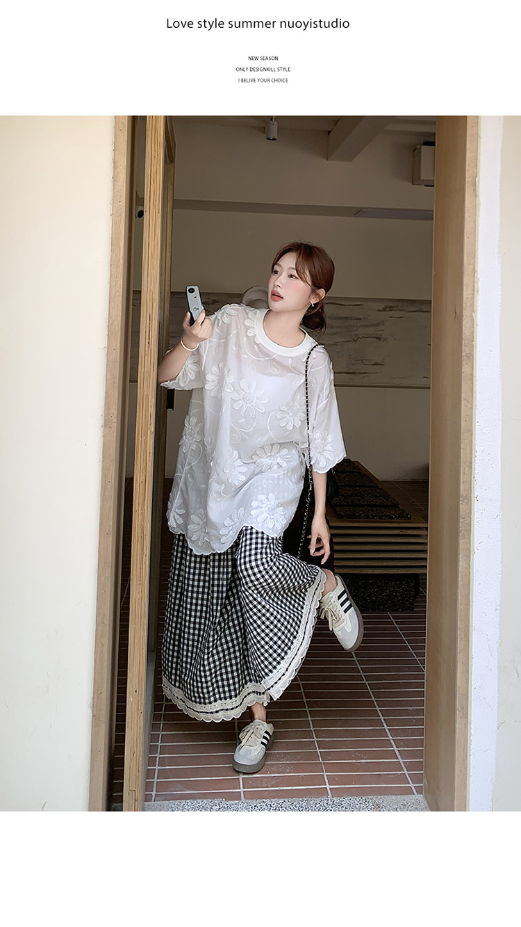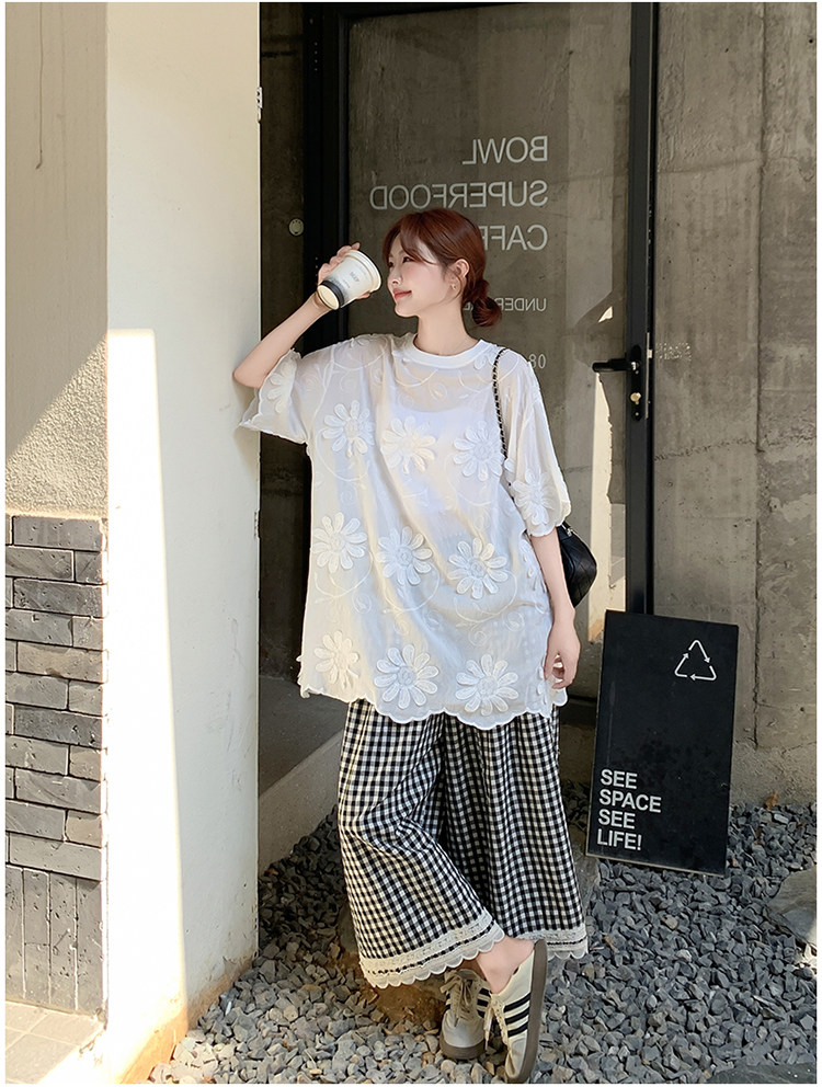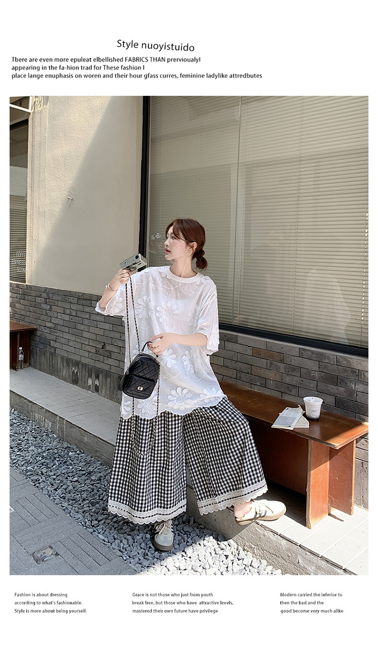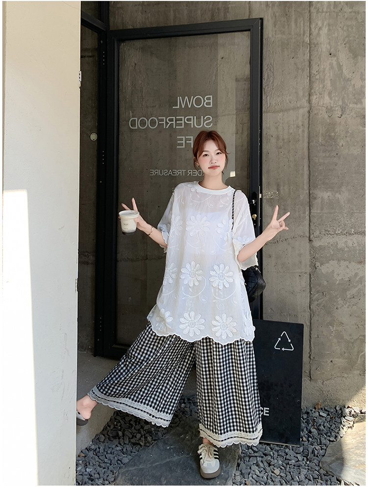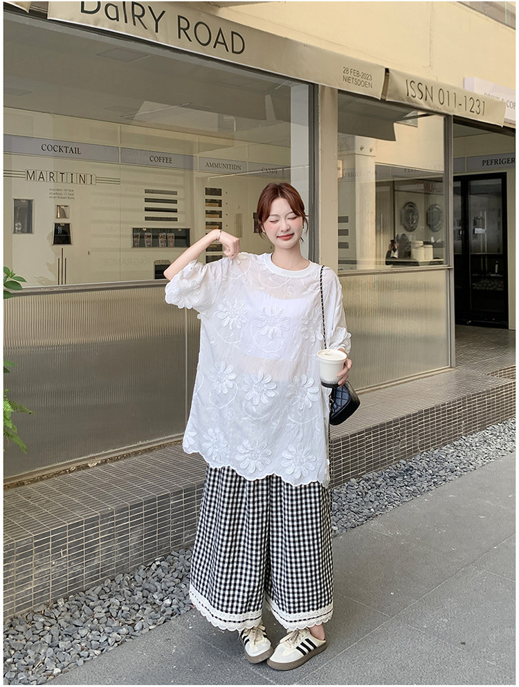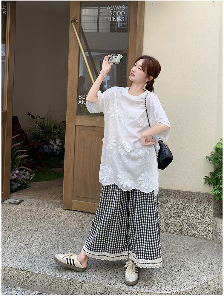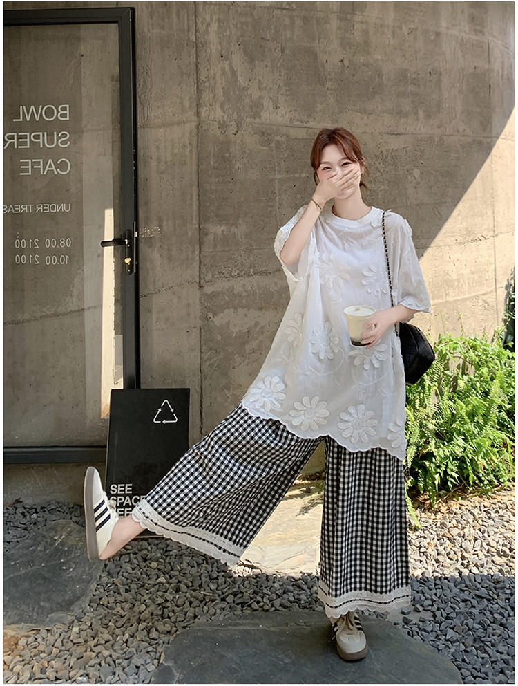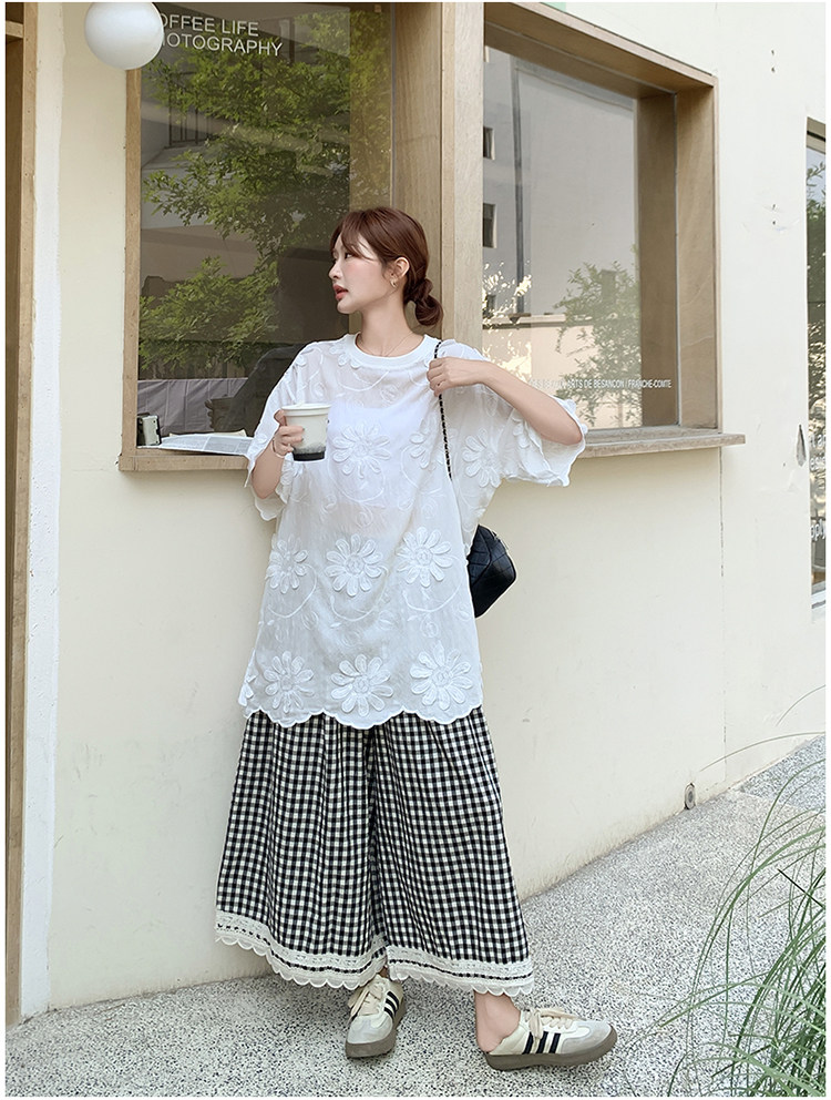 2点セット!【セットアップ】立体フラワー刺繍シャツ+チェックワイドパンツ 上下セット レディース 夏 リラックス感 上品カジュアル【SHシリーズ】