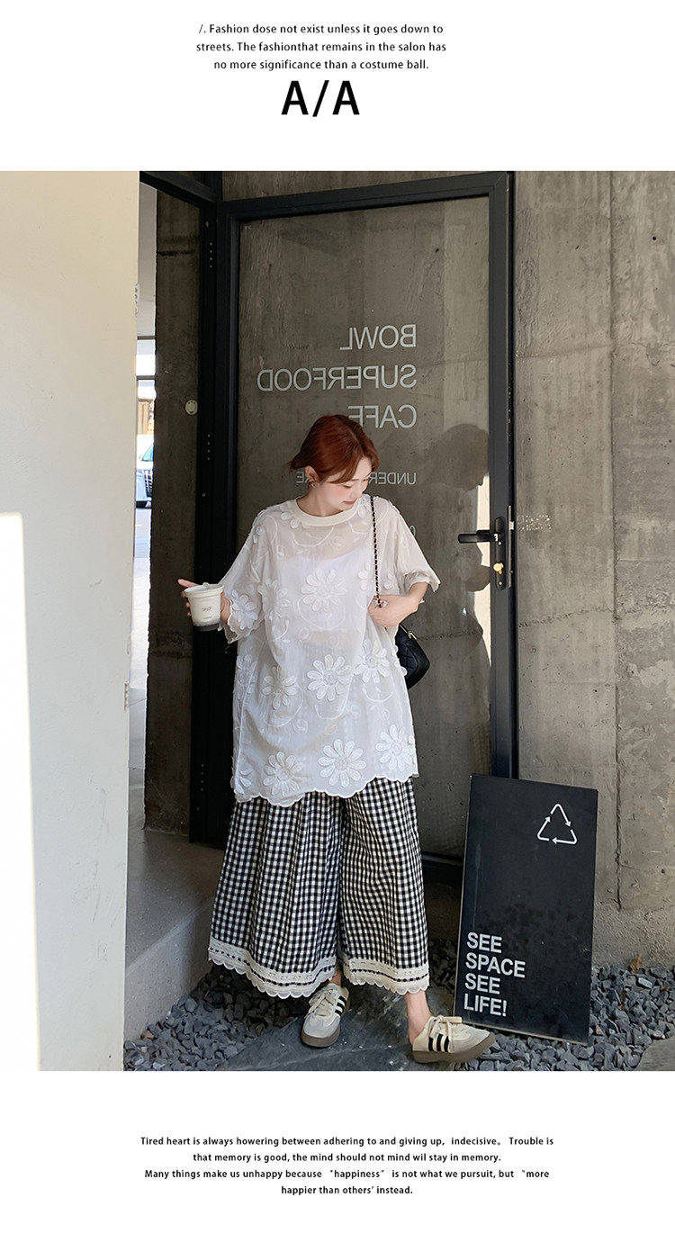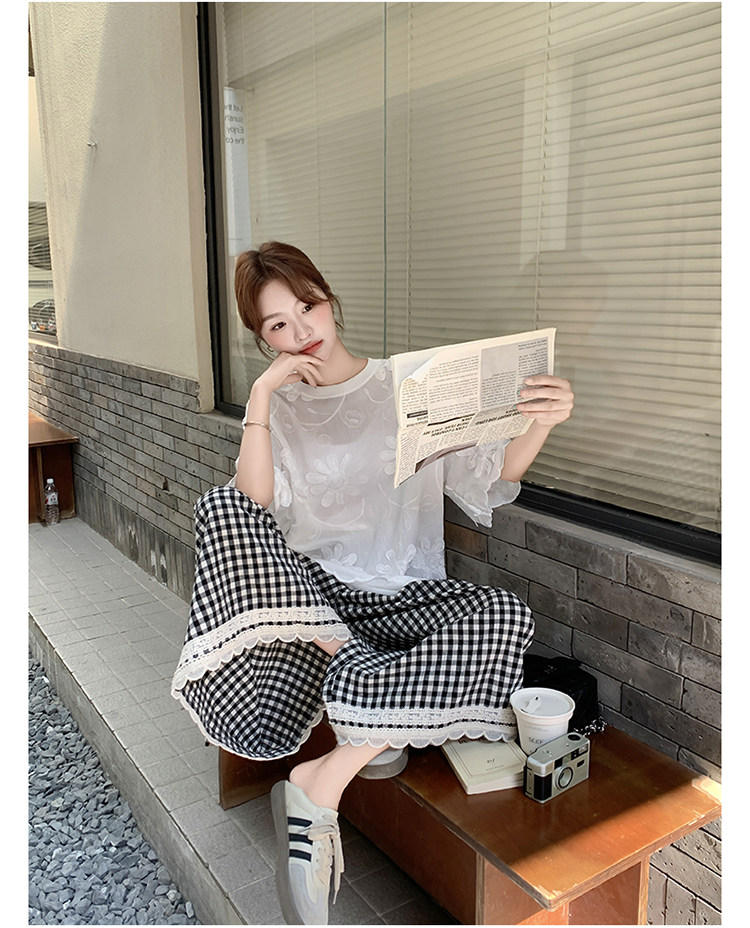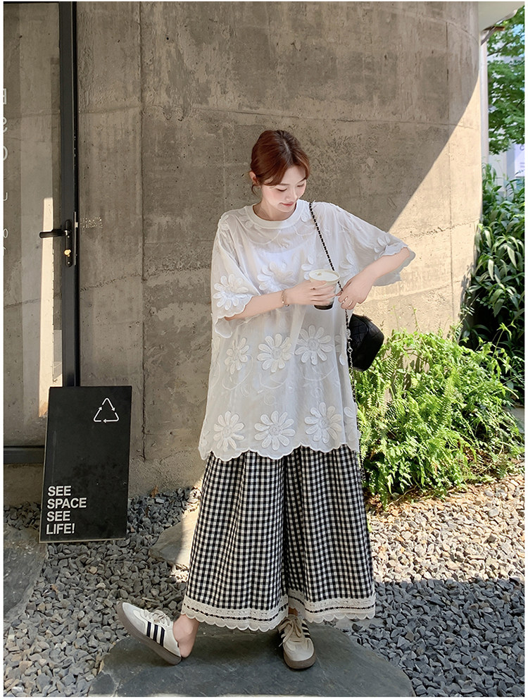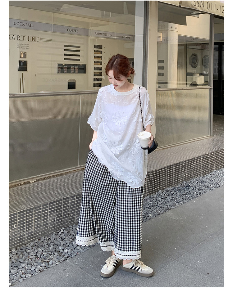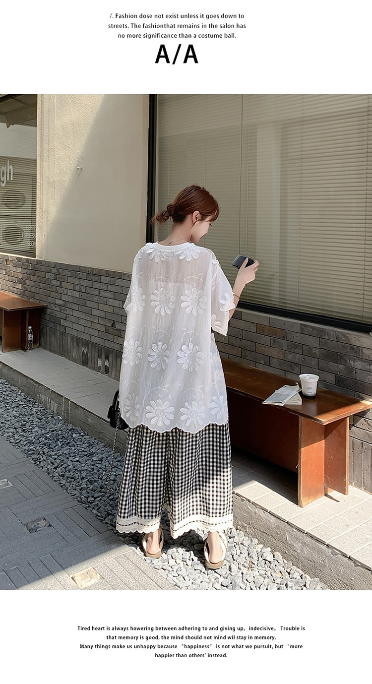 【商品名】2点セット!【セットアップ】立体フラワー刺繍シャツ+チェックワイドパンツ 上下セット レディース 夏 リラックス感 上品カジュアル【SHシリーズ】