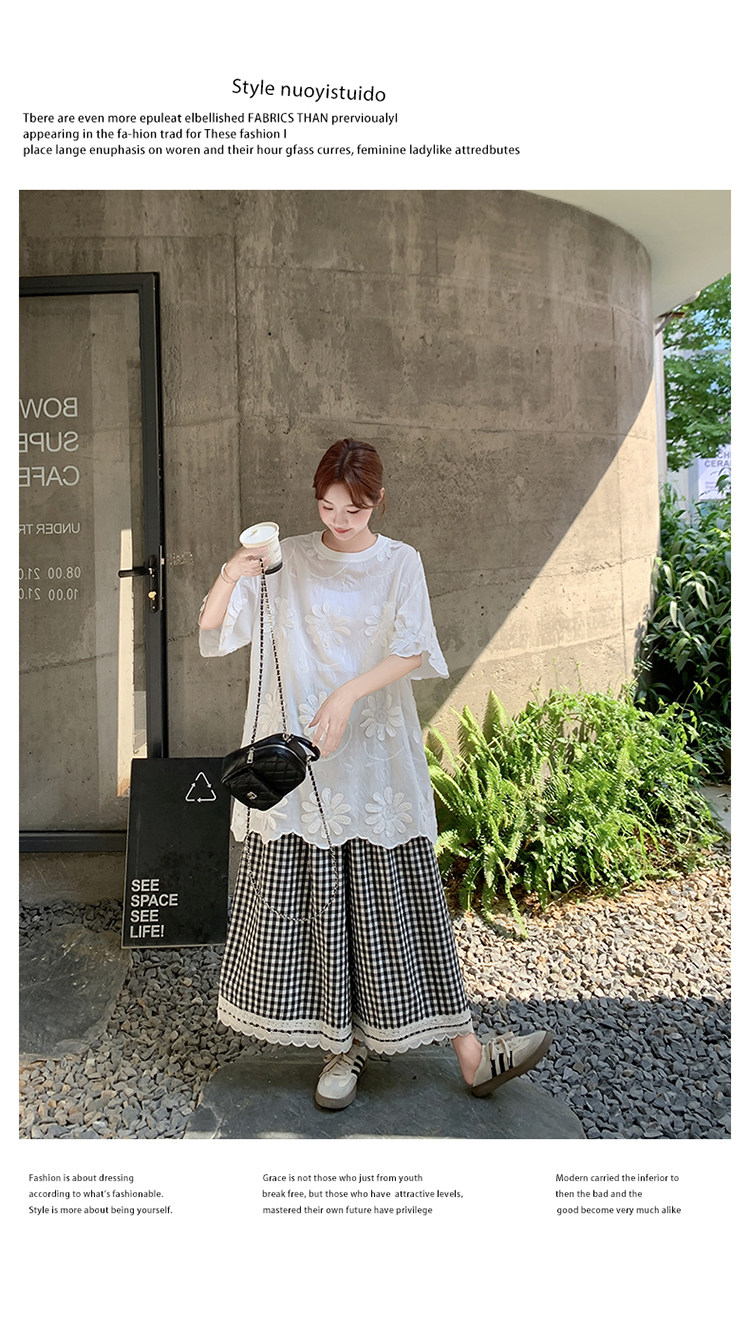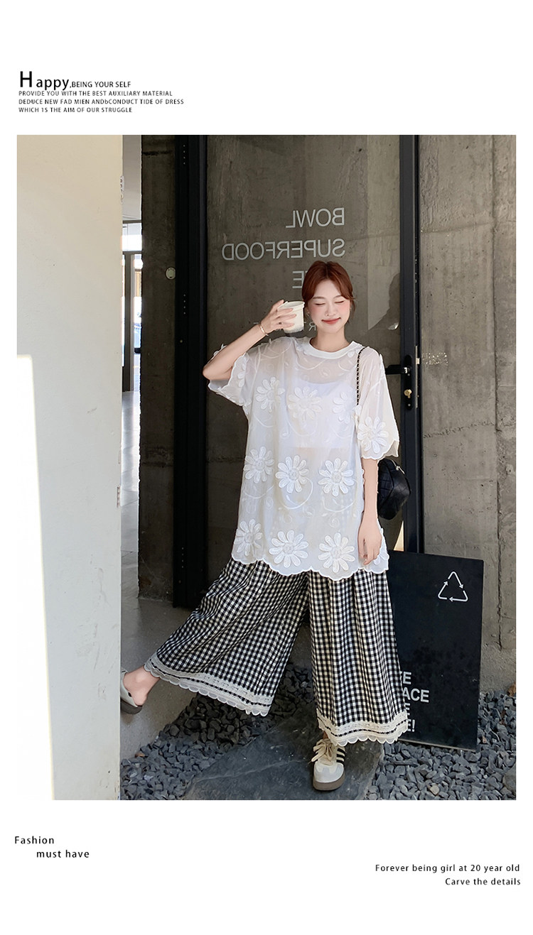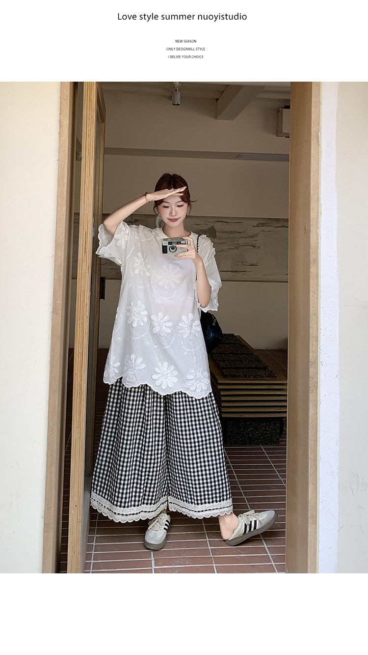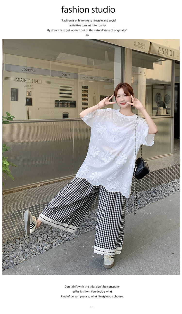 【商品名】2点セット!【セットアップ】立体フラワー刺繍シャツ+チェックワイドパンツ 上下セット レディース 夏 リラックス感 上品カジュアル【SHシリーズ】
