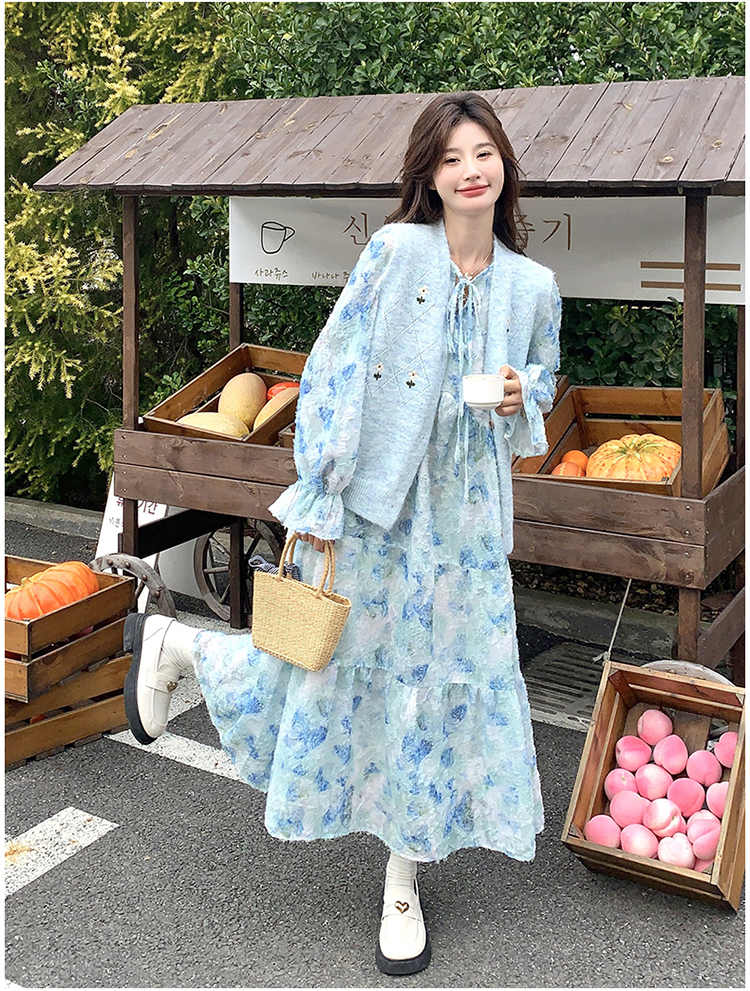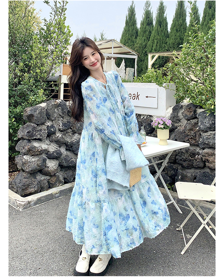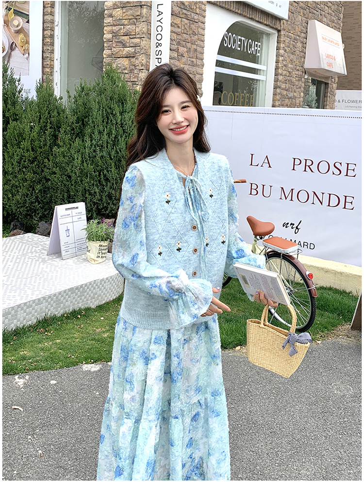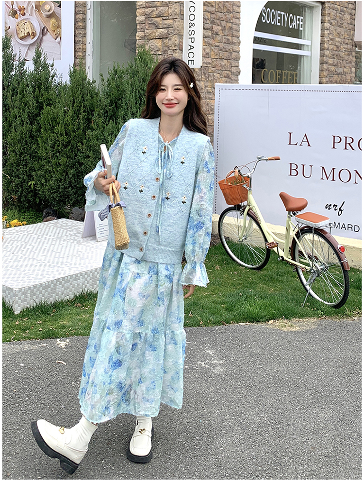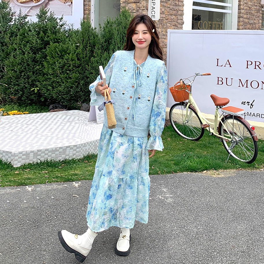 2点セット!【セットアップ】 ニットベスト×花柄 長袖ワンピース フレンチ風 リボン付き 若見えロング丈 セット【SHシリーズ】