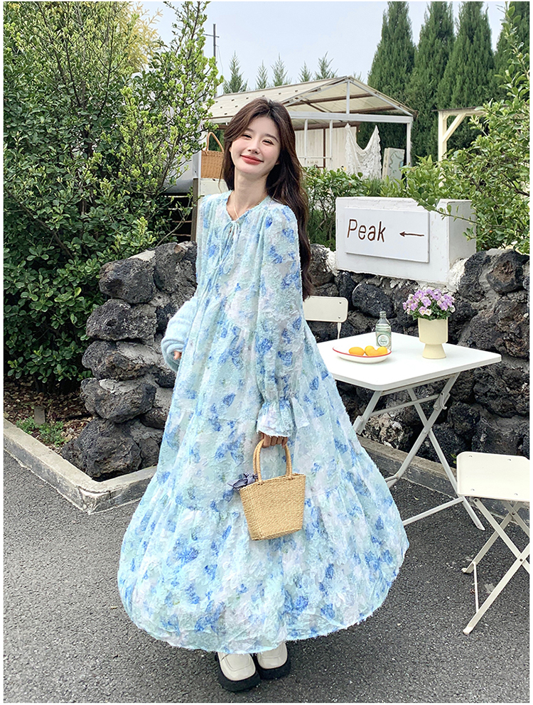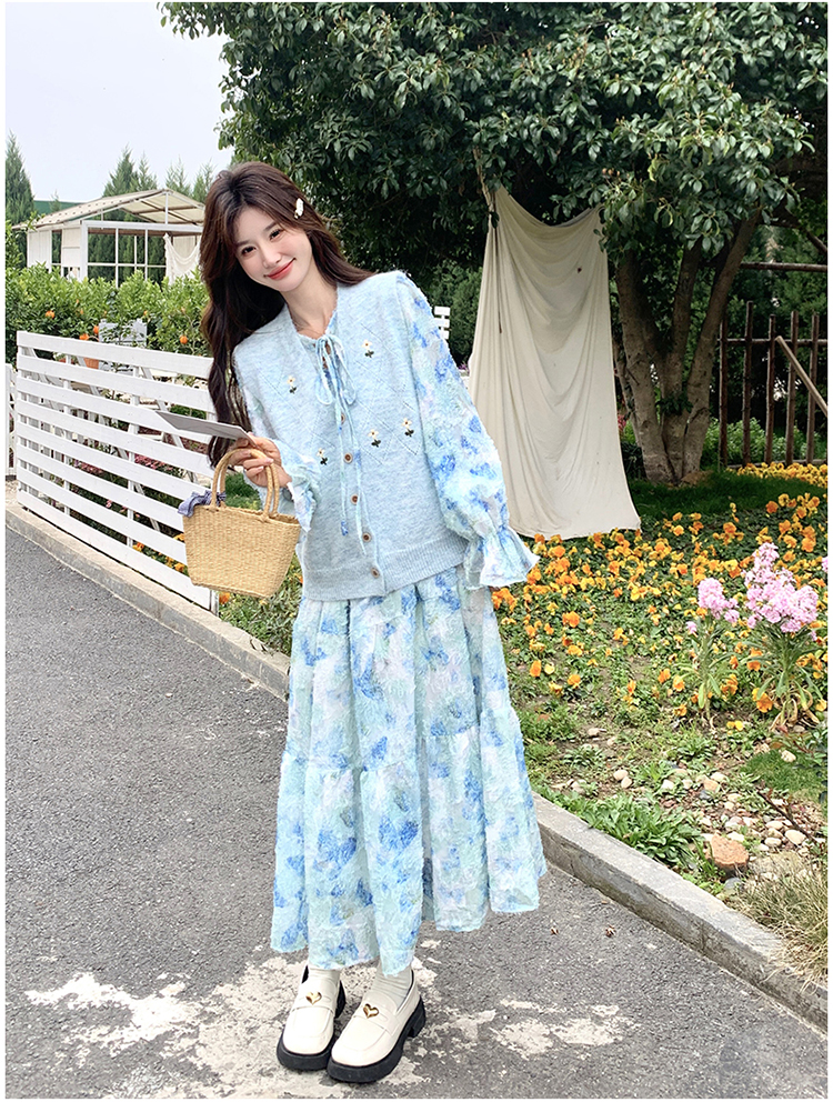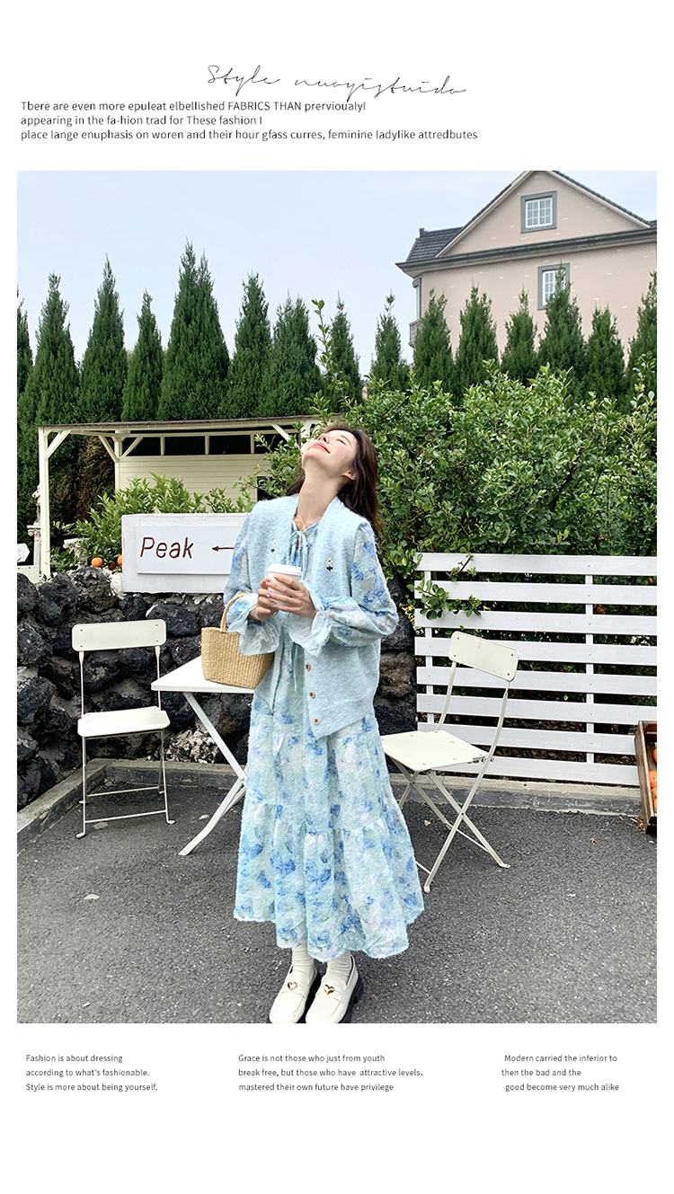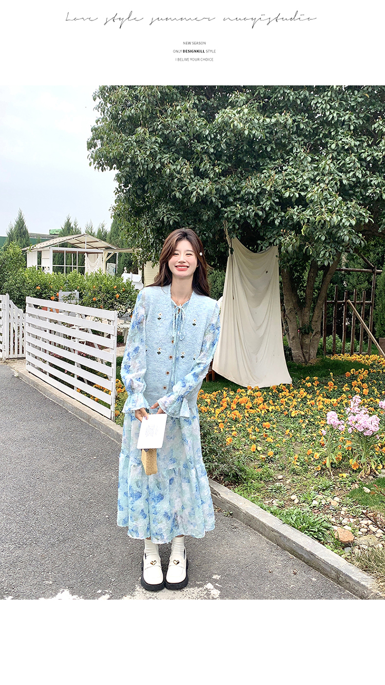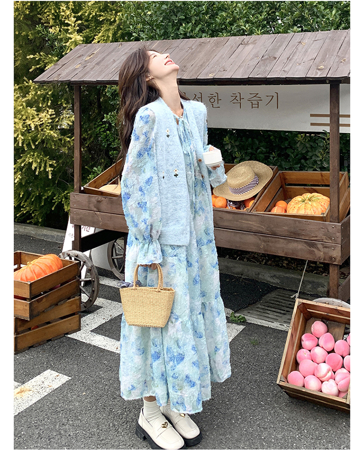 2点セット!【セットアップ】 ニットベスト×花柄 長袖ワンピース フレンチ風 リボン付き 若見えロング丈 セット【SHシリーズ】