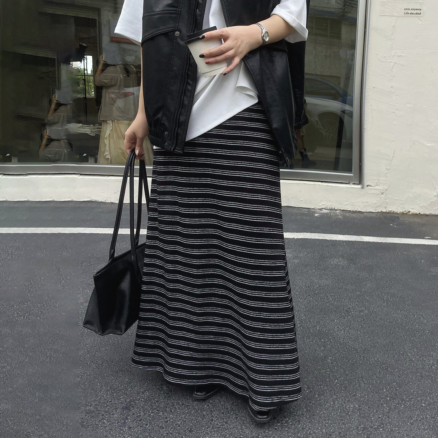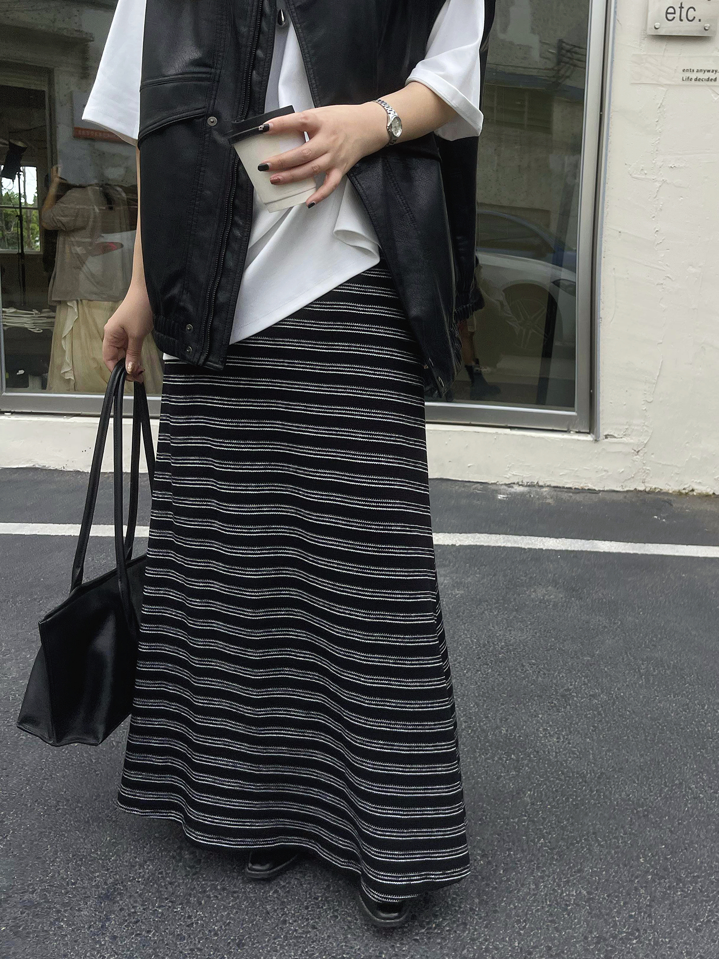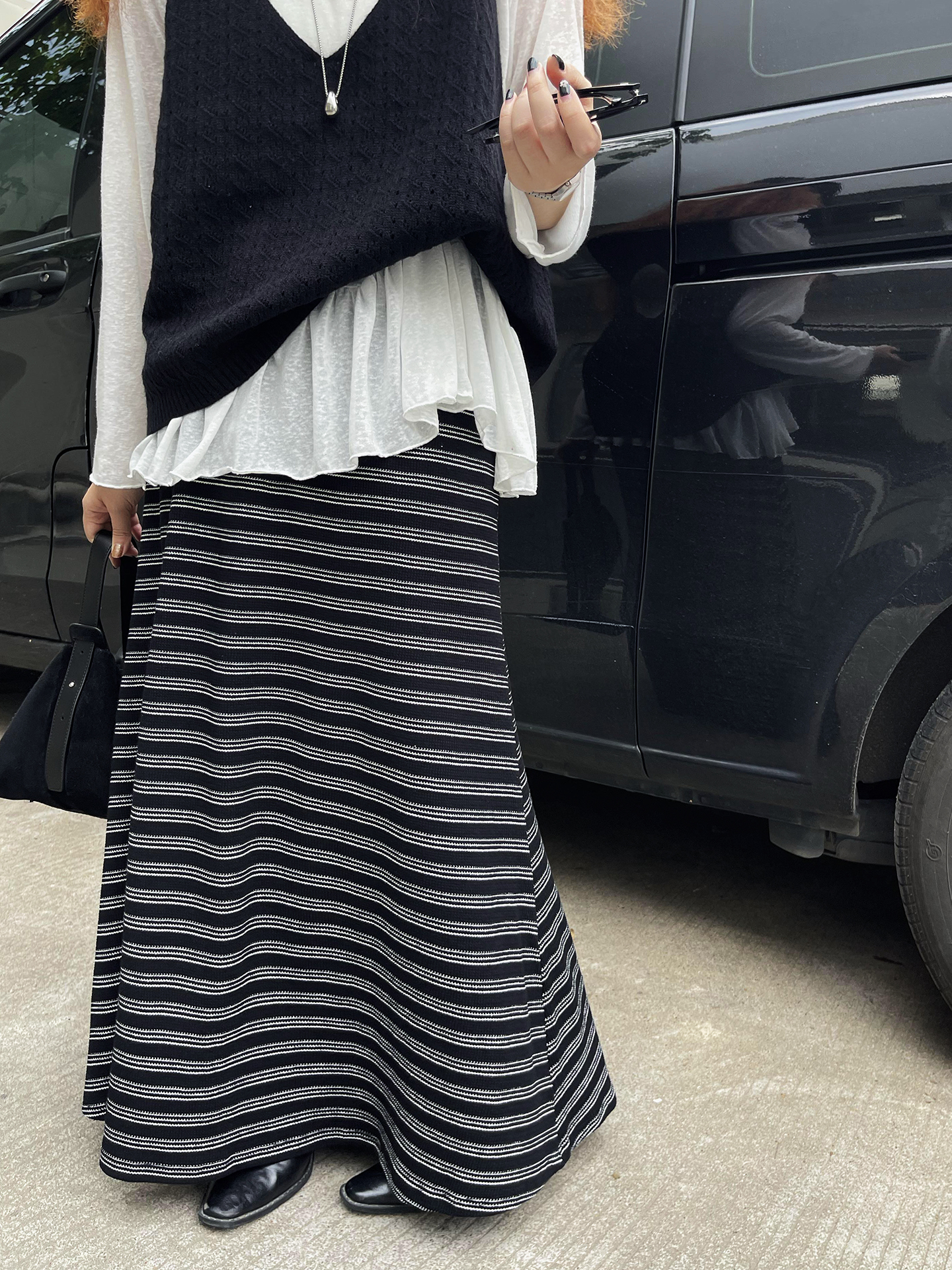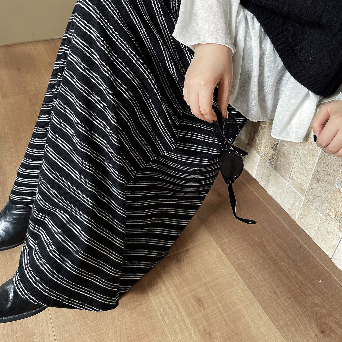 【ボトムス】レトロ ストライプ ニットスカート 初秋新作 ハイウエスト スリム見え Aラインスカート【SHシリーズ】