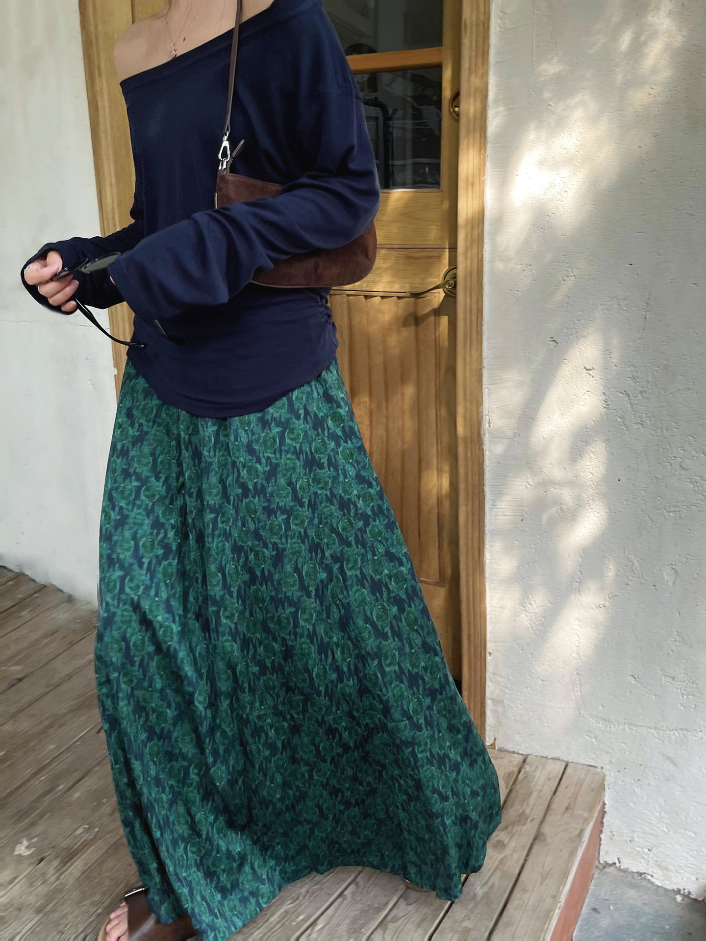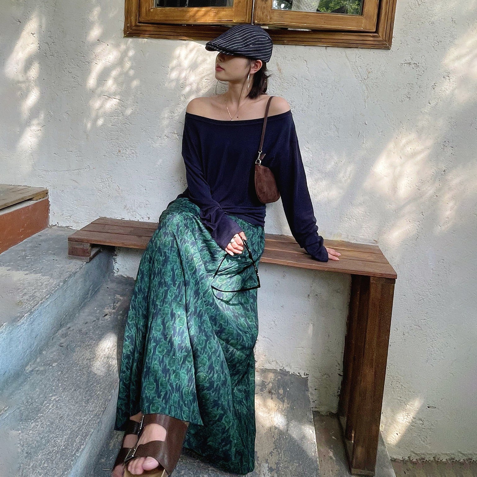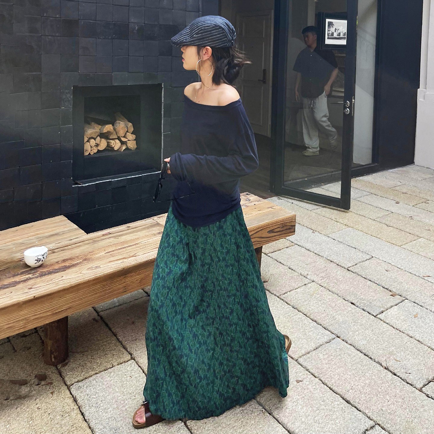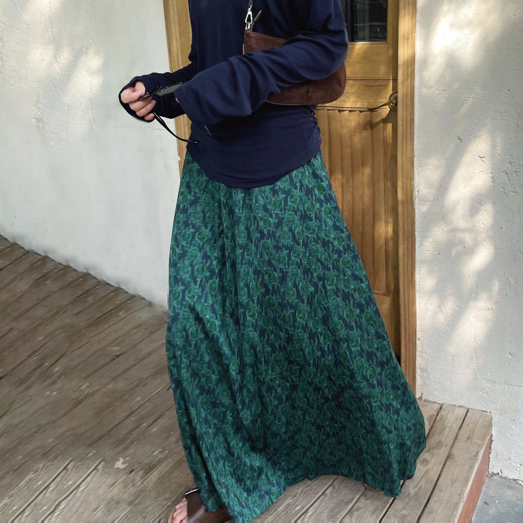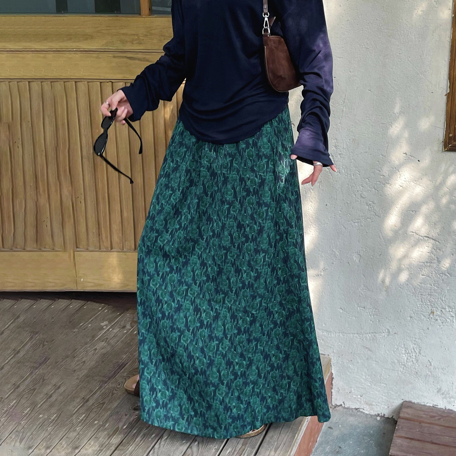 【ボトムス】レトロ風 スカート 初秋新作 ハイウエスト スリム見え 花柄ストレートスカート ドレープ感 スリット入り【SHシリーズ】