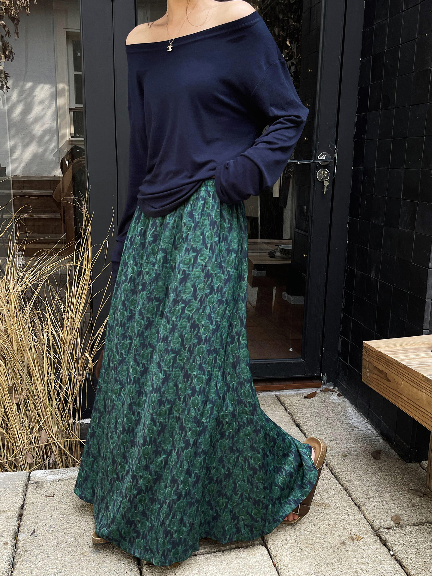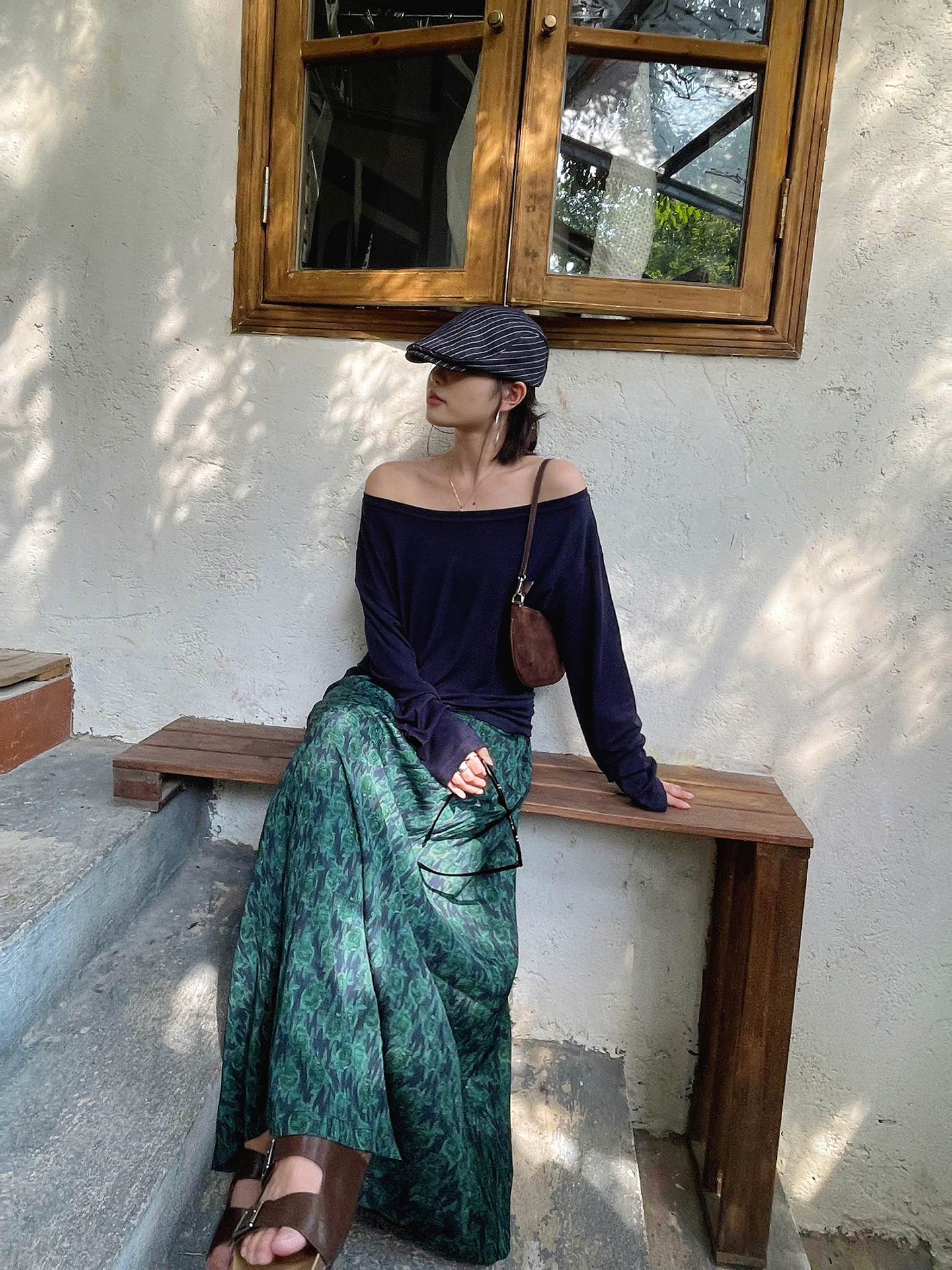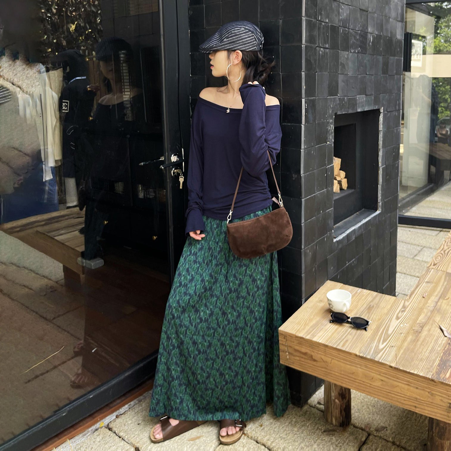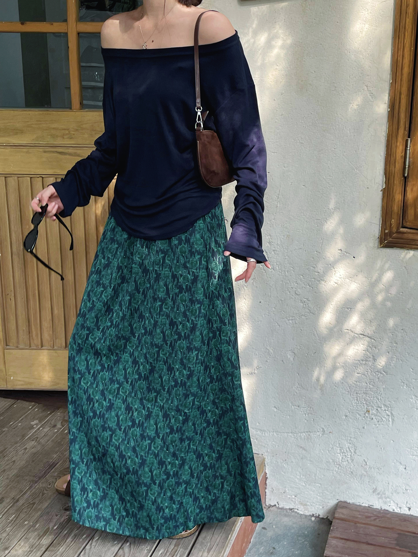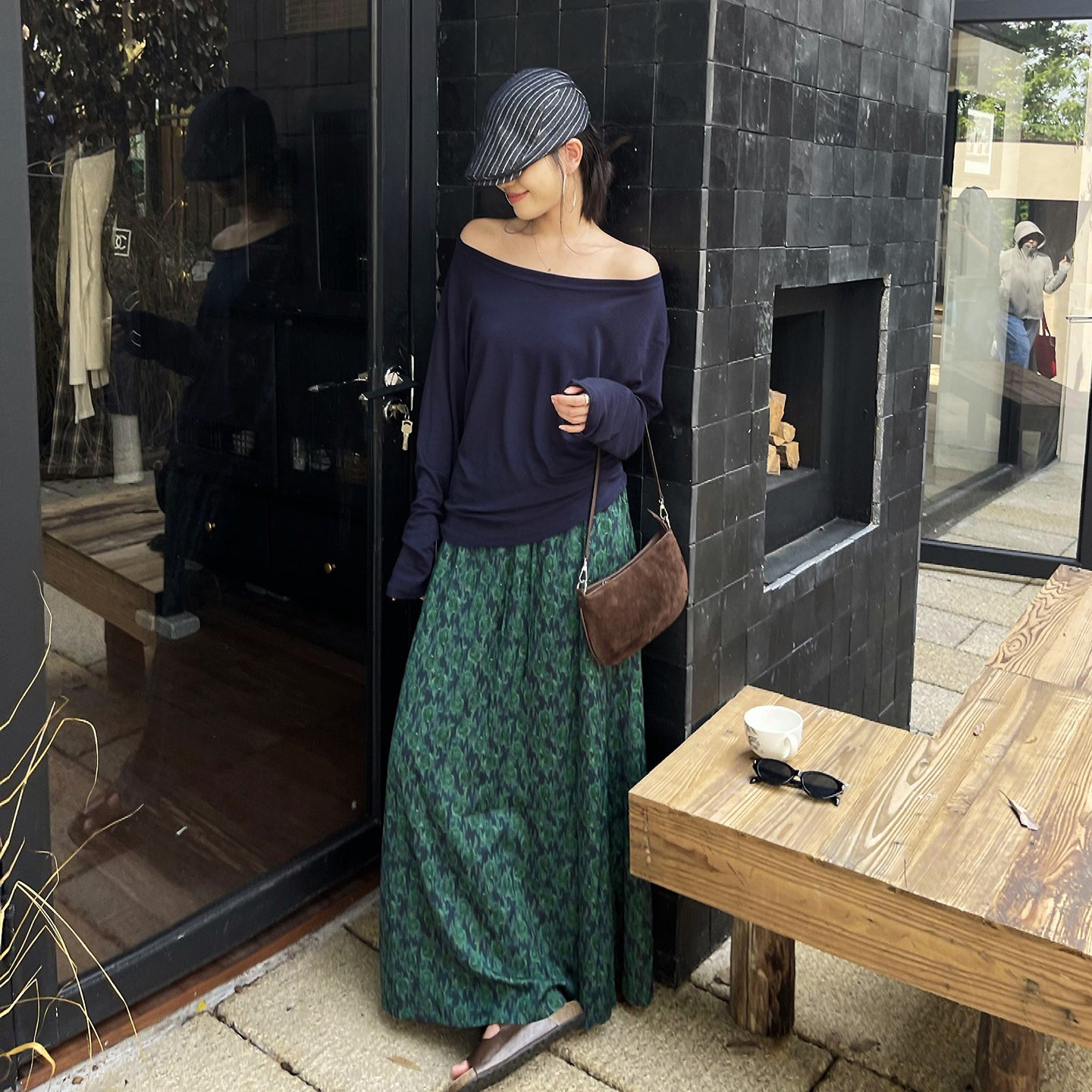【ボトムス】レトロ風 スカート 初秋新作 ハイウエスト スリム見え 花柄ストレートスカート ドレープ感 スリット入り【SHシリーズ】