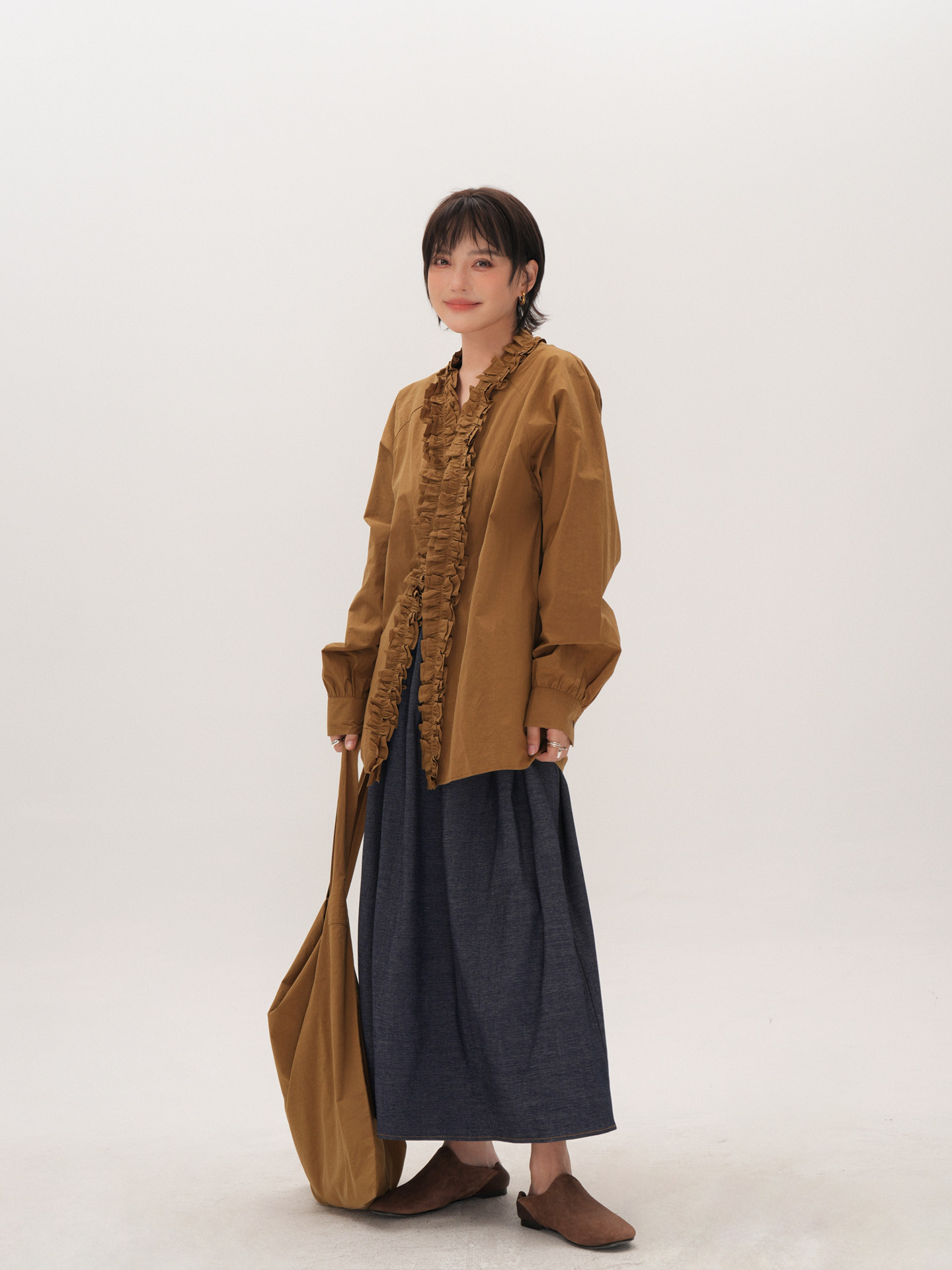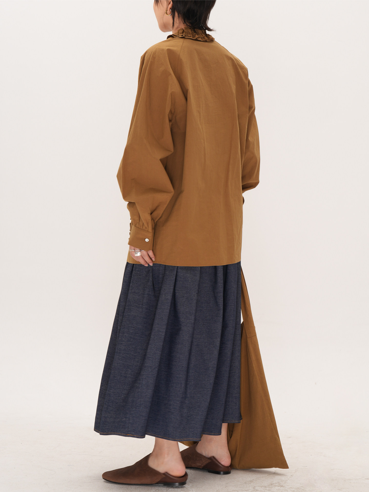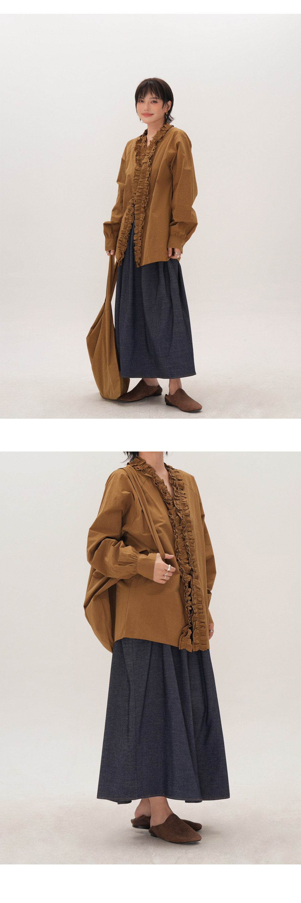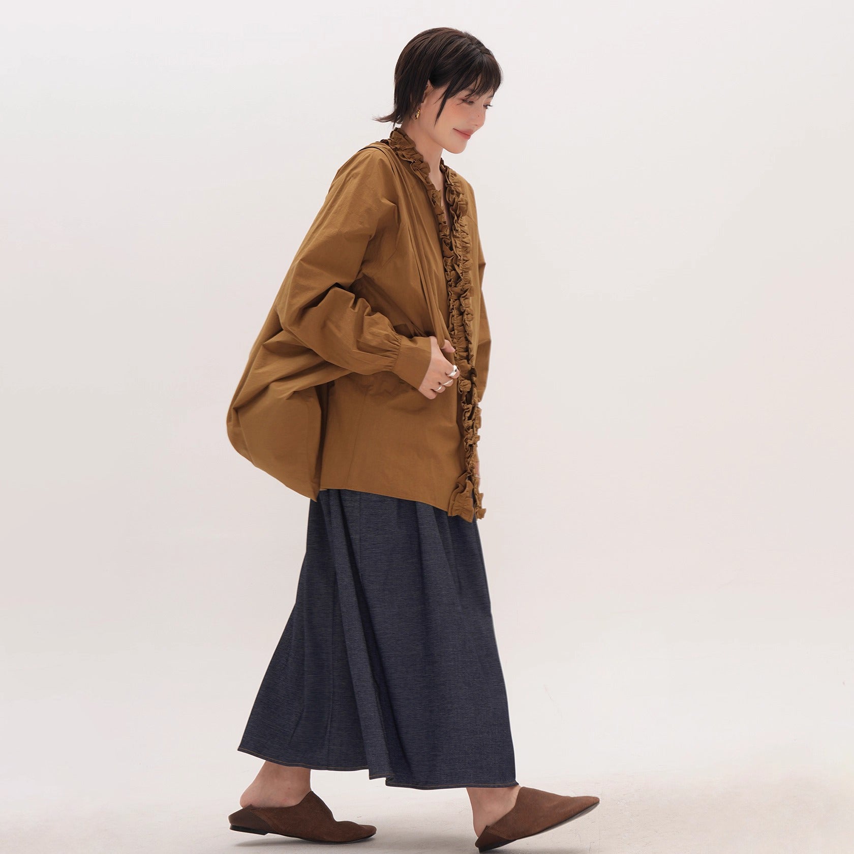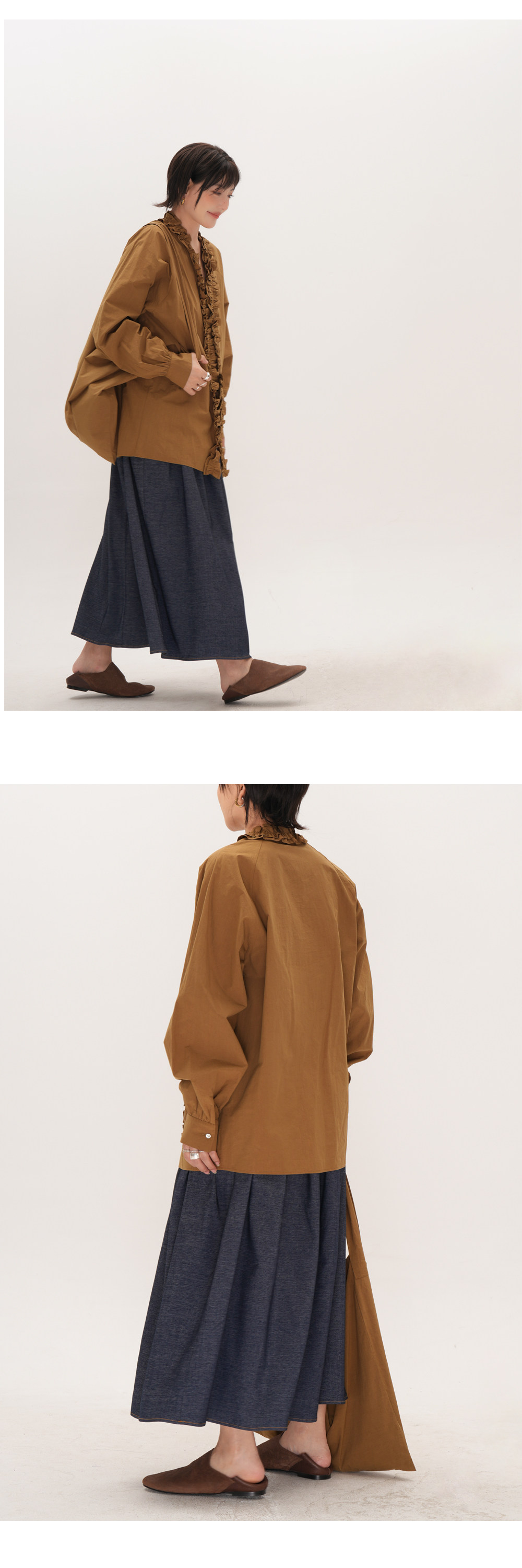 【トップス】フリル襟シャツ レディース ゆったり 大きめサイズ ミディアムロング 長袖シャツ 秋【JZシリーズ】