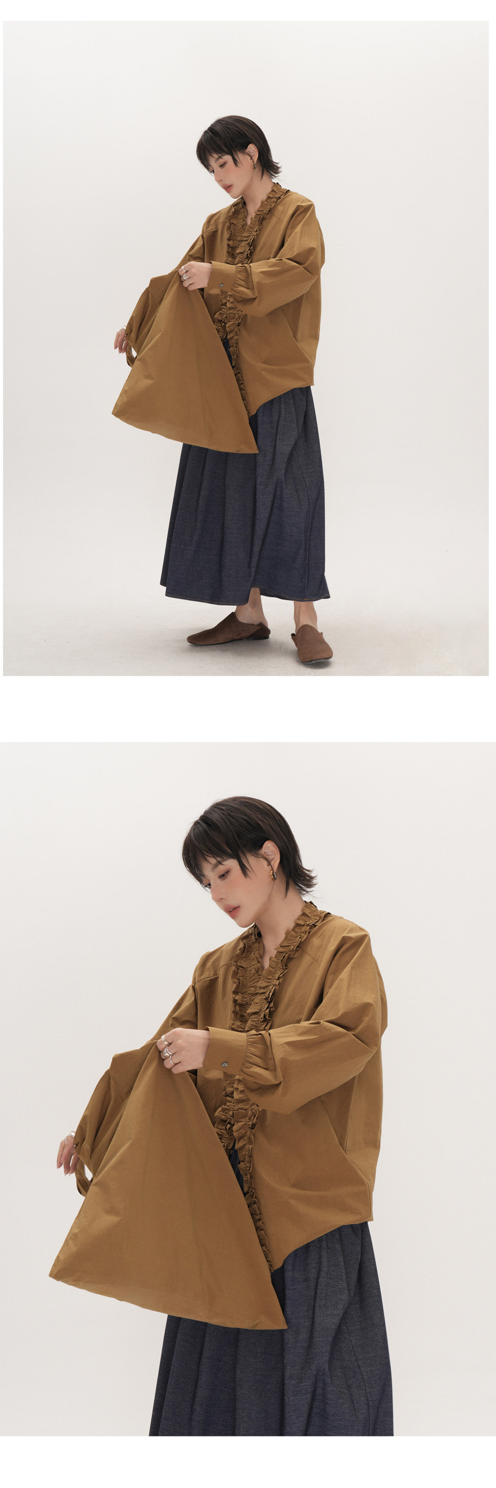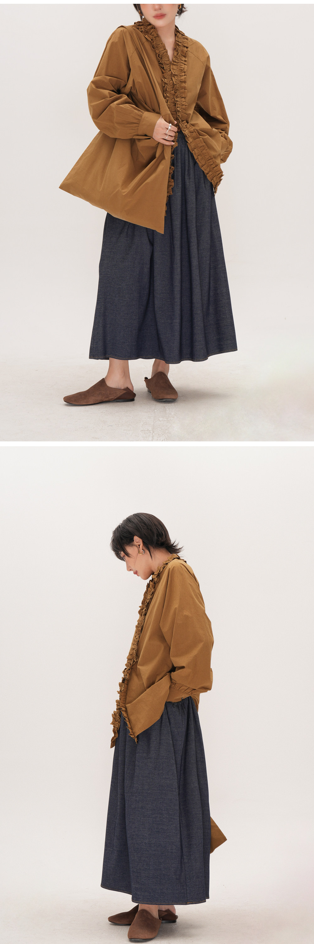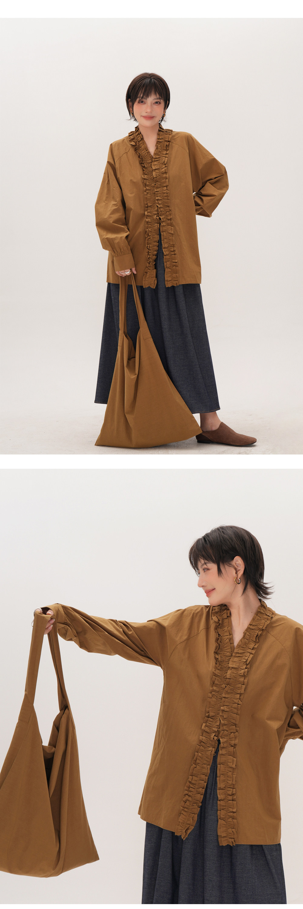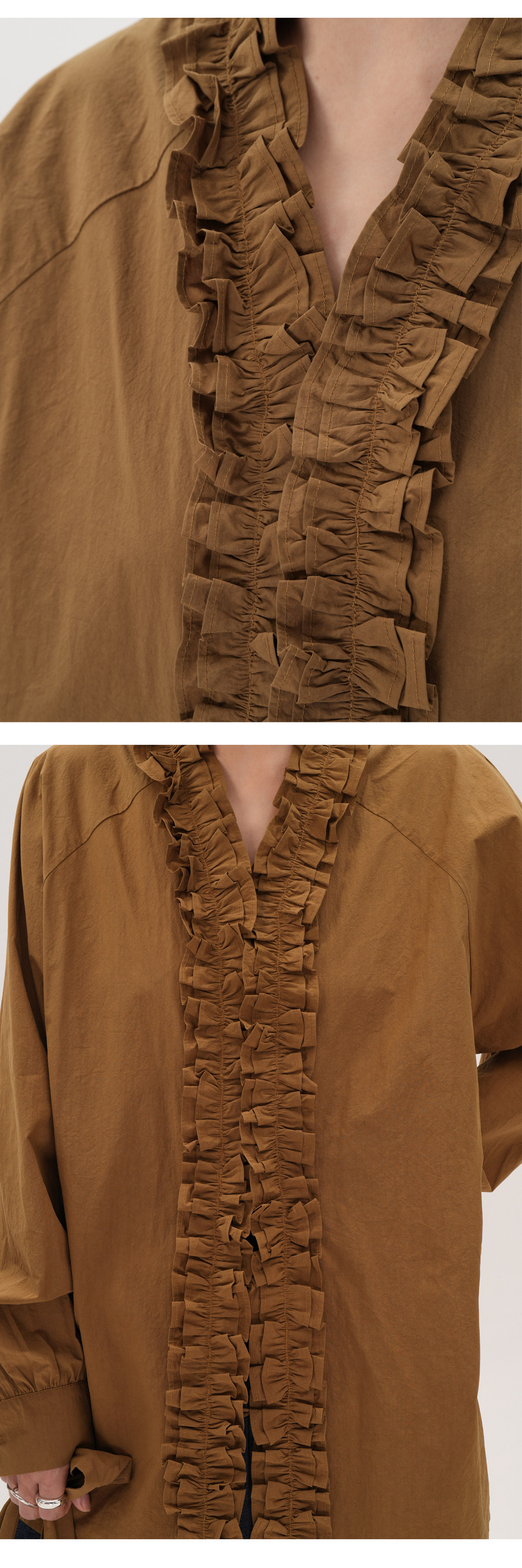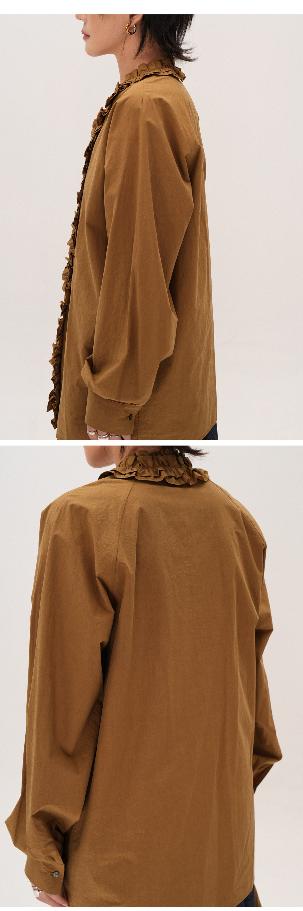 【商品名】【トップス】フリル襟シャツ レディース ゆったり 大きめサイズ ミディアムロング 長袖シャツ 秋【JZシリーズ】