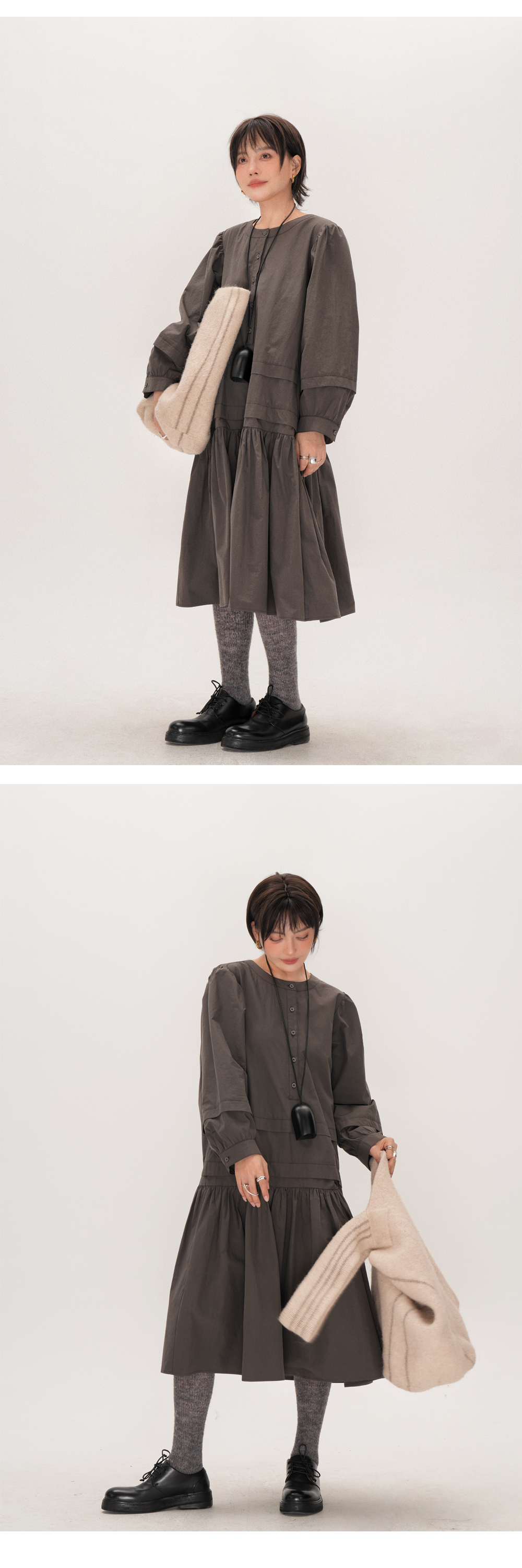 【ワンピース】フレンチレトロ 切替デザイン 大ポケット 長袖 ワンピース 秋新作 ゆったり 【JZシリーズ】