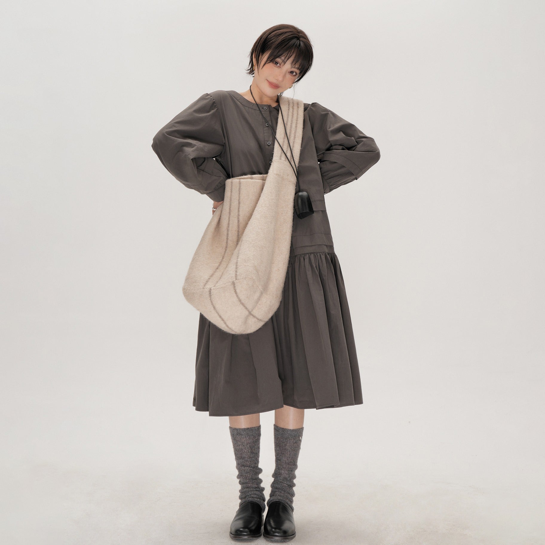 【ワンピース】起毛素材 チェック柄 レトロ クルーネック 長袖 ワンピース 【JZシリーズ】