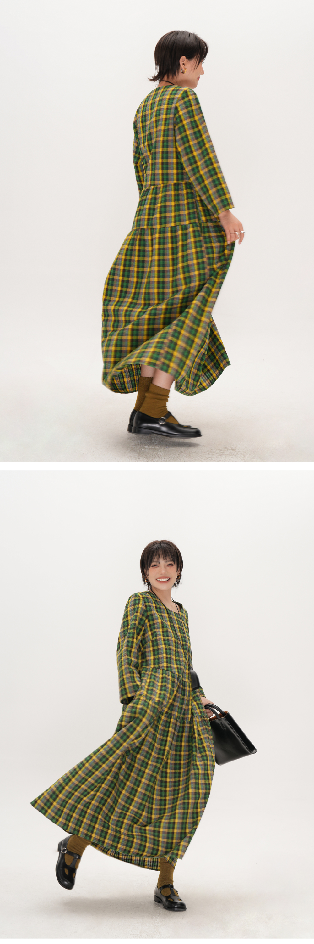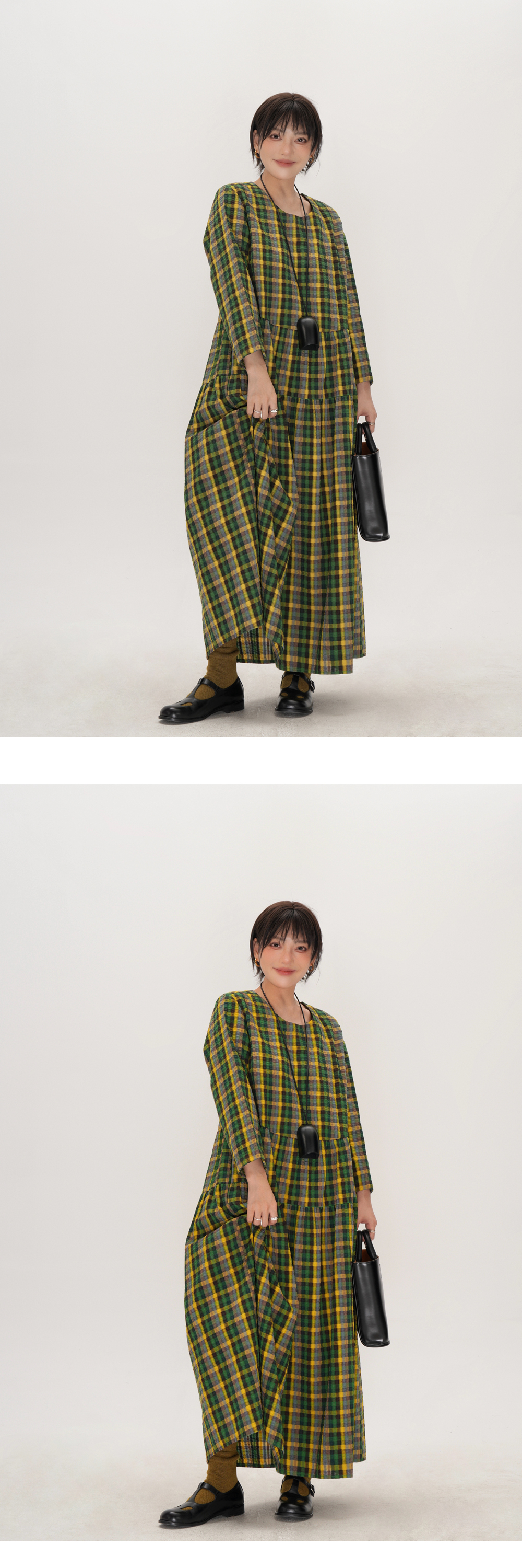 【ワンピース】起毛素材 チェック柄 レトロ クルーネック 長袖 ワンピース 【JZシリーズ】