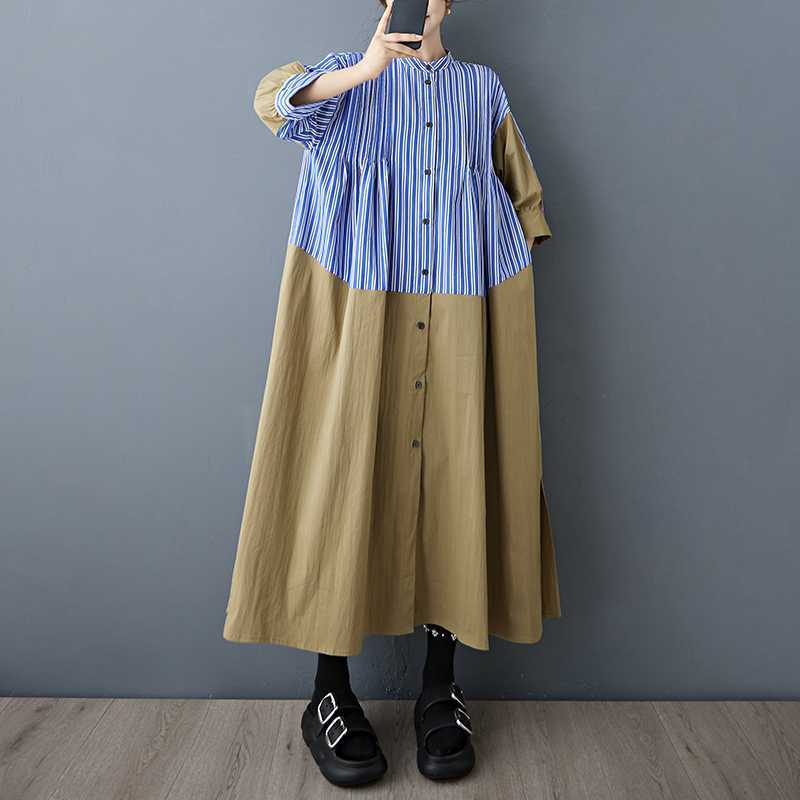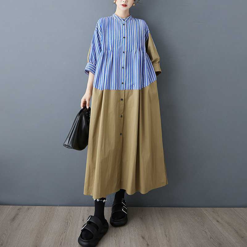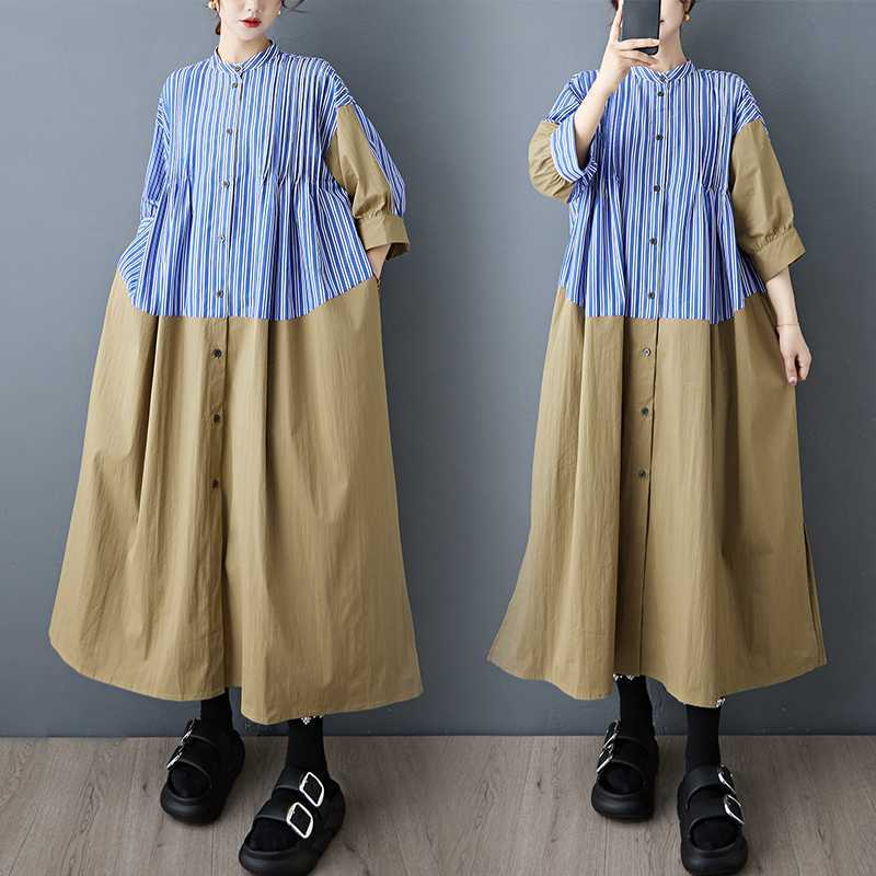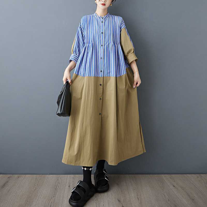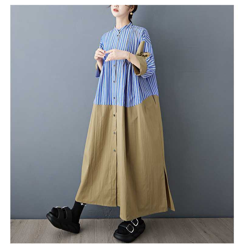 【ワンピース】細見え 日系 Vネック 無地 長袖ワンピース 切替デザイン ゆったり 気質ロング【JZシリーズ】【AHシリーズ】