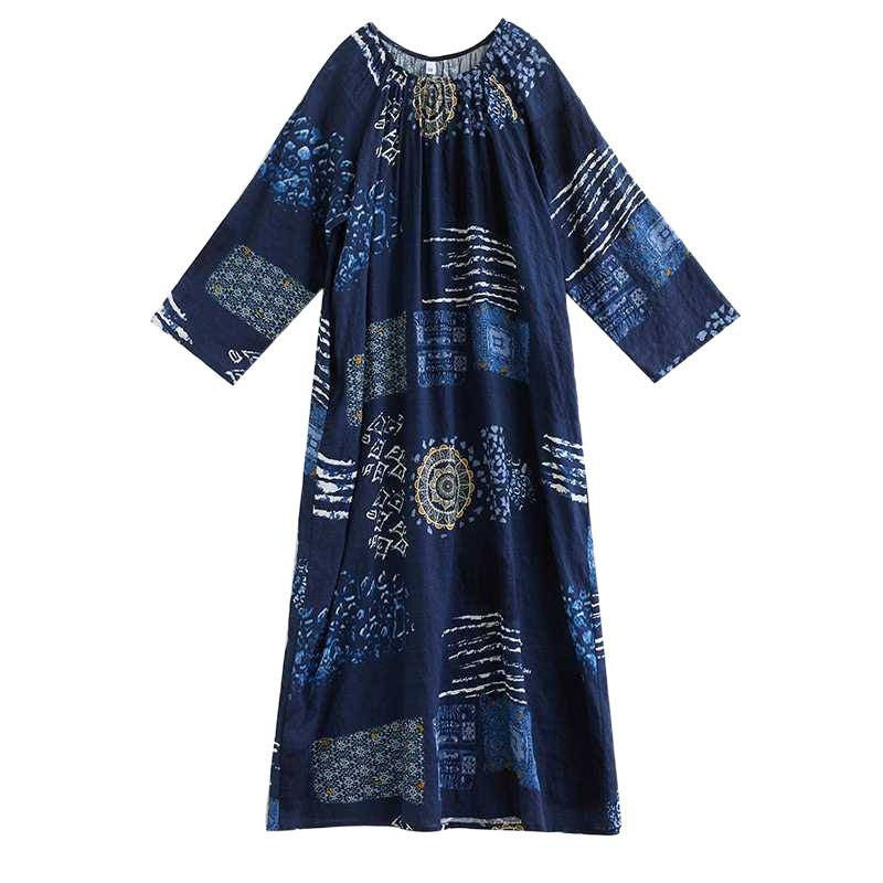 【ワンピース】春 秋 夏 クルーネック ギャザー入り プリント 長袖 ワンピース 【SHシリーズ】