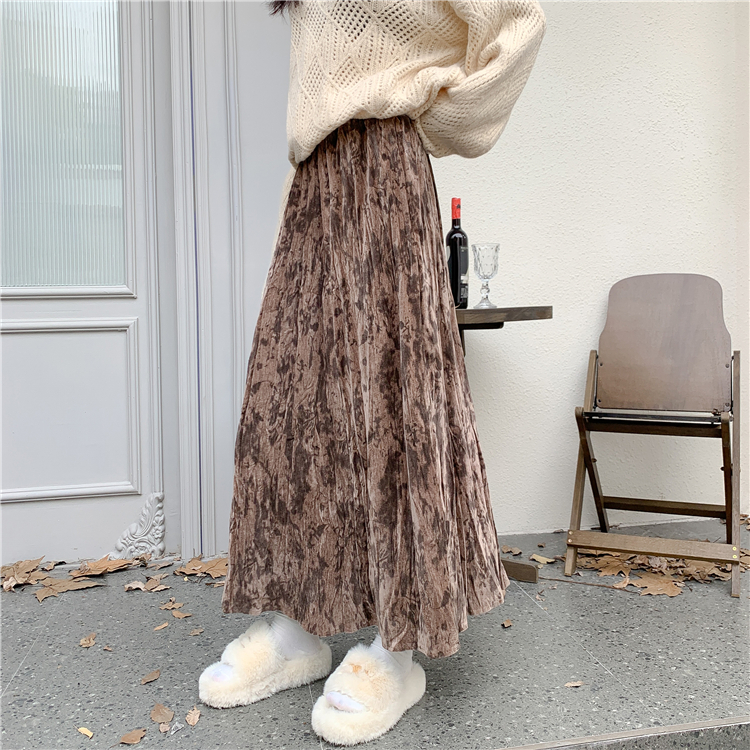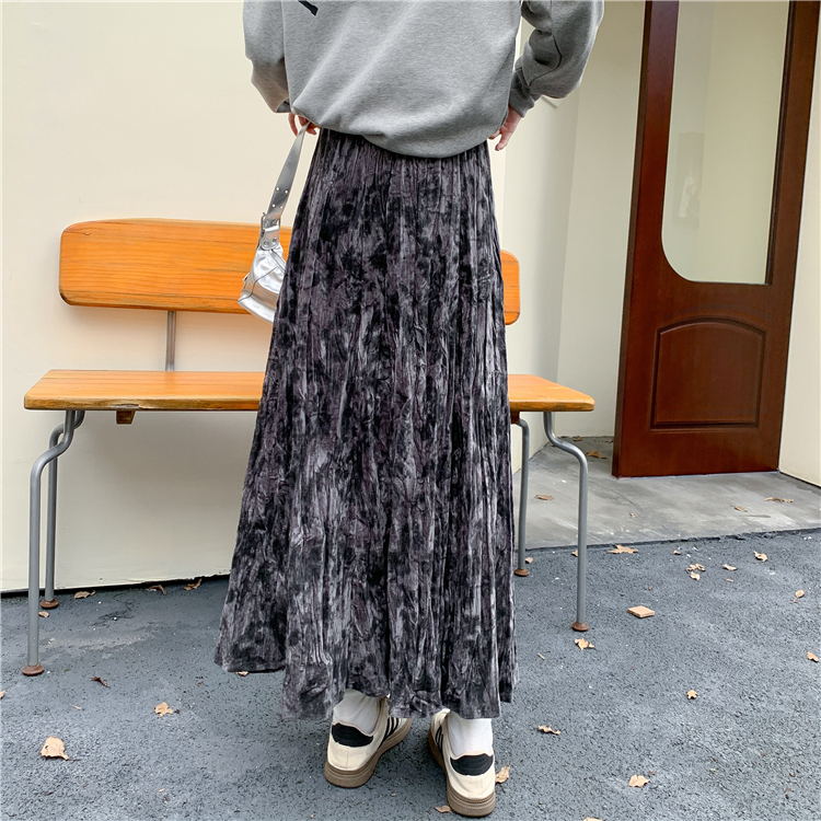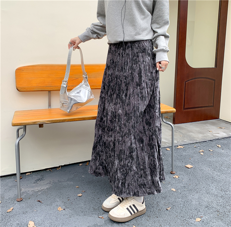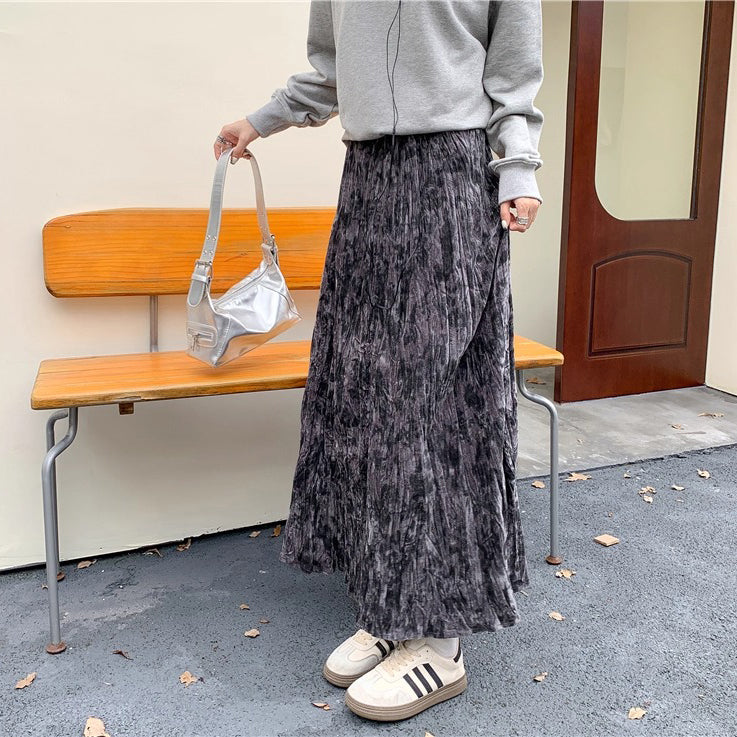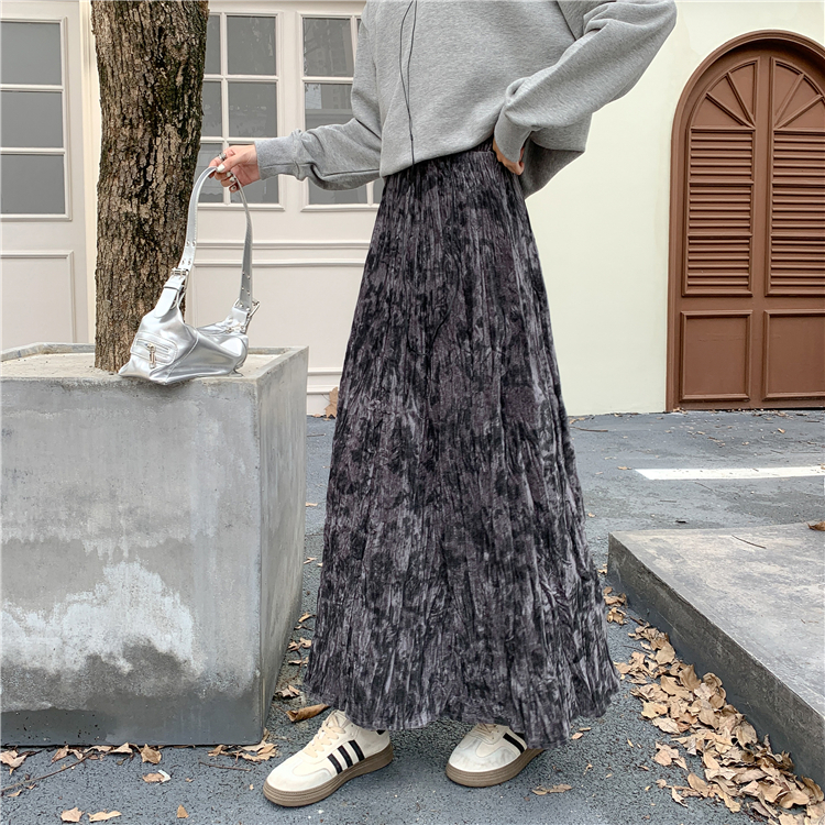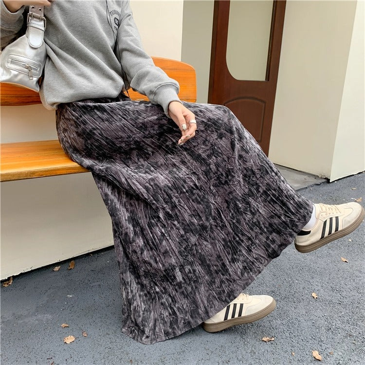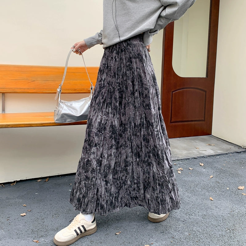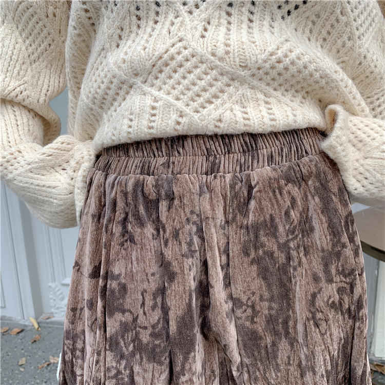 【ボトムス】プリーツ ゆったり ヒップカバー Aラインロングスカート 水墨画柄 ベルベットスカート【SHシリーズ】