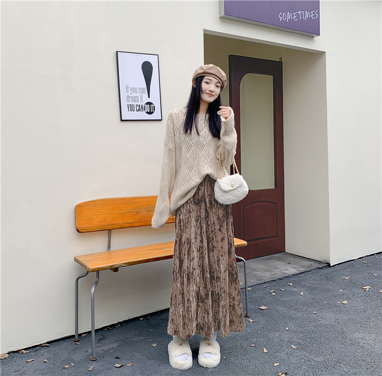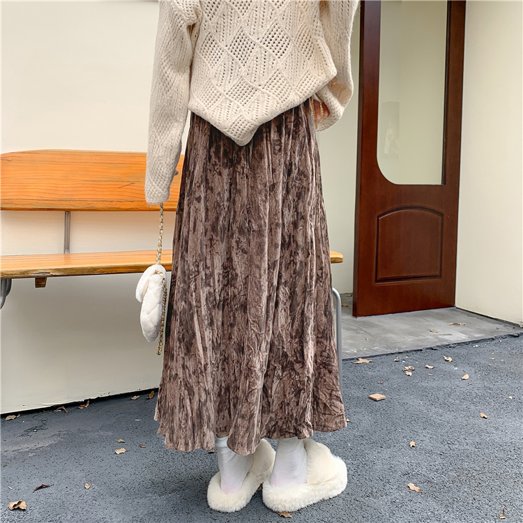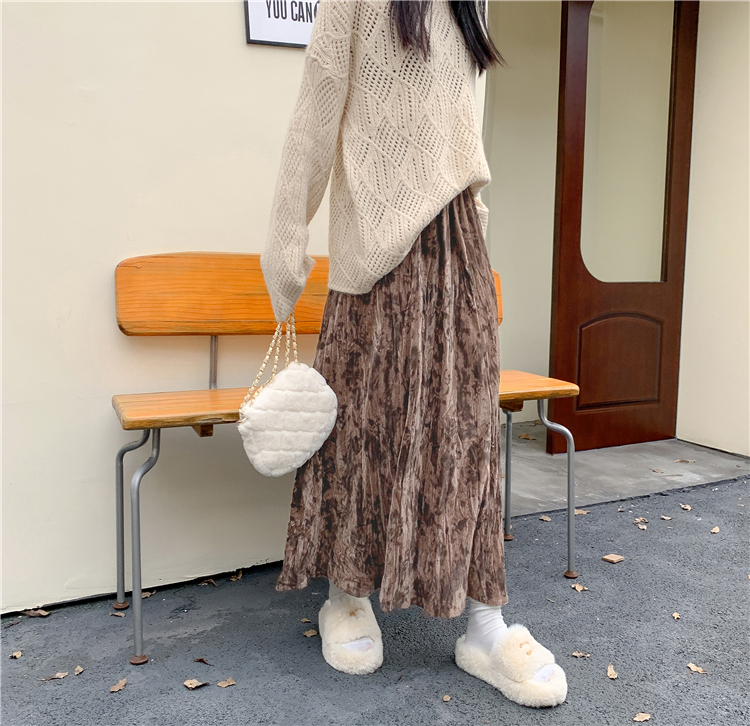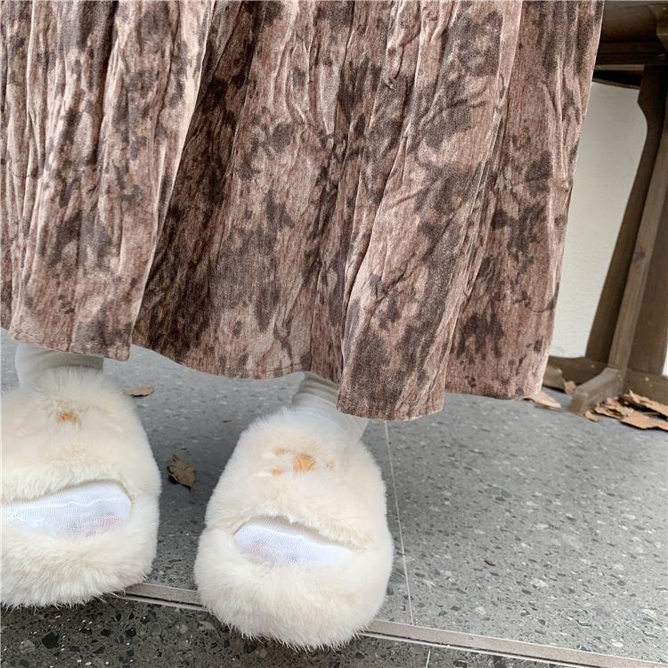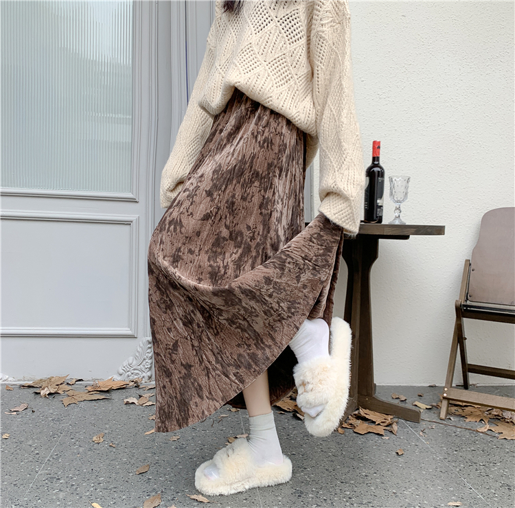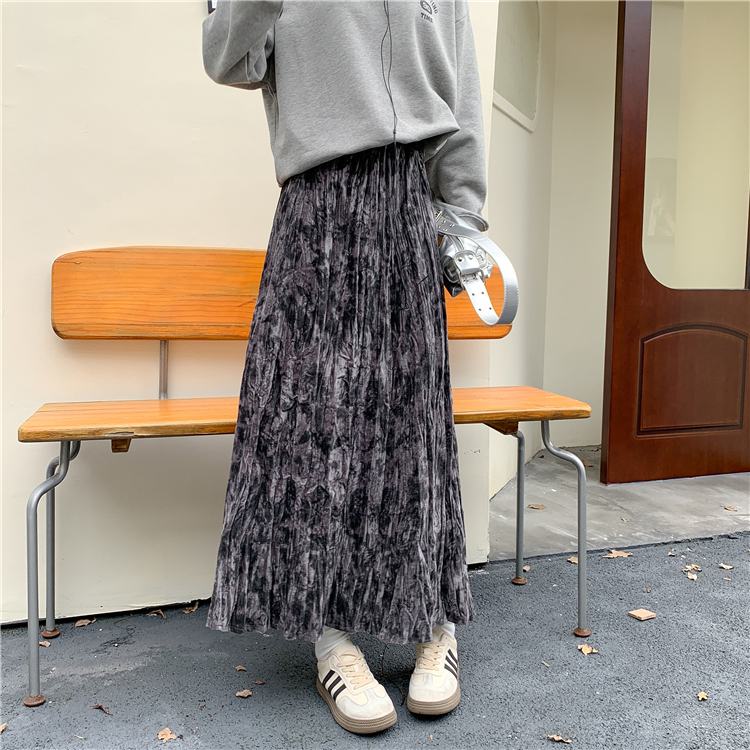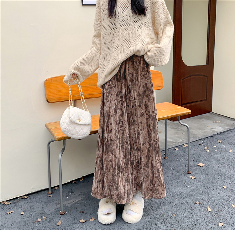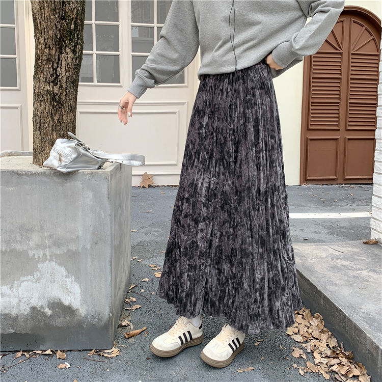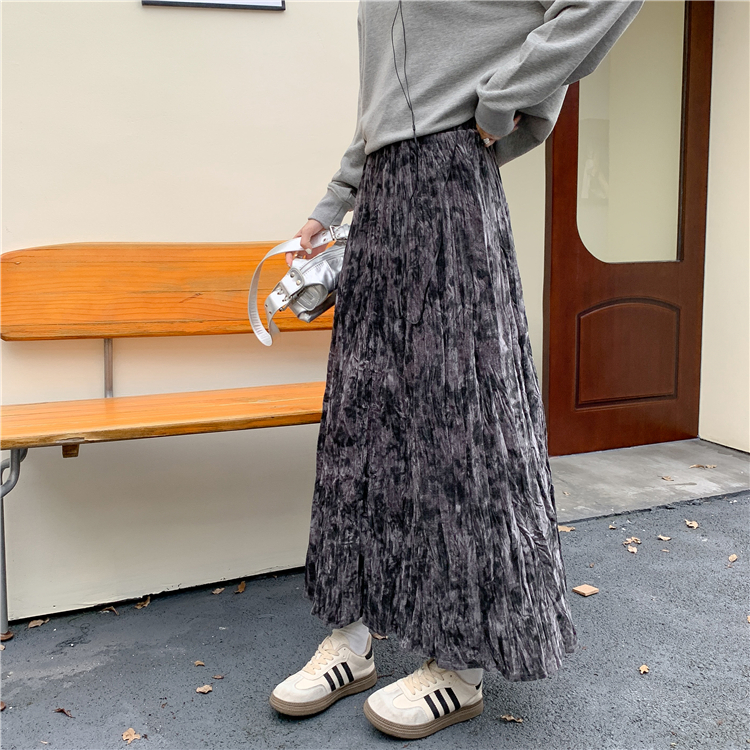 【ボトムス】プリーツ ゆったり ヒップカバー Aラインロングスカート 水墨画柄 ベルベットスカート【SHシリーズ】