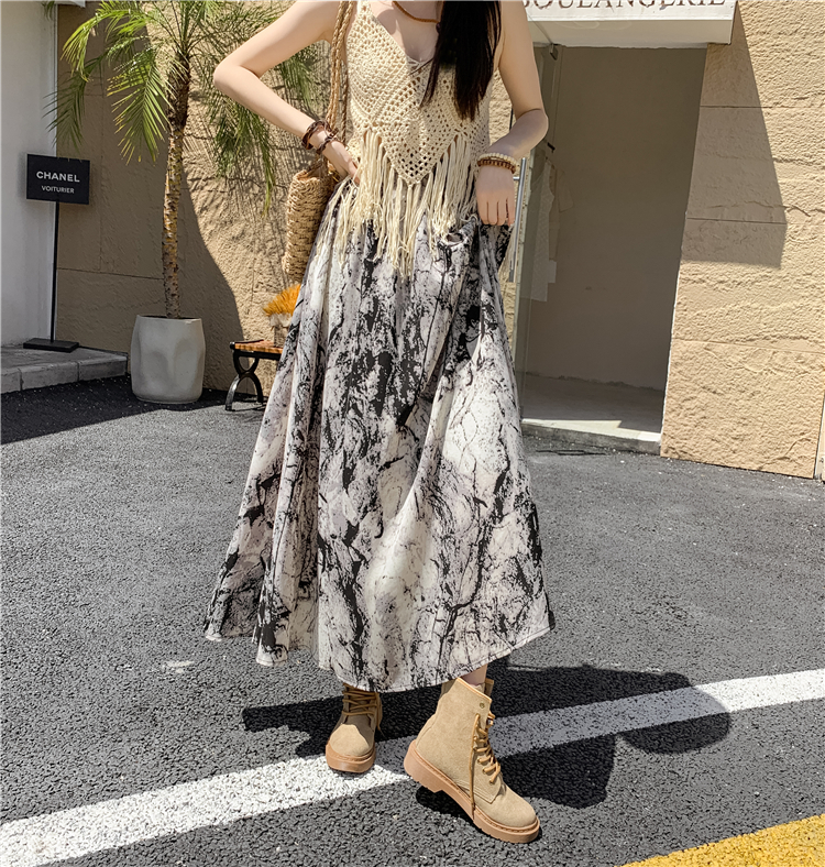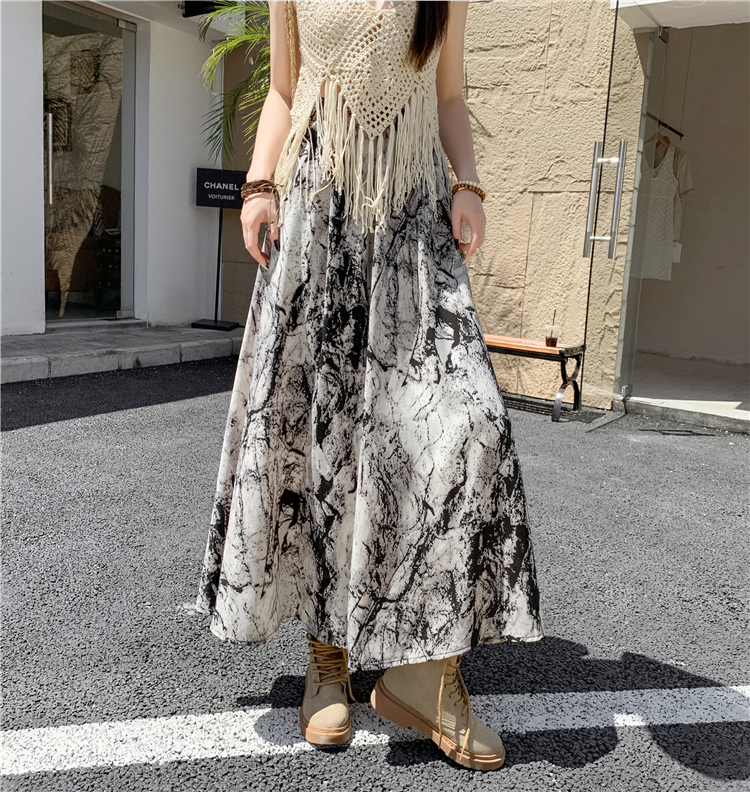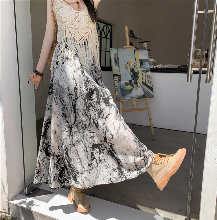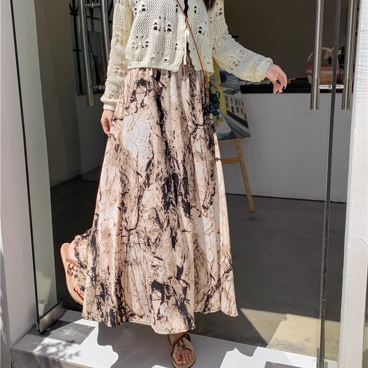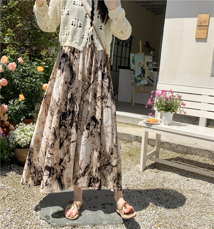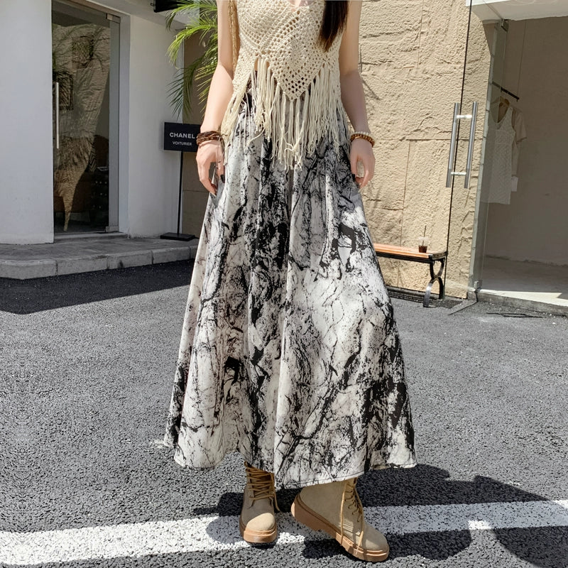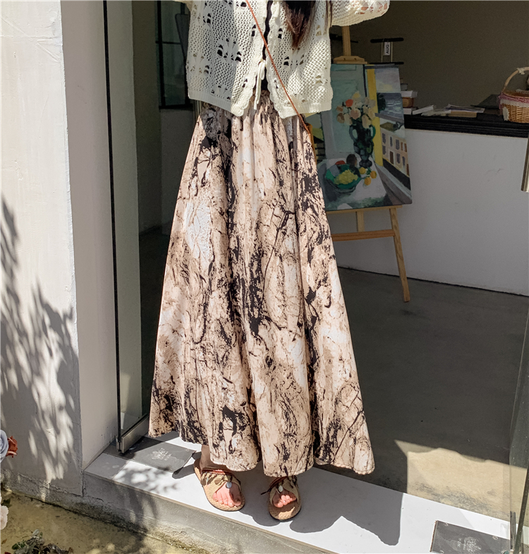 【商品名】【ボトムス】ハイウエスト レトロ水墨柄 フレアロングスカート Aライン シフォンスカート【SHシリーズ】