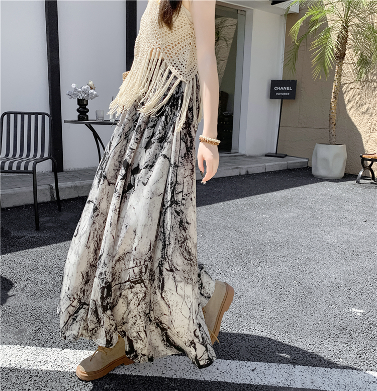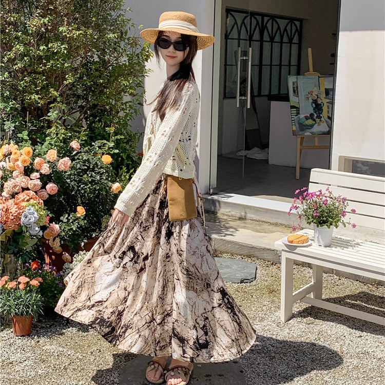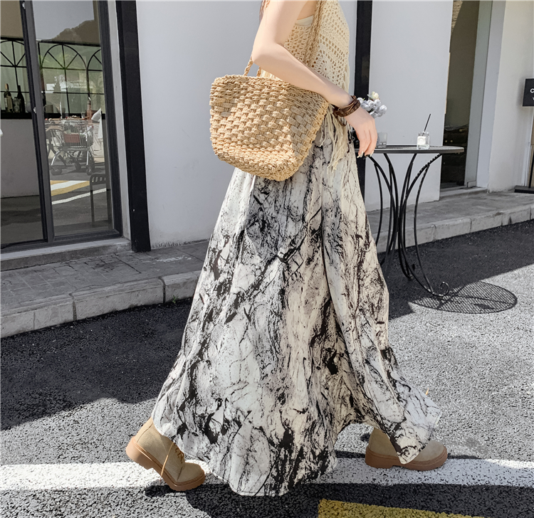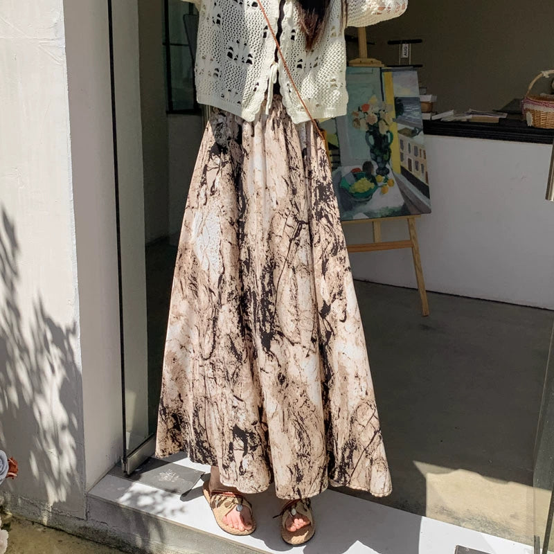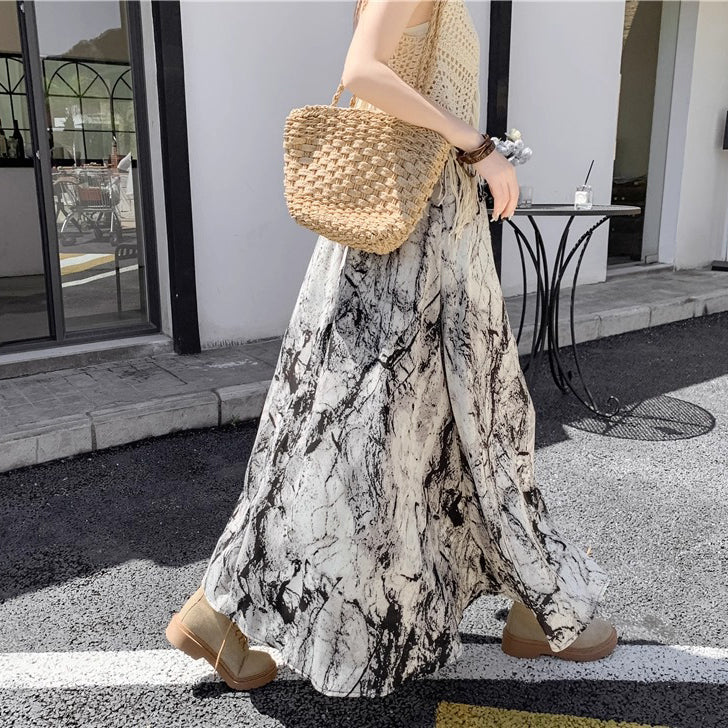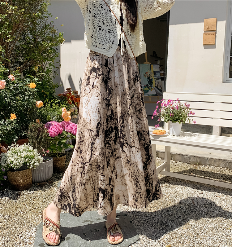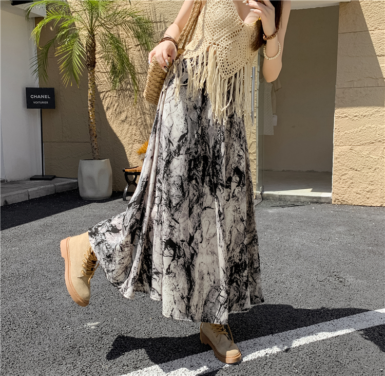 【ボトムス】ハイウエスト レトロ水墨柄 フレアロングスカート Aライン シフォンスカート【SHシリーズ】