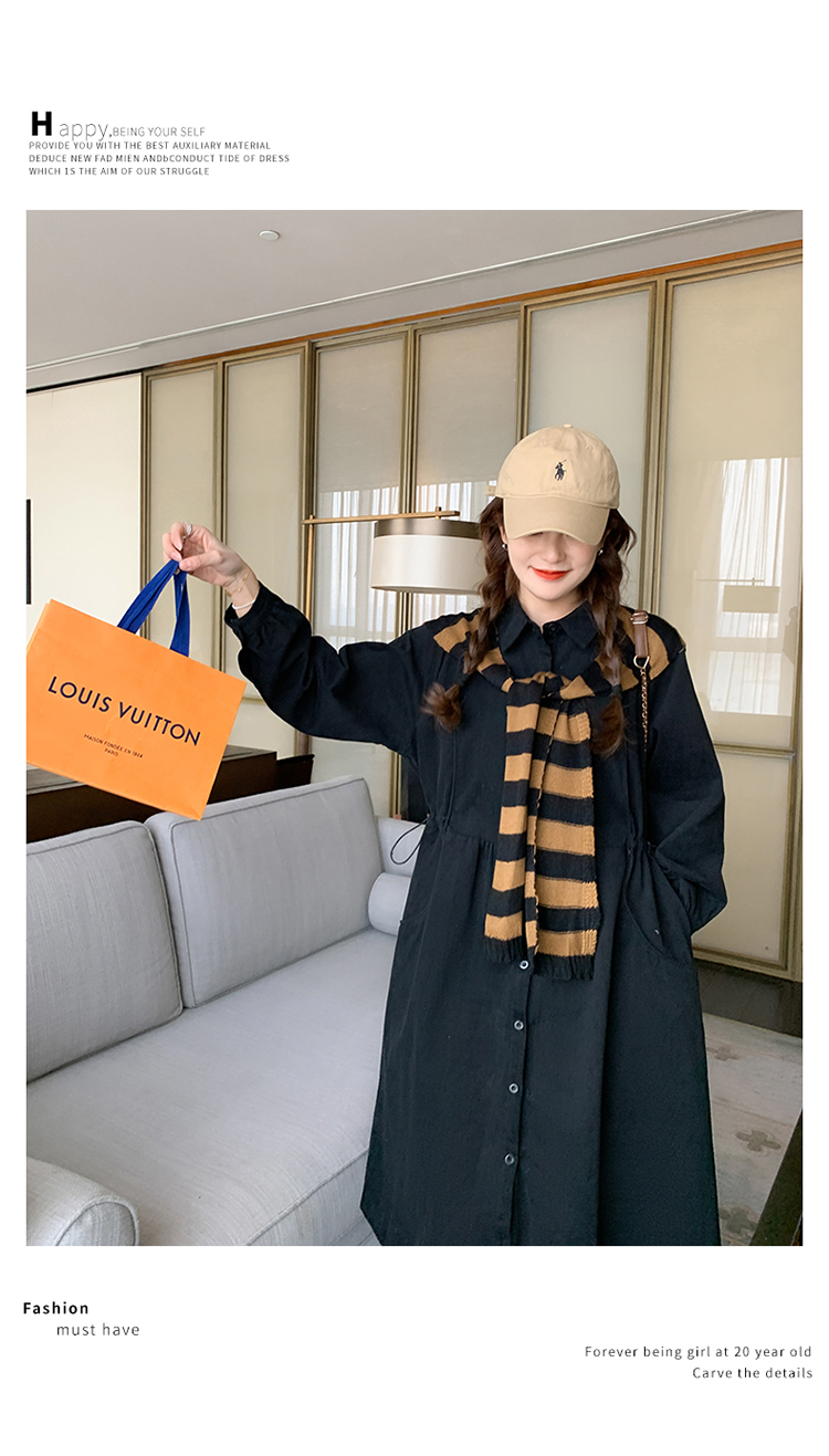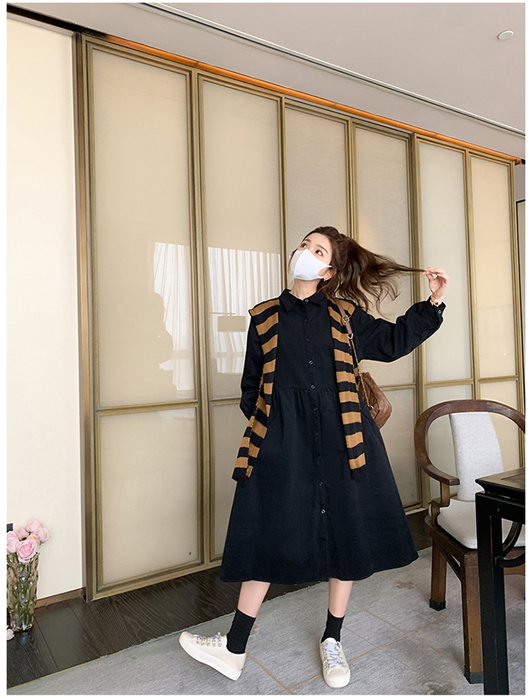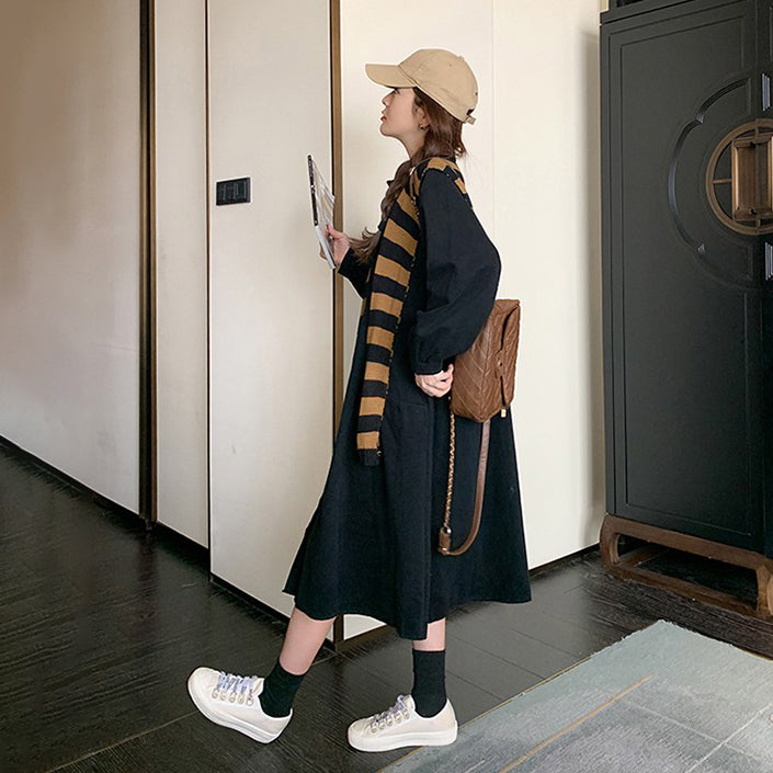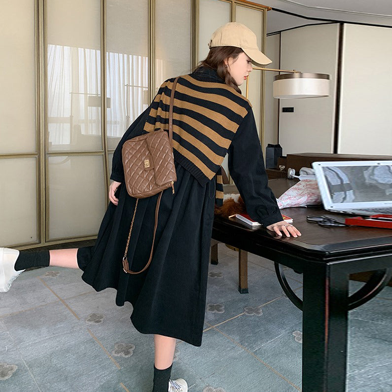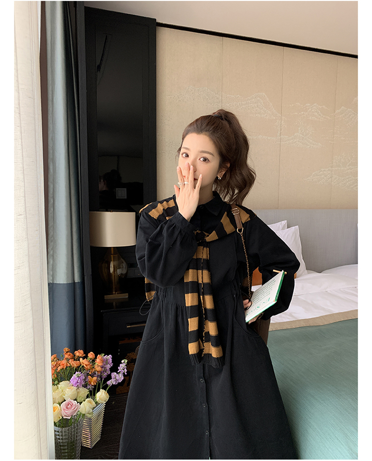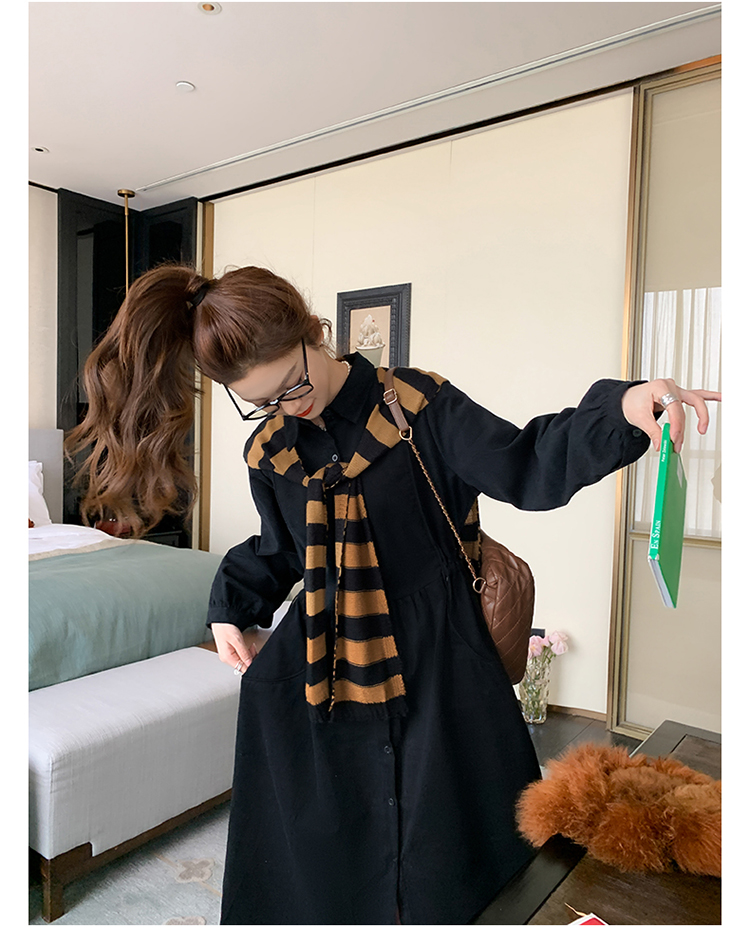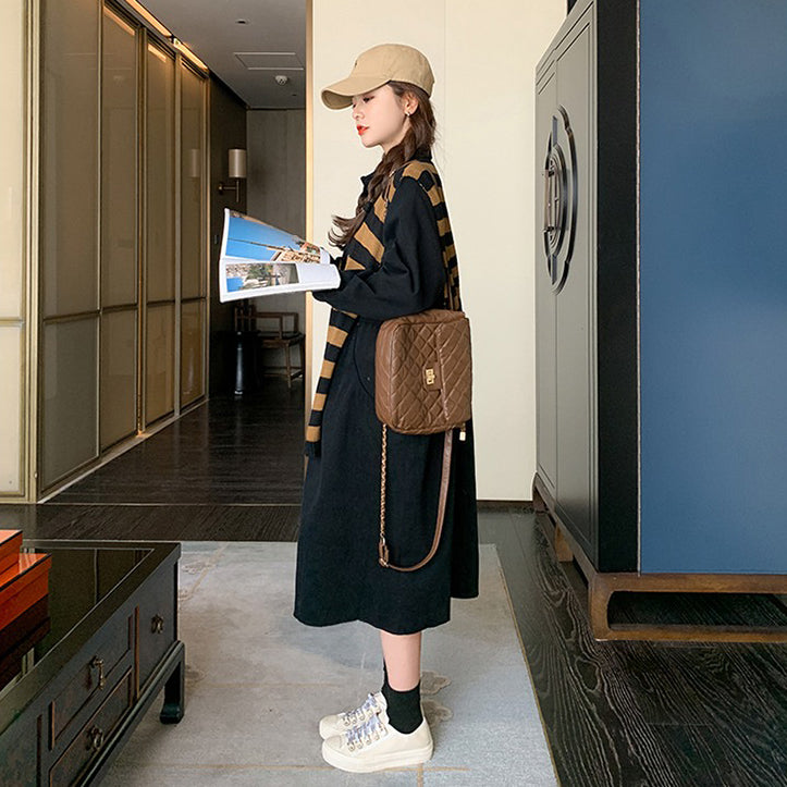 【商品名】【ワンピース】ヴィンテージ風 ストライプショールワンピース 春秋 Aライン ゆったり 韓国風 長袖ワンピース【JZシリーズ】