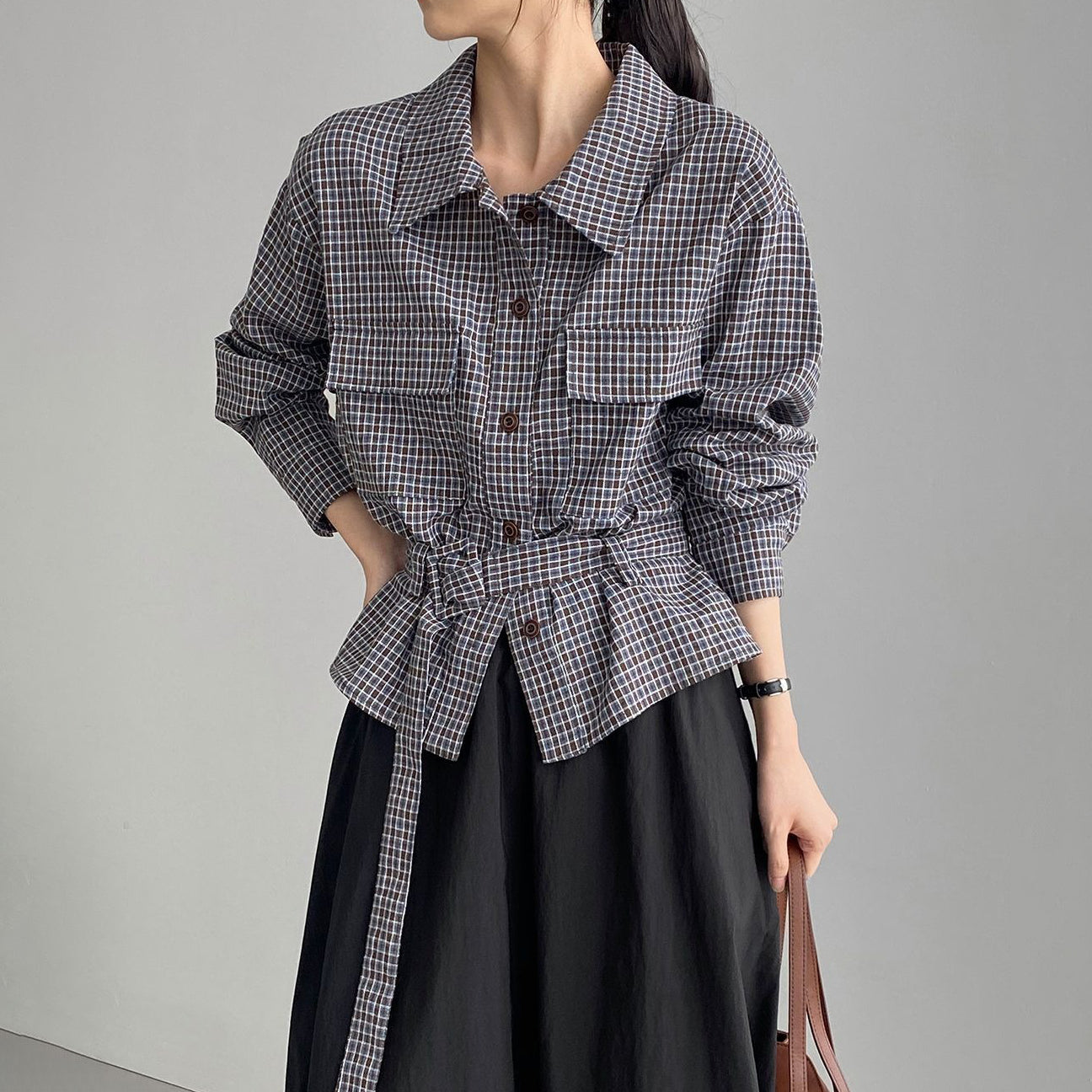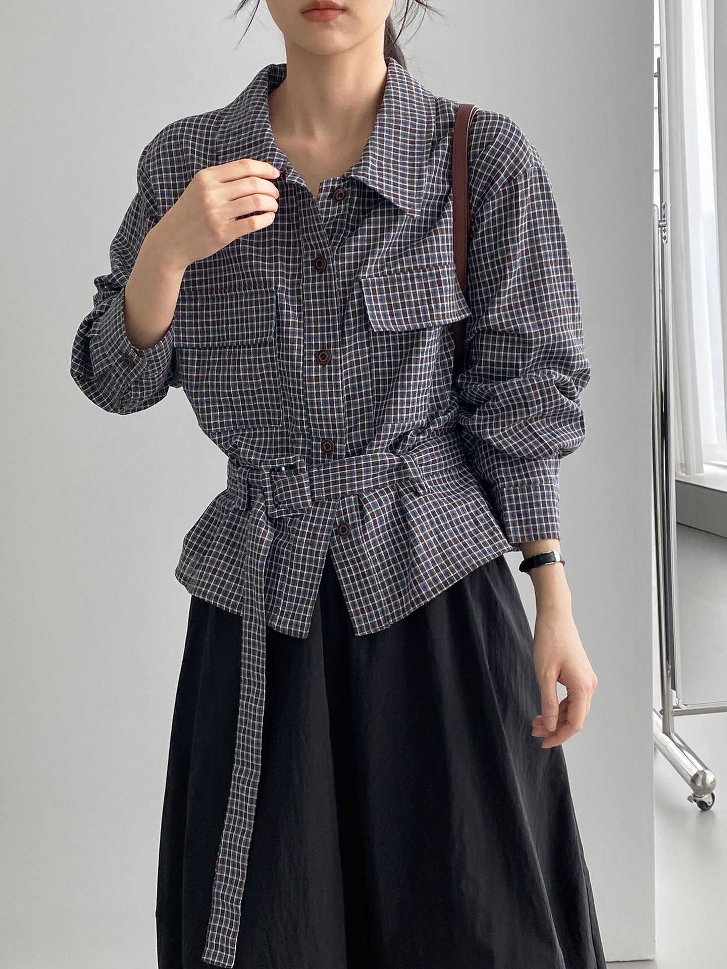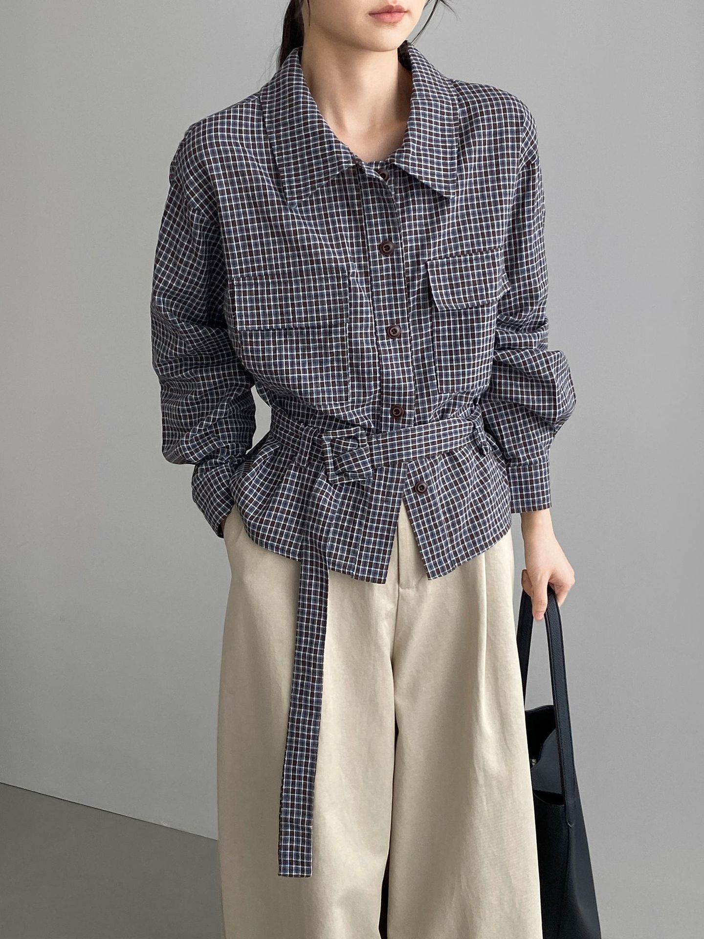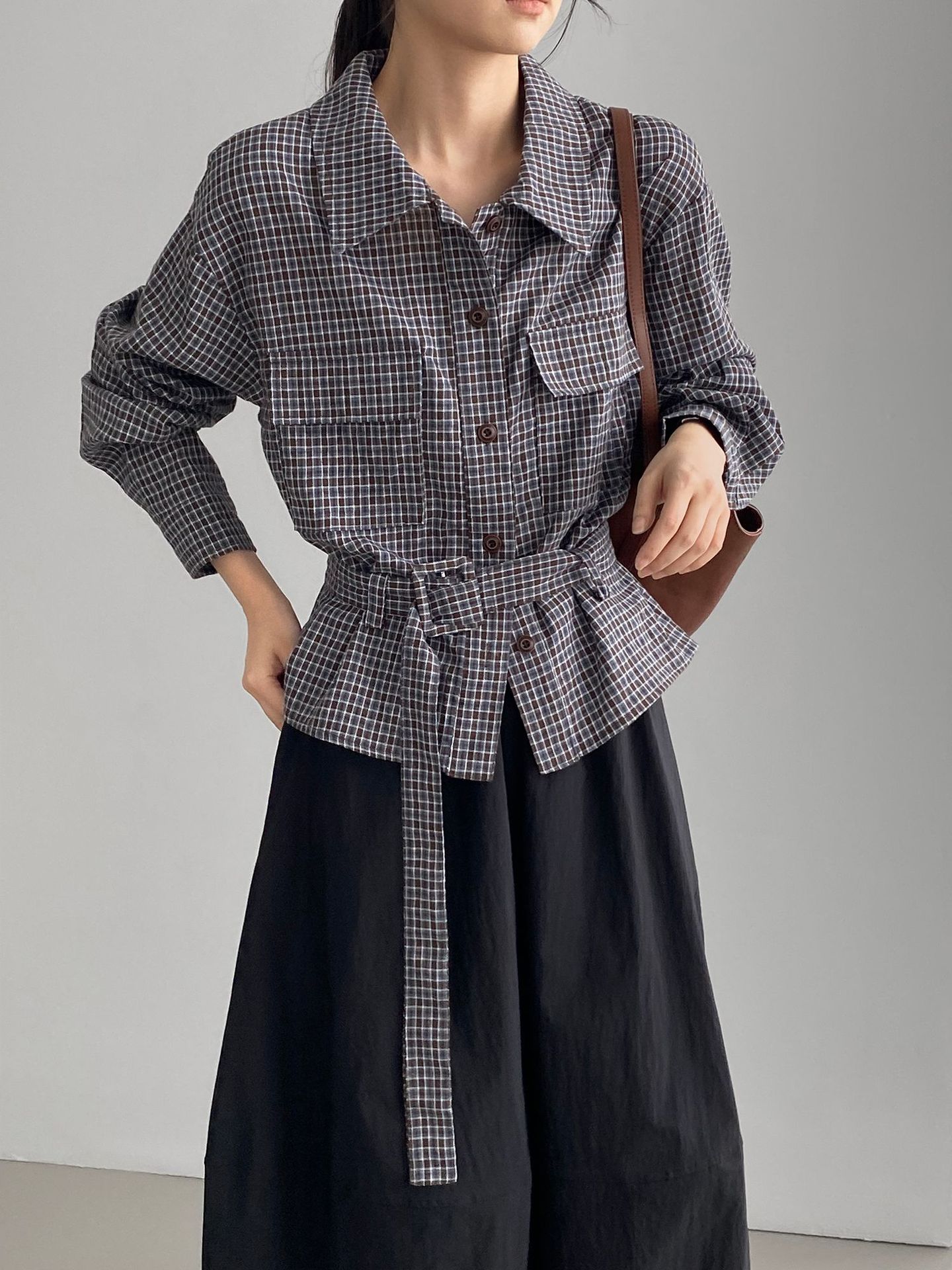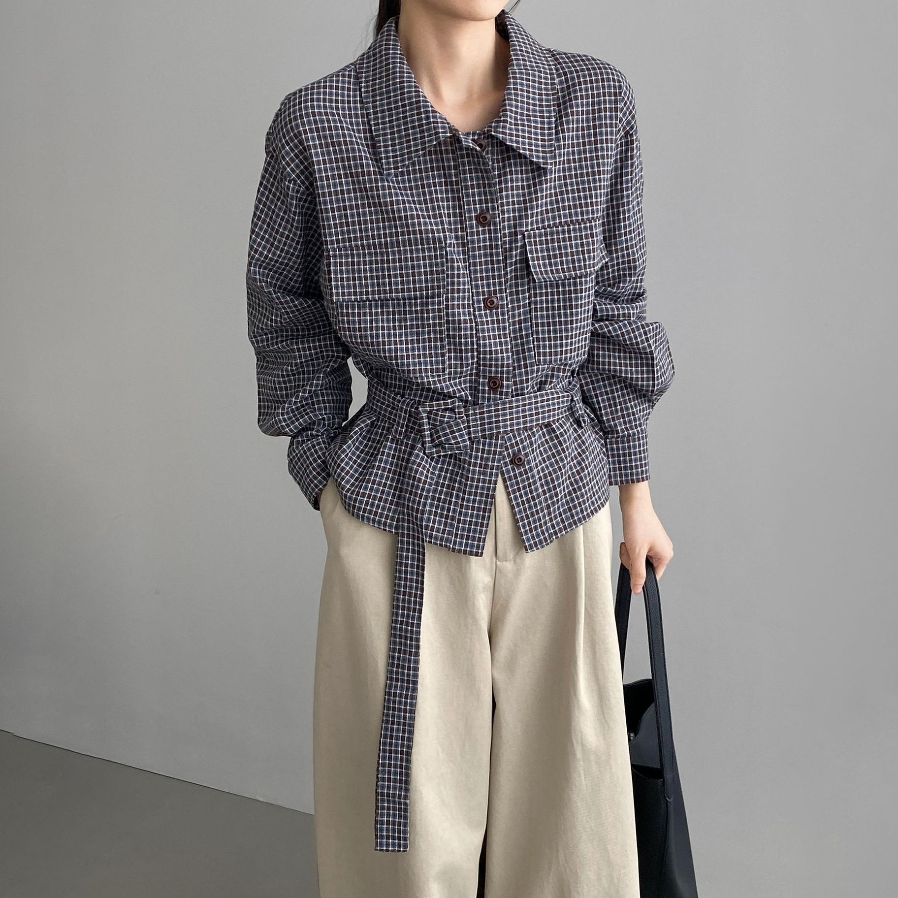 【トップス】韓国風 シンプルギンガムシャツ レディース ベルト付き デザインシャツ 襟付き ウエストマーク 美シルエット 着回しトップス【JZシリーズ】