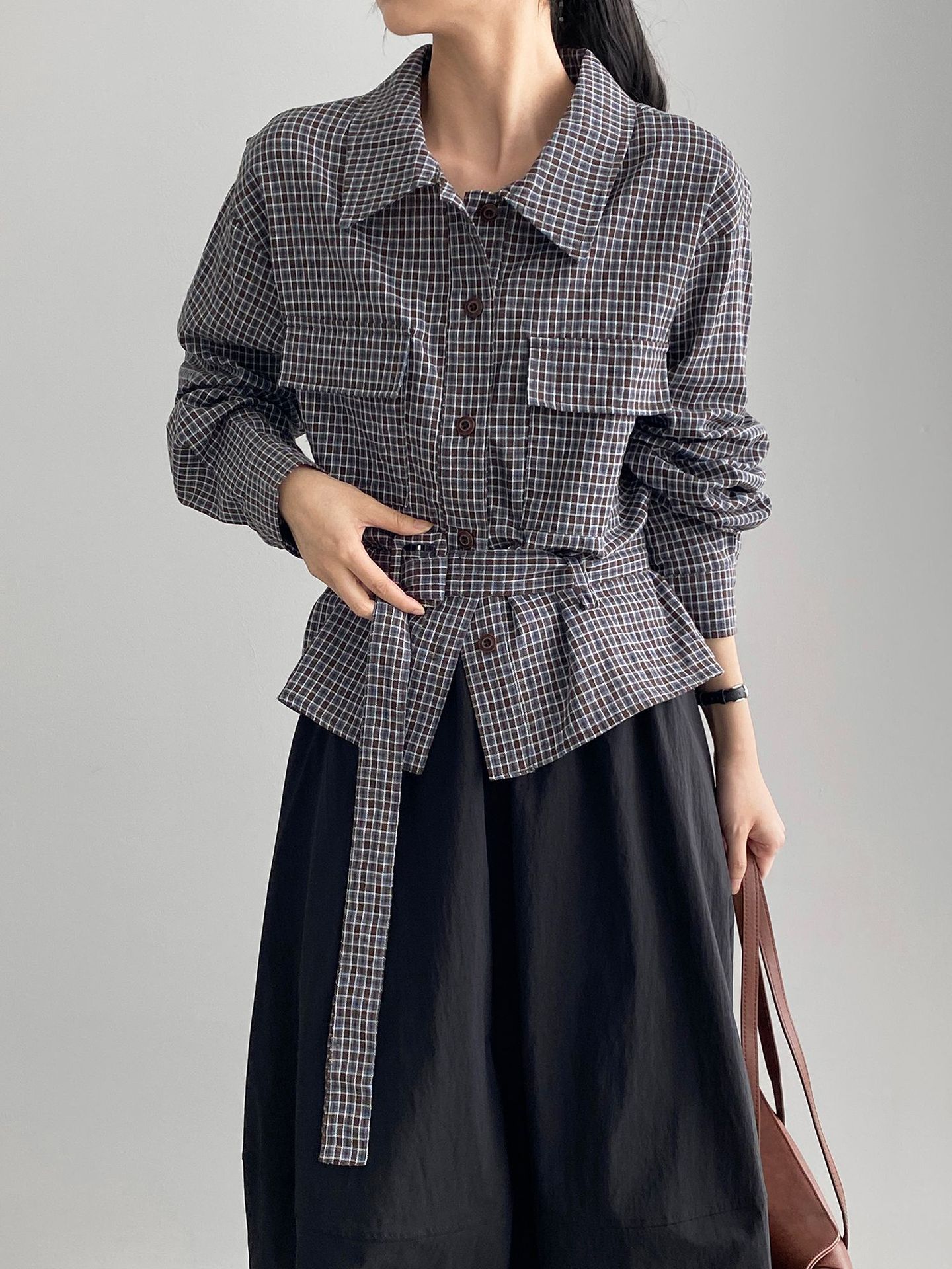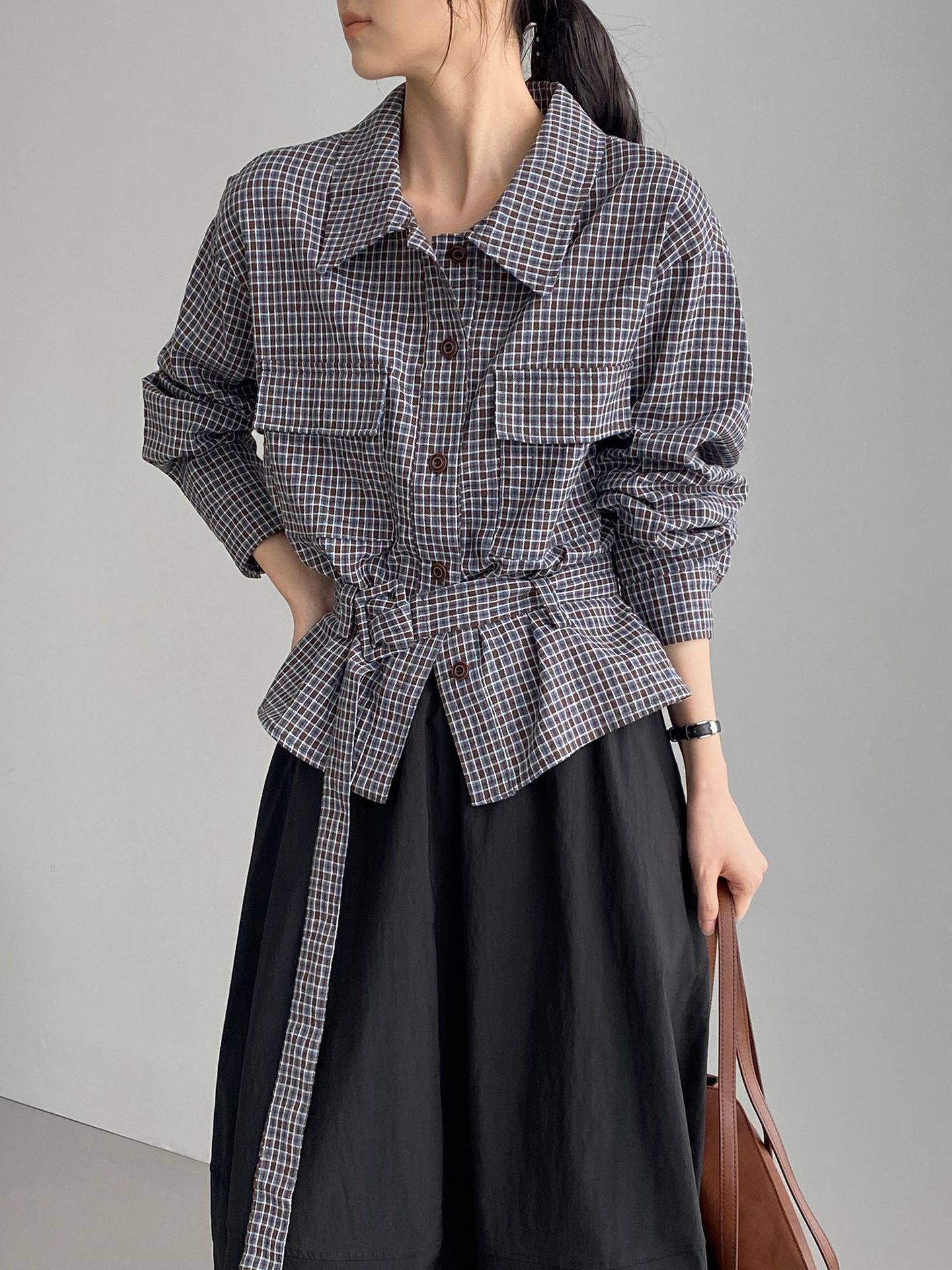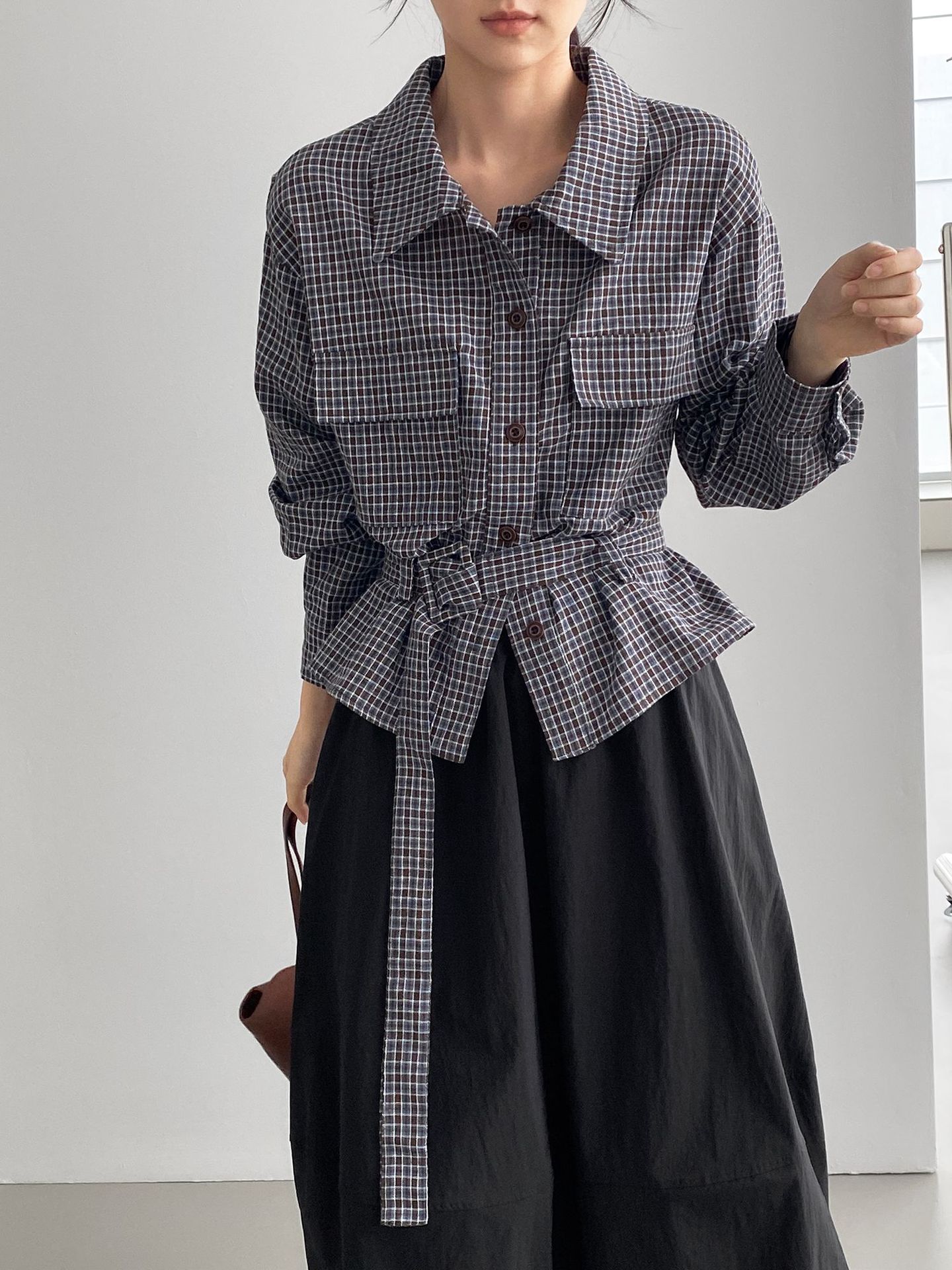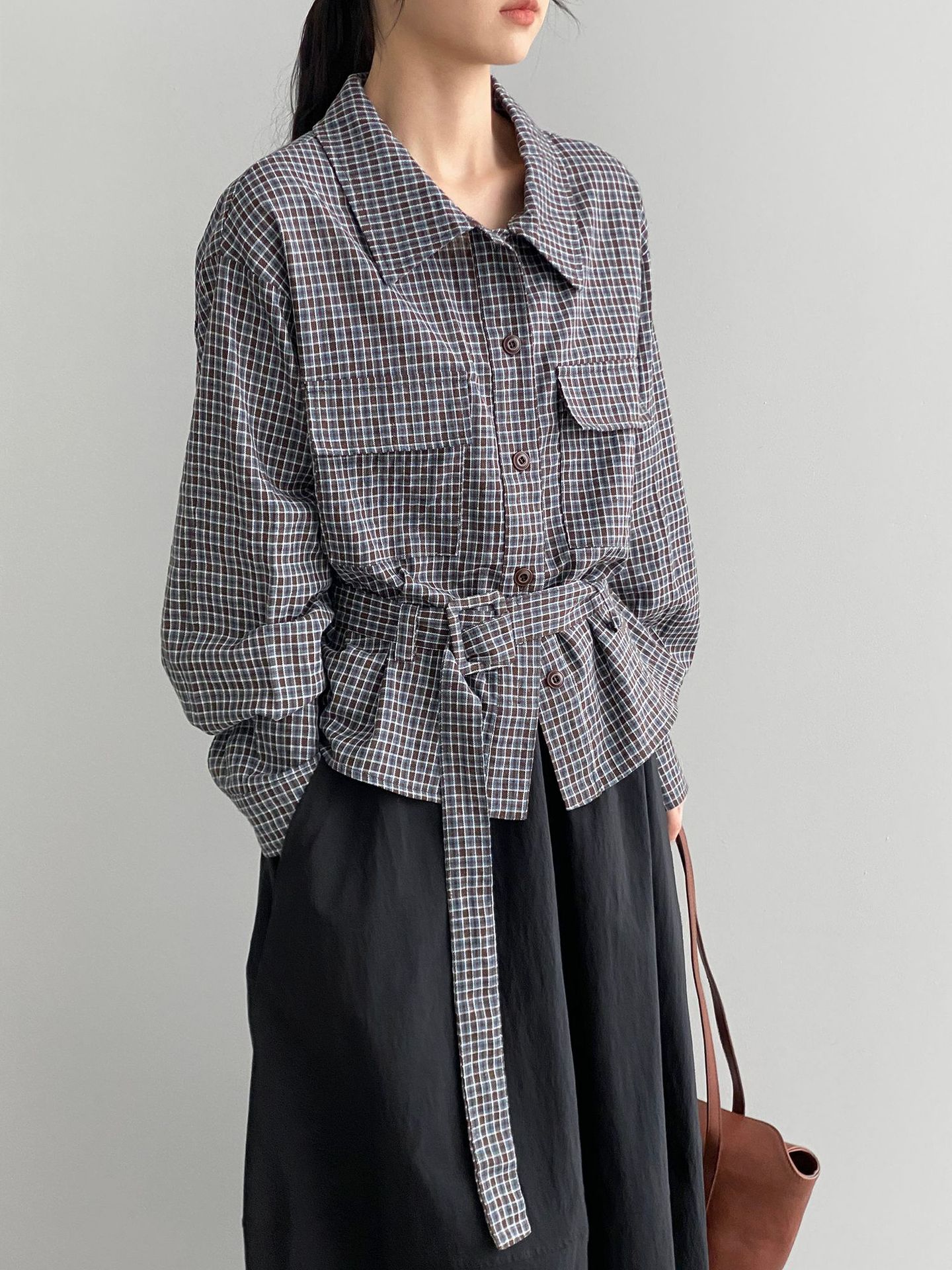 【トップス】韓国風 シンプルギンガムシャツ レディース ベルト付き デザインシャツ 襟付き ウエストマーク 美シルエット 着回しトップス【JZシリーズ】