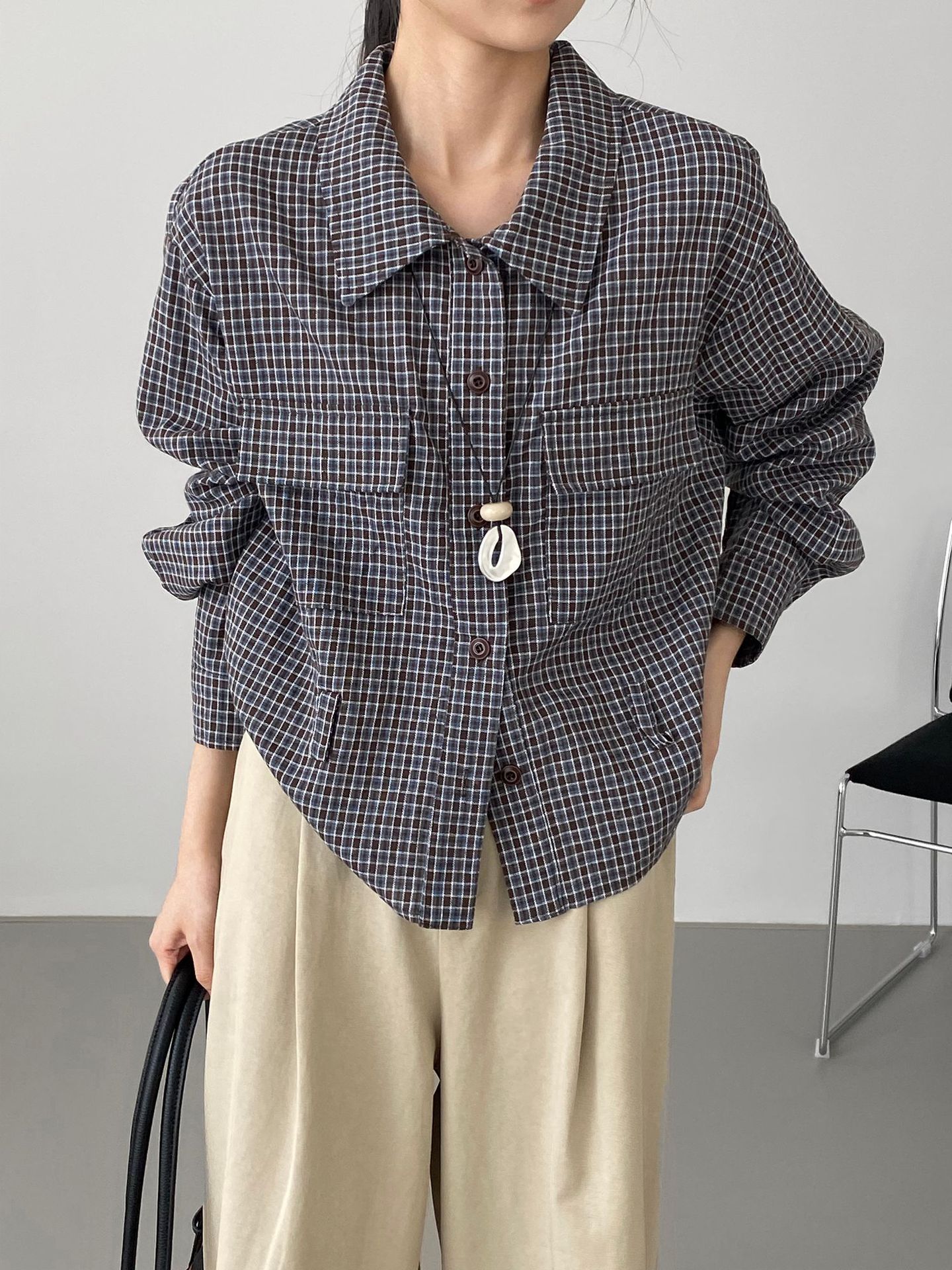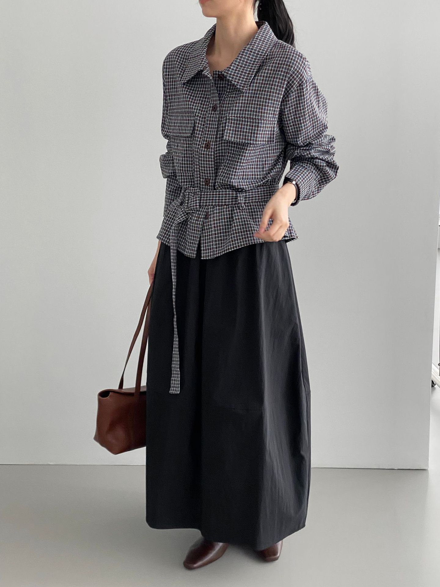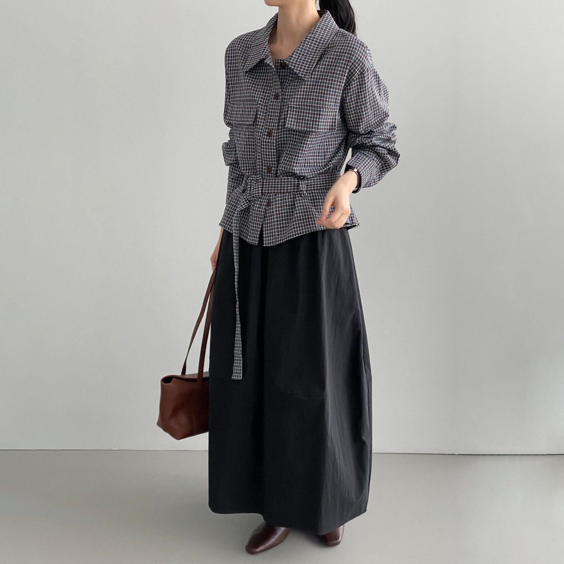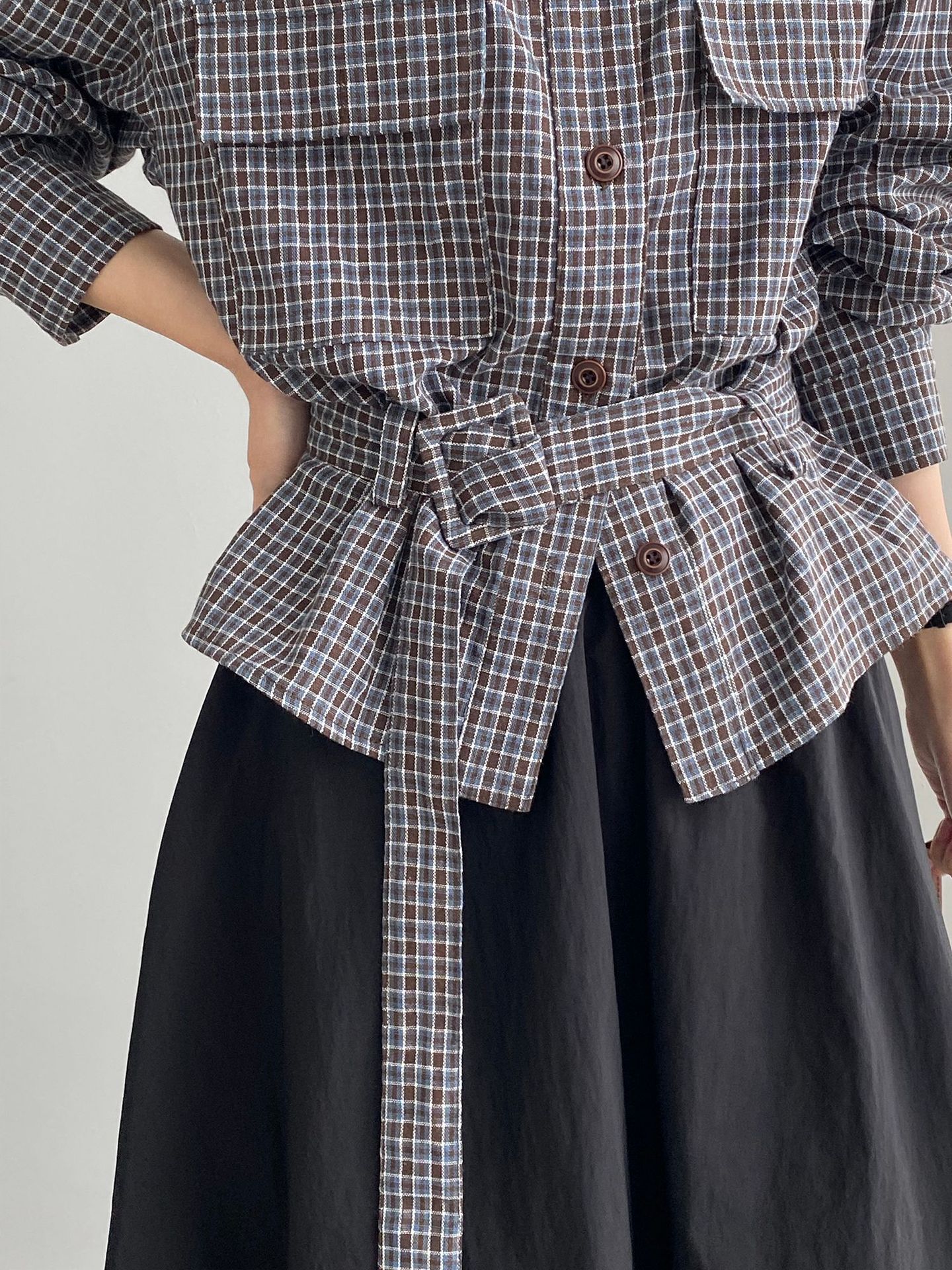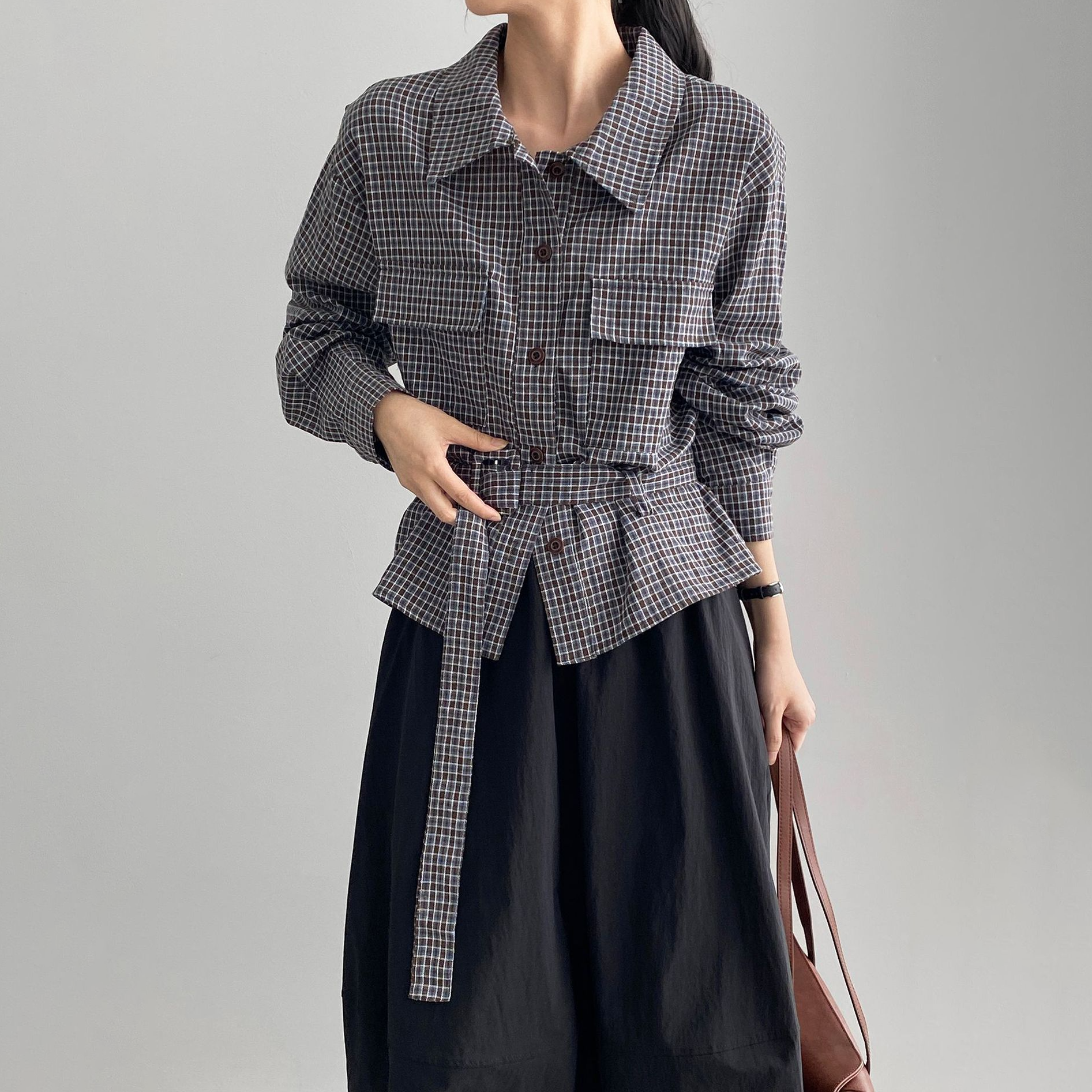 【トップス】韓国風 シンプルギンガムシャツ レディース ベルト付き デザインシャツ 襟付き ウエストマーク 美シルエット 着回しトップス【JZシリーズ】