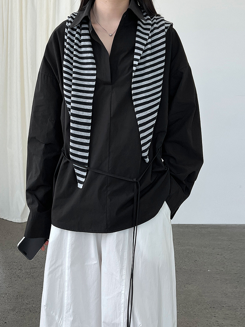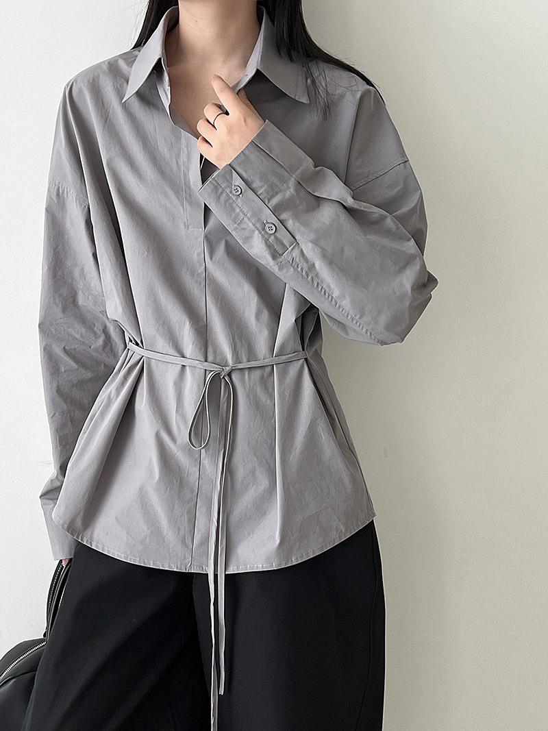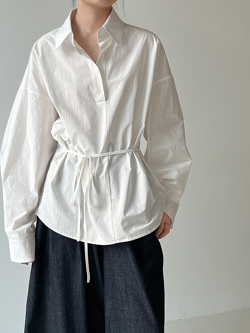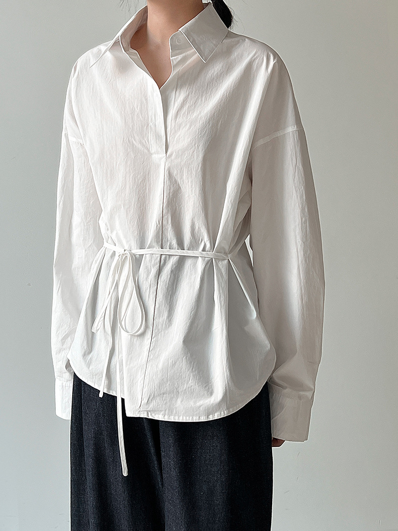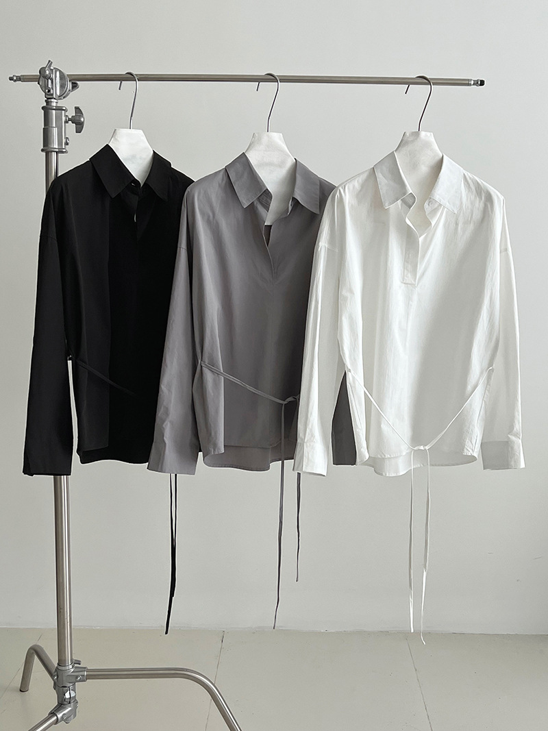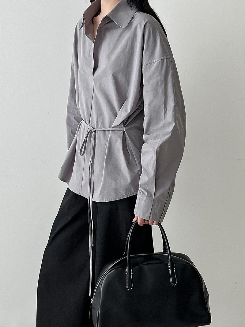 【トップス】韓国風 ポロカラー シャツ レディース 2025秋新作 ウエストリボン 美シルエット レトロブラウス【SNシリーズ】