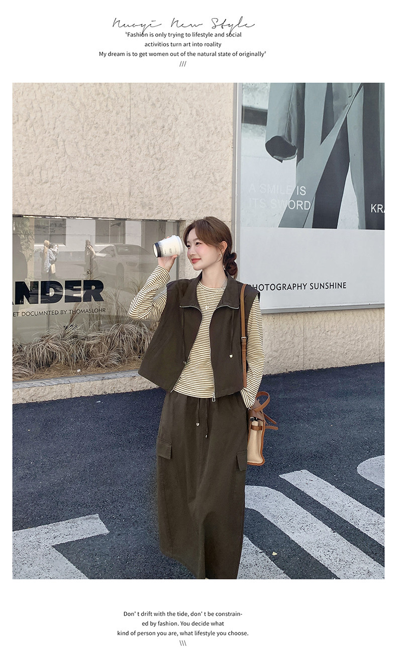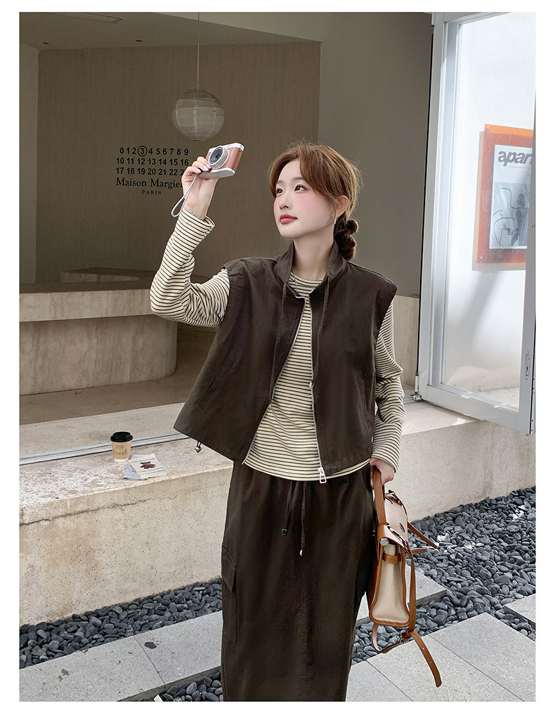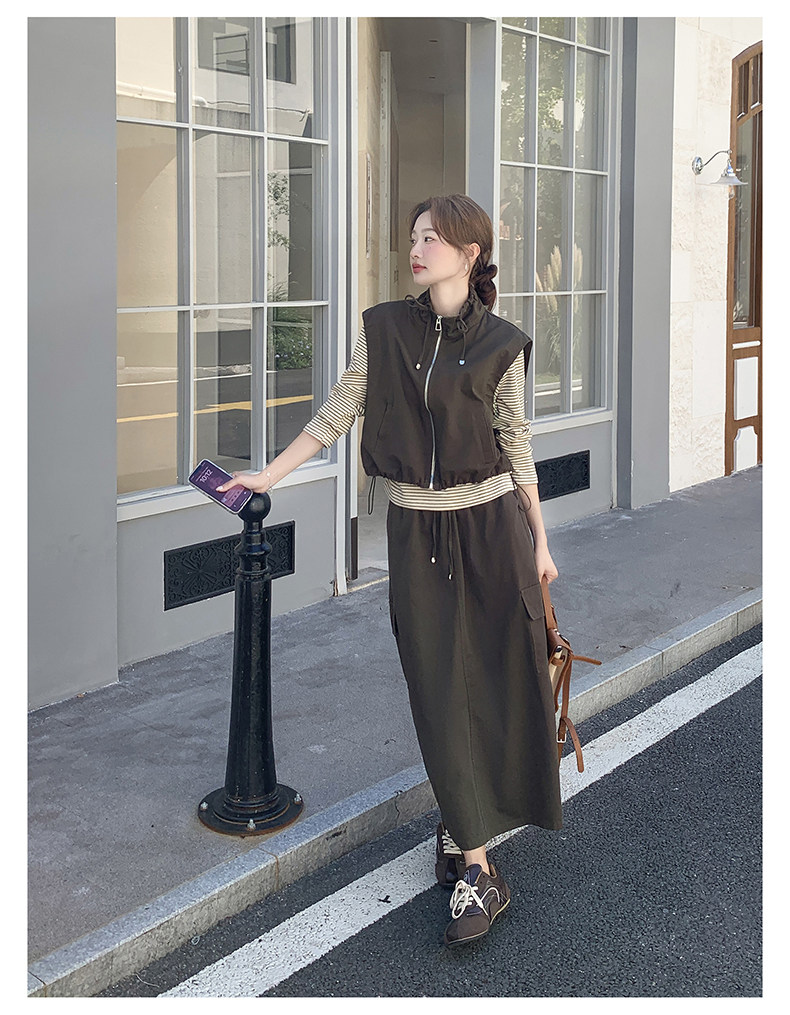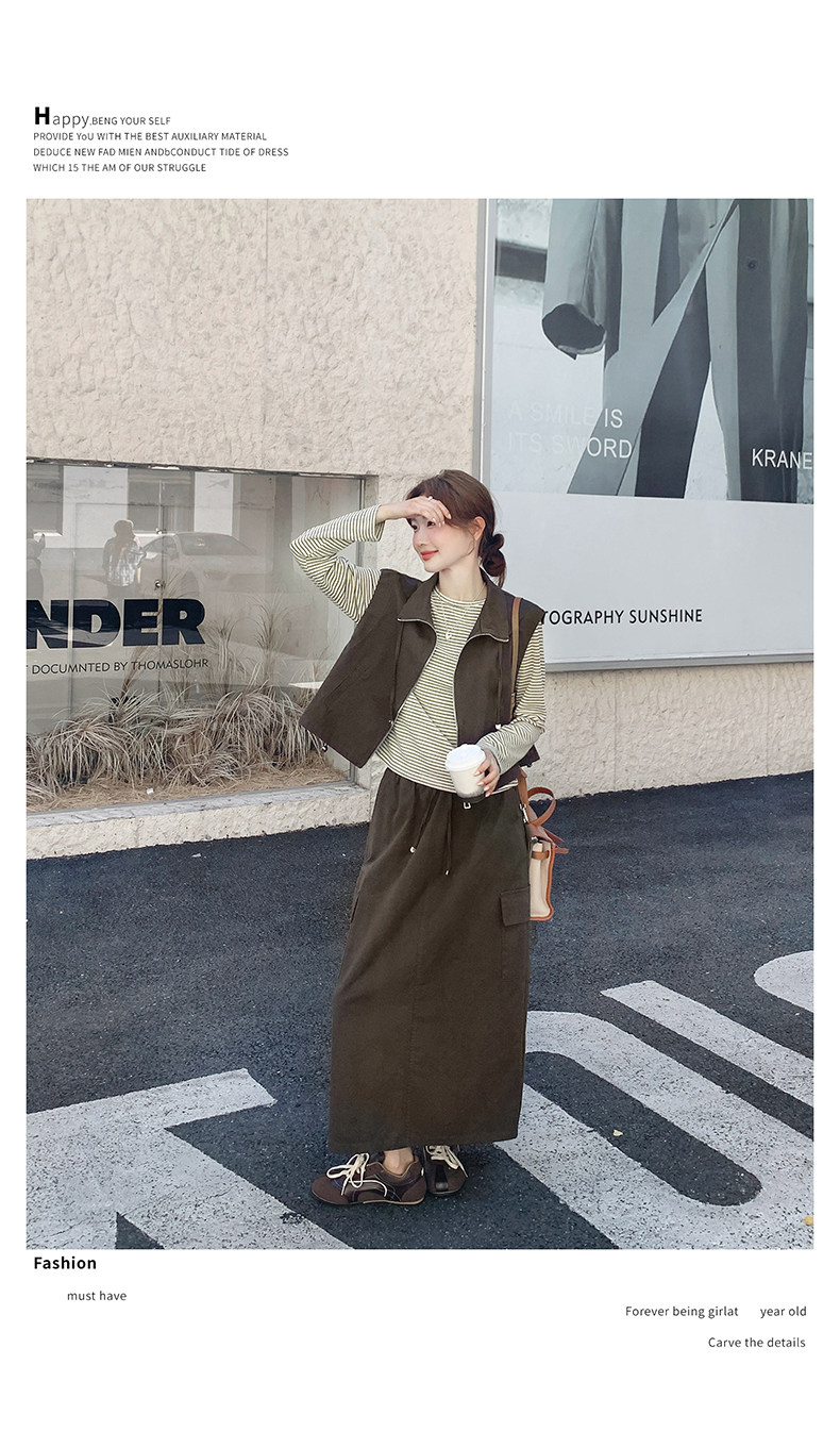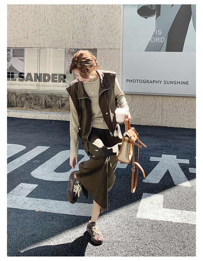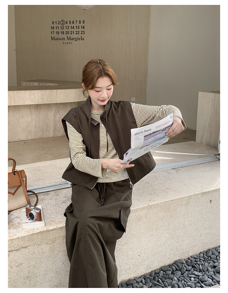 【商品名】3点セット!【セットアップ】マラード風 ベスト+ストライプタイトスカート+ロンT 上下セット レディース【JZシリーズ】