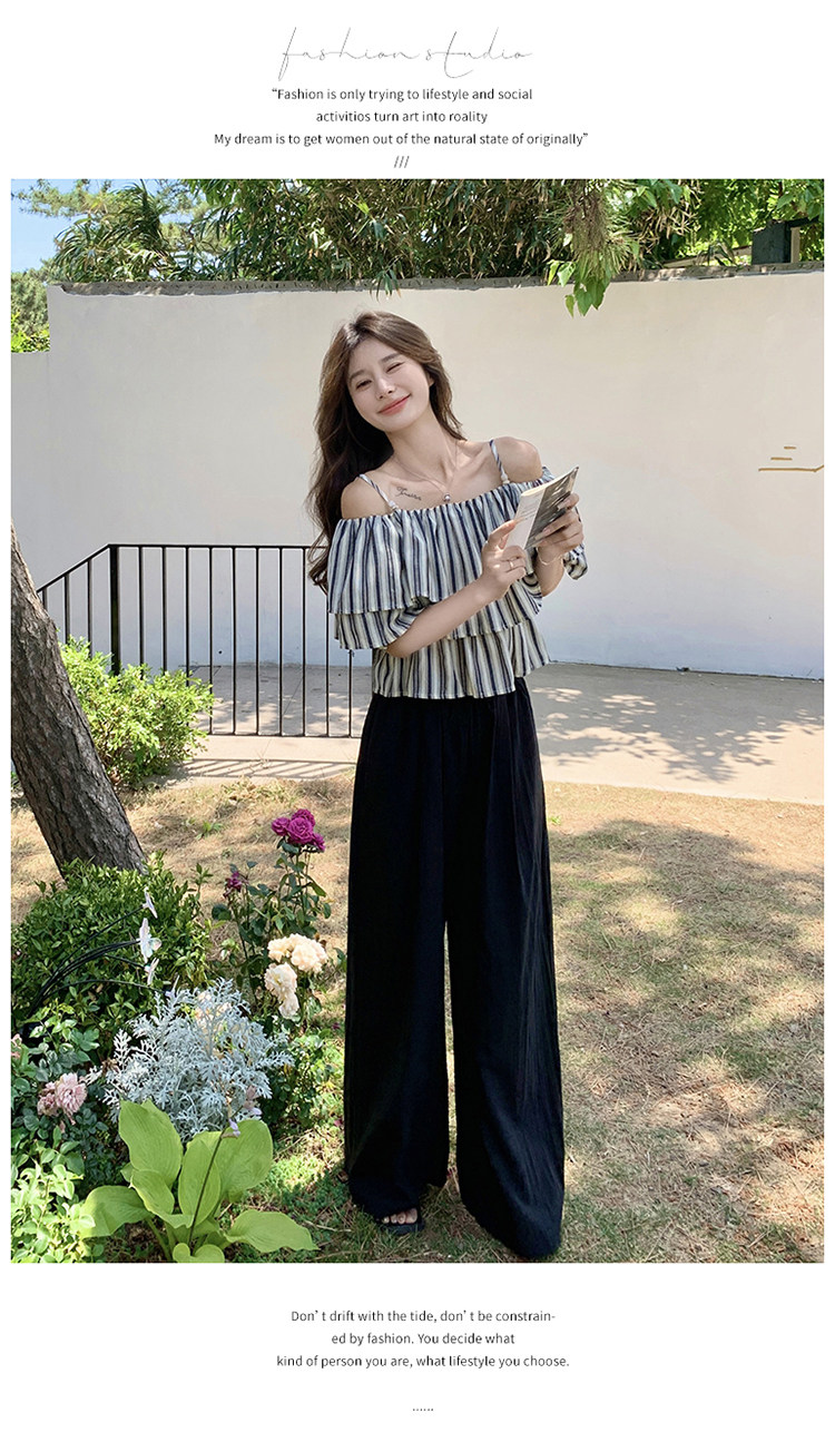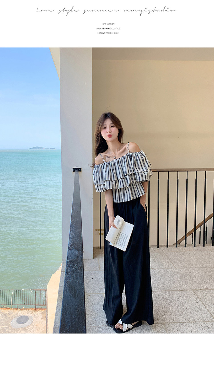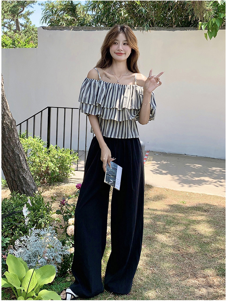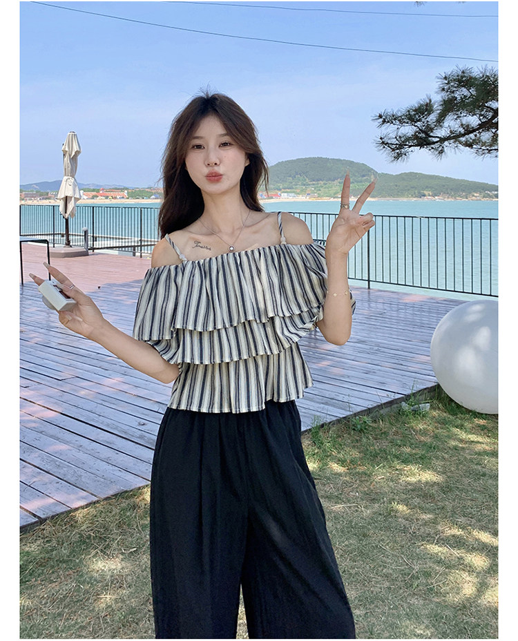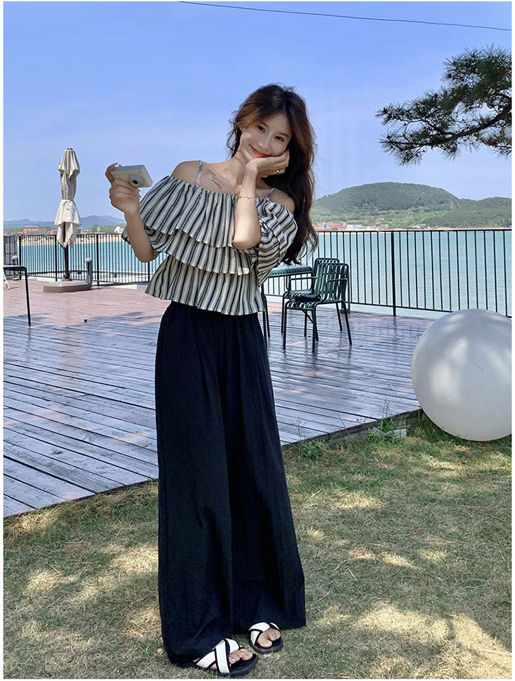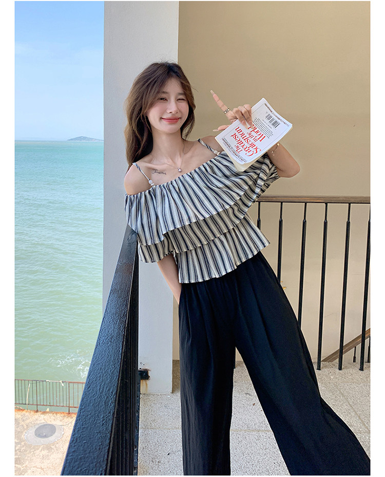 2点セット!【セットアップ】フリル付き ストライプ オフショルダーシャツ+ワイドパンツ 上下セット 夏【JZシリーズ】