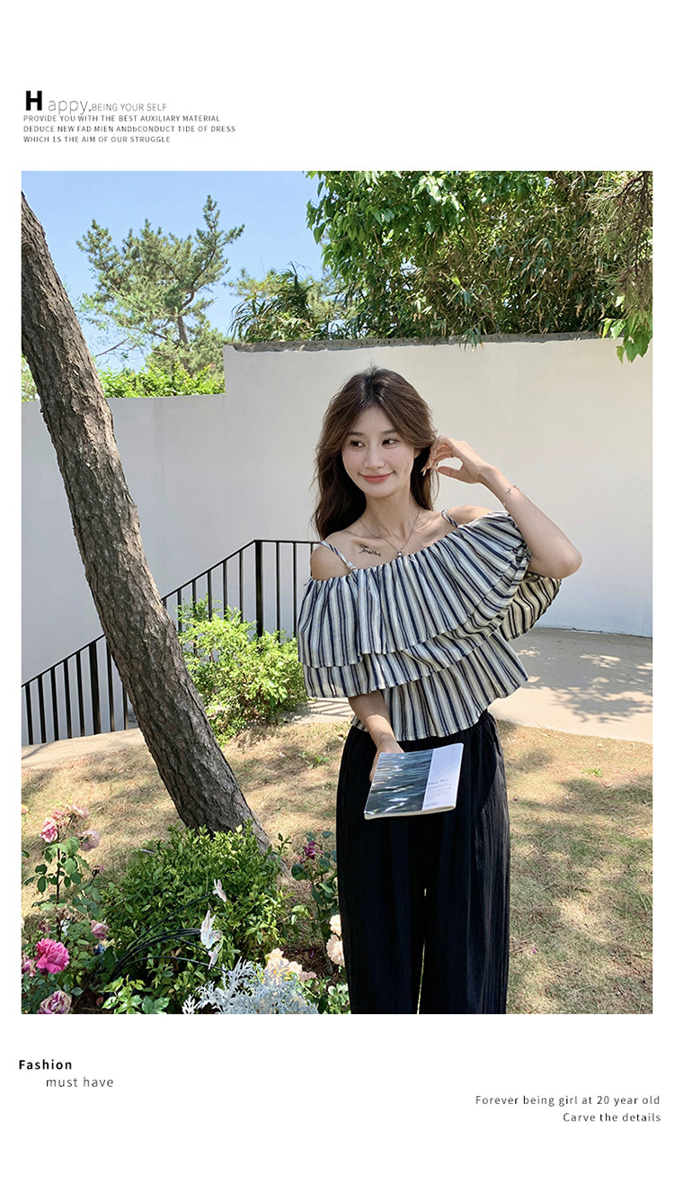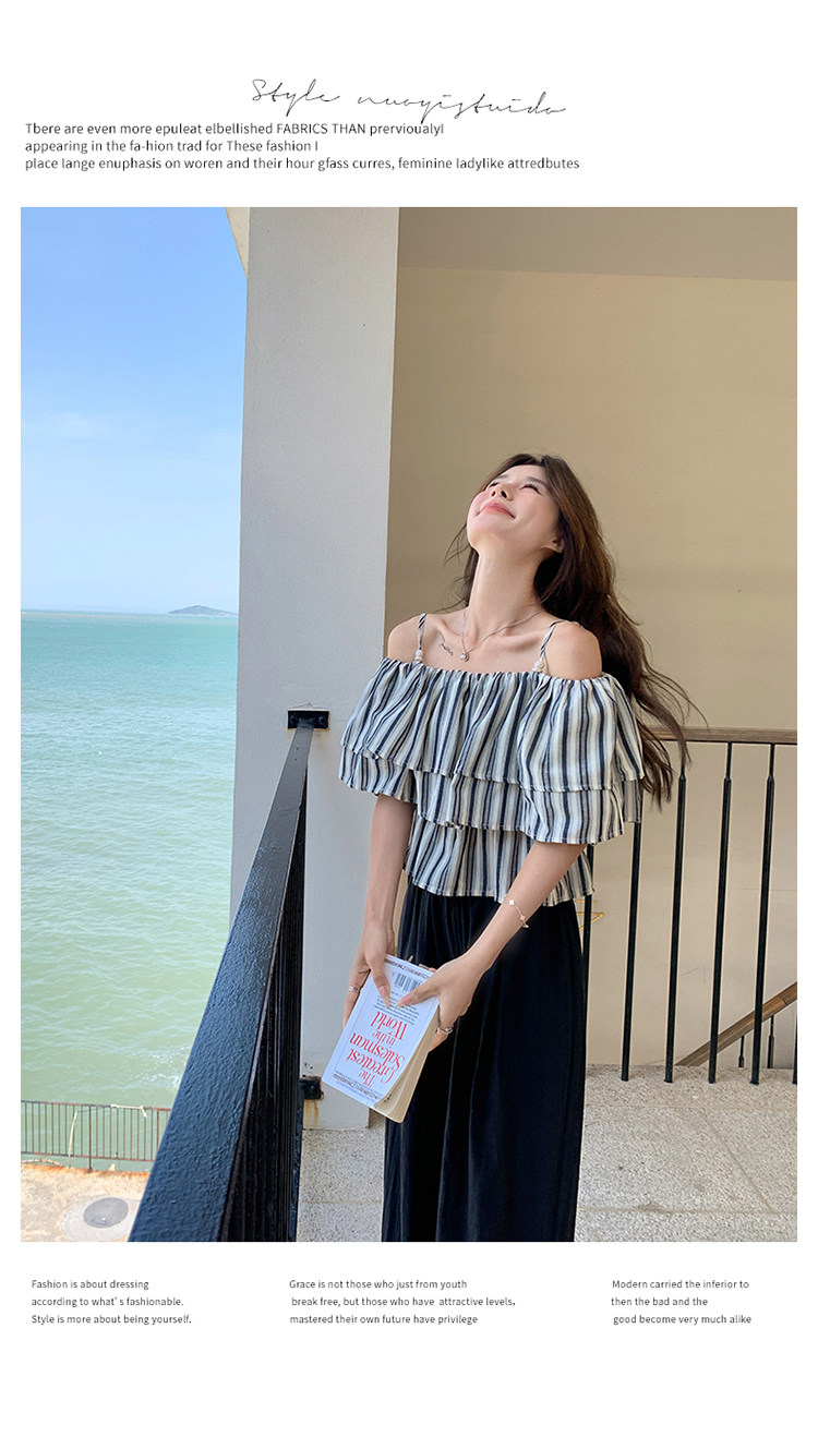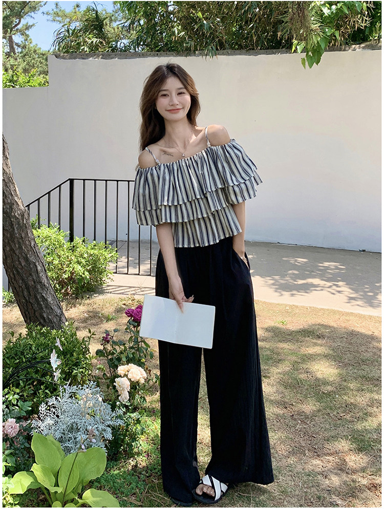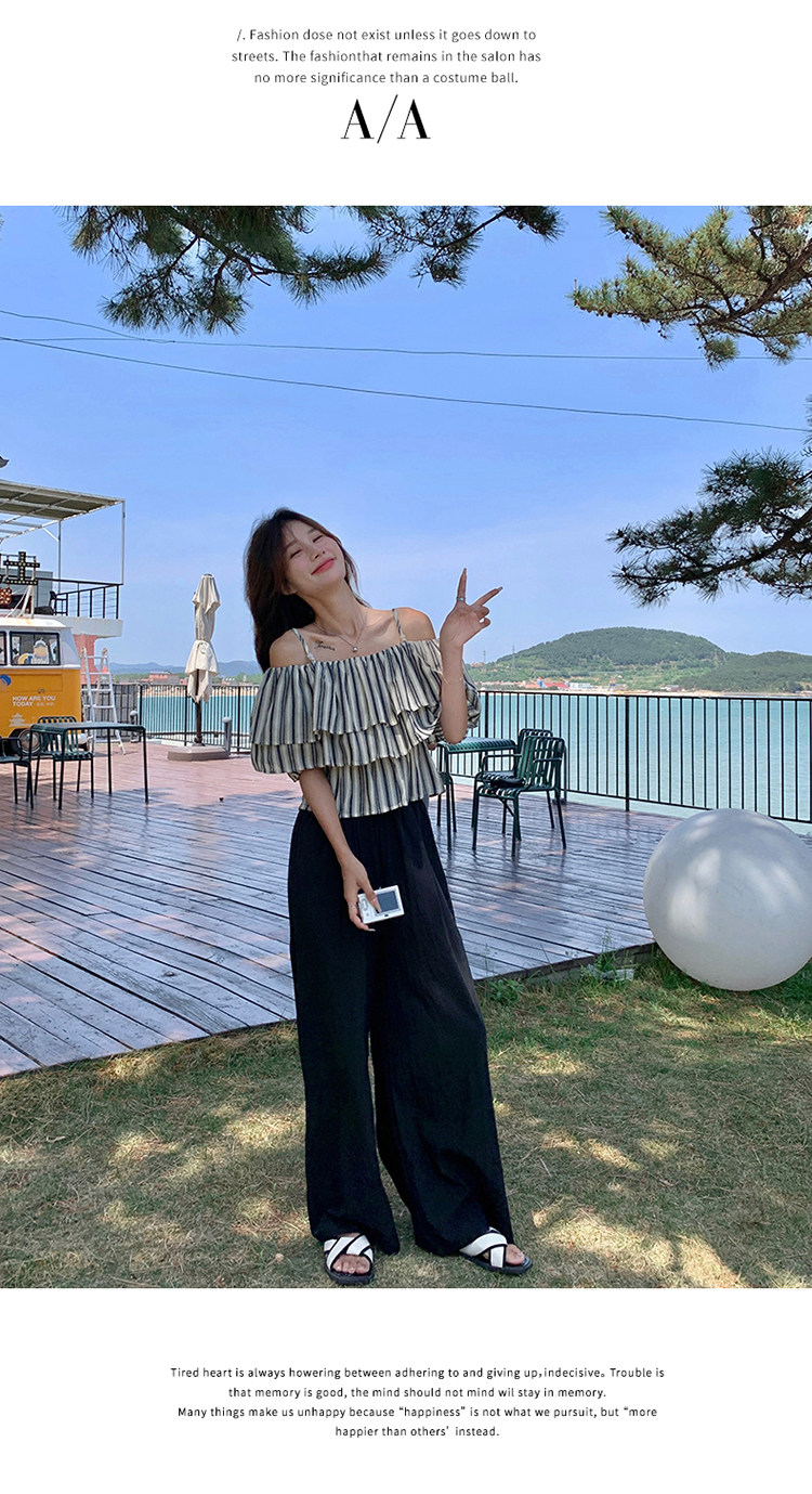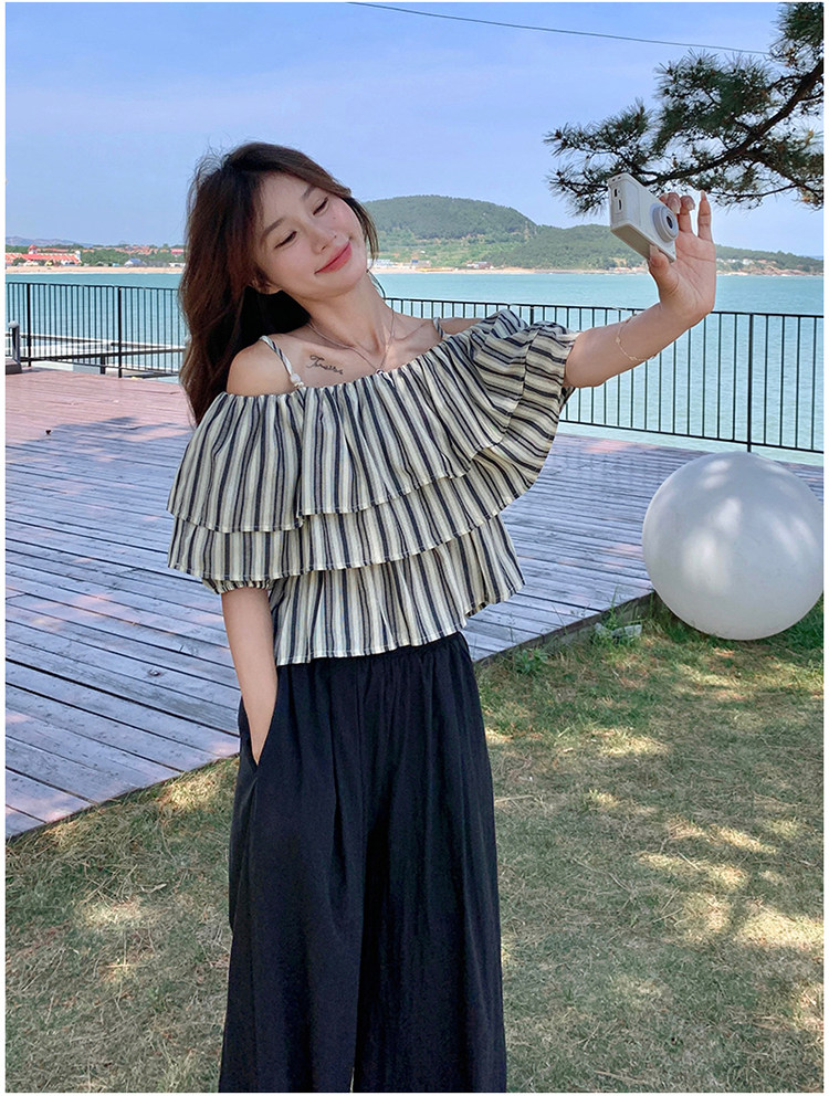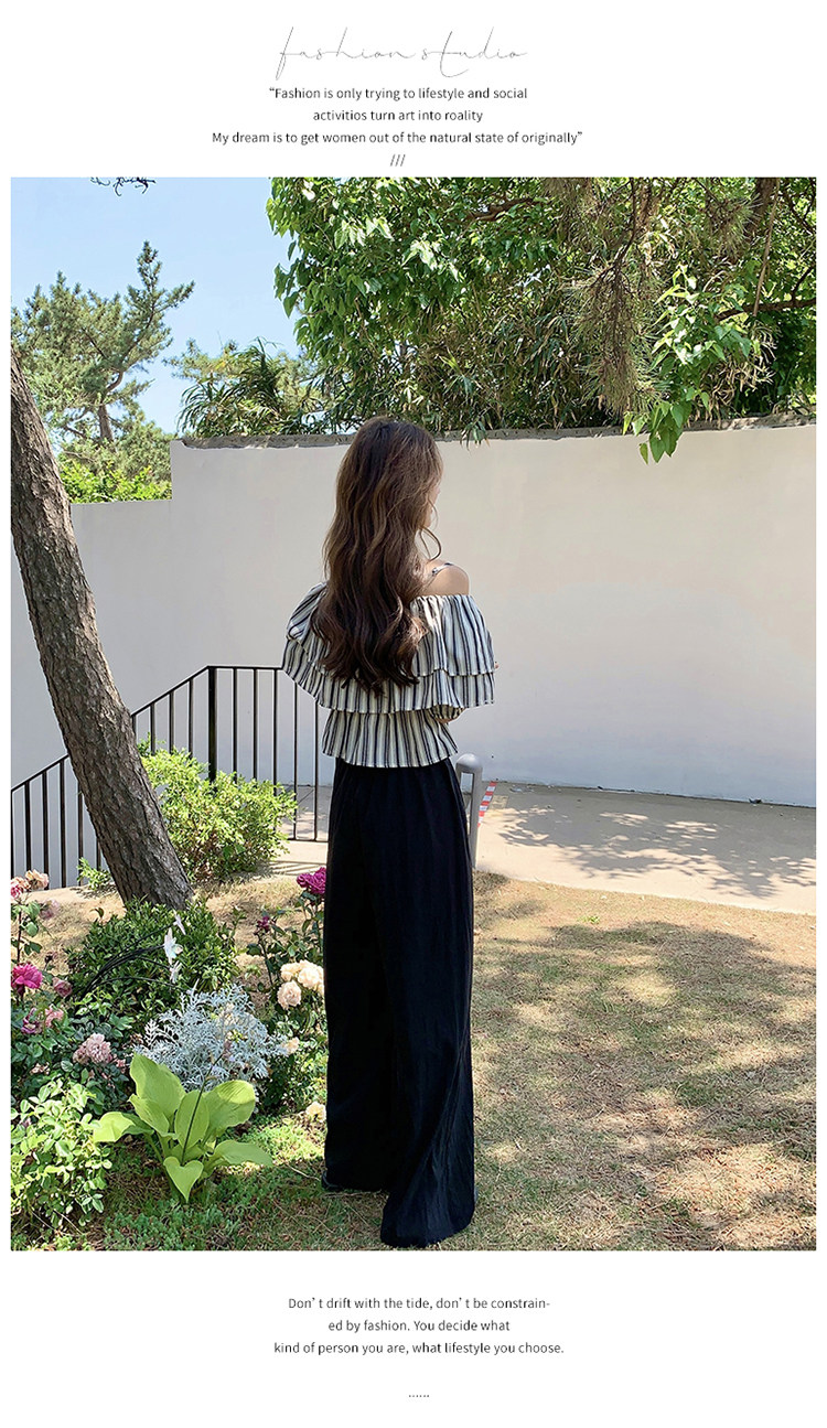 2点セット!【セットアップ】フリル付き ストライプ オフショルダーシャツ+ワイドパンツ 上下セット 夏【JZシリーズ】